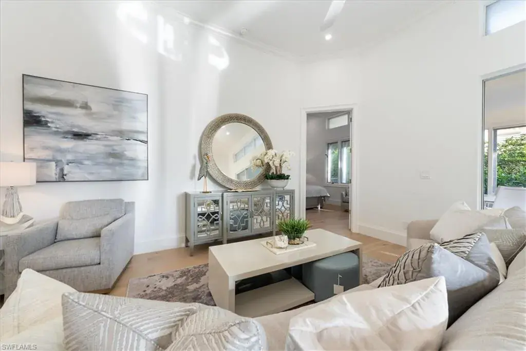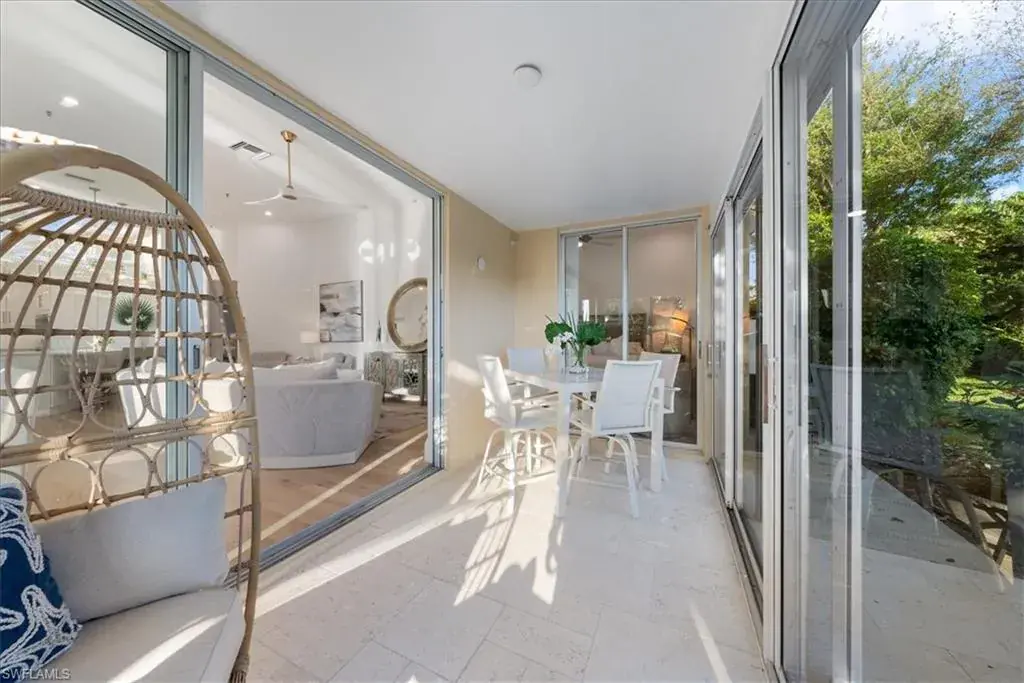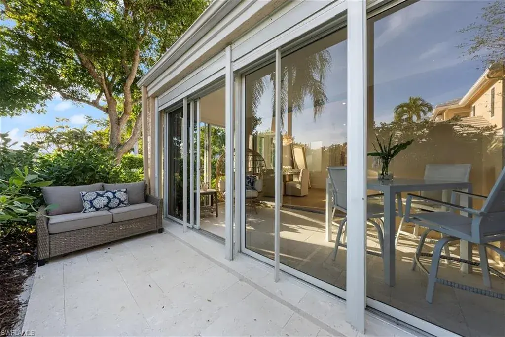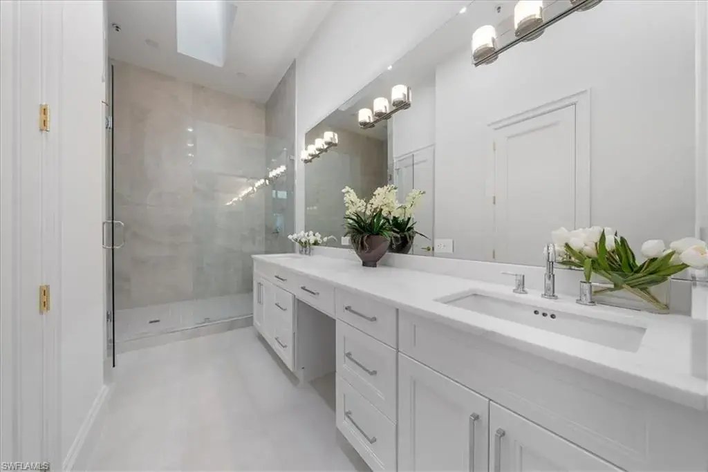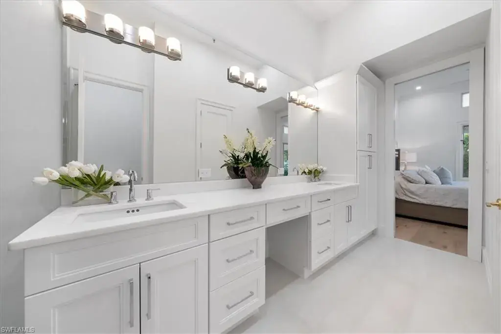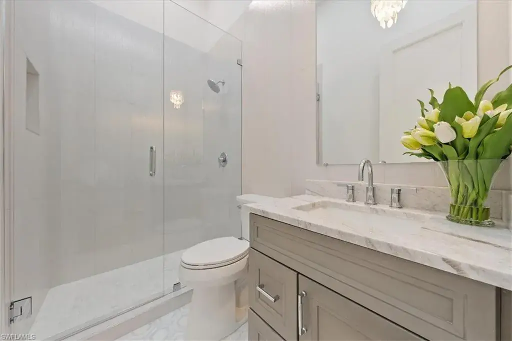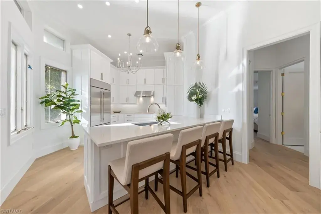 FULLY RENOVATED Single-Story Villa – NO STAIRS!! LuxRe Construction has done it again in the heart of Park Shore off Belair Ln, this end unit attached villa has a newly designed wide open floor plan with high end appliances and finishes, 2 bedrooms, 2 baths, and a 2 car garage. With high vaulted ceilings, 8’ solid core doors, engineered hardwood throughout, fully built out closets with 2 in the primary suite and an oversized guest, Subzero fridge, Wolf Induction Cooktop, Wolf oven and convection oven, and gorgeous Cambria Quartz and Mystery White Marble tops. All of the work has been done for you to move right in! Enter through your own side yard with additional guest parking to this end unit with tons of windows and natural light flowing in. Walk out to your private covered lanai with sliding glass doors to close whenever it is too hot outside, or walk out to your extended patio created with a privacy clusia hedge for uncovered outdoor living space you rarely find in a villa. This development just painted the Villas a beautiful white for a fresh and beautiful new and improved look! This villa is located steps from the Venetian Village Dining And Shops, Community Pool, and Park Shore Private Beach club you can join for a small fee by owning a home in Park Shore. With a location like this you typically have to give up garage space, finishes, ceiling height, or have to go upstairs. This unit has everything you have been searching for and more!