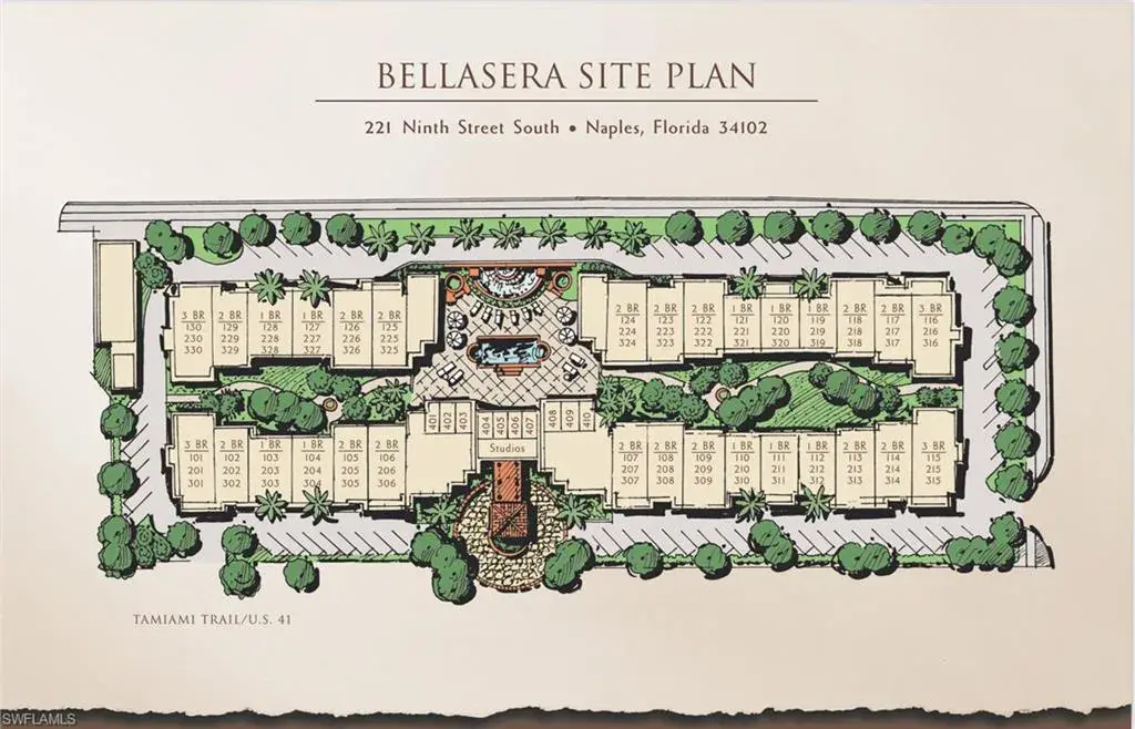 Where can you get a 3 bedroom turnkey furnished condo in the sought out Olde Naples vacation destination with resort style amenities and an onsite management company for this price!!!??? Bellasera Resort is where! This 1st floor 3 bedroom 2 bathroom coastal updated condo is located in downtown Old Naples, just two blocks north of Fifth Avenue. Bellasera is a boutique-style condo hotel that offers resort style amenities, including two popular downtown restaurants. Unlike most condos at Bellasera, this condo has no carpeting (all carpeting has been replaced with wood-like luxury vinyl flooring and the kitchen and baths have tile flooring. Freshly updated and being sold turnkey furnished for your convenience. As an owner, (not in the on-site rental program) you may occupy your unit up to 150 days per year and you can rent it out 12x a year with a 30 day minimum. If you opt to participate in the on-site rental program, Bellasera will rent it on your behalf with a 1 night minimum and a revenue share. This first floor end unit condo enjoys privacy, yet proximity to the concierge services, shuttle, Claw Bar and London Club restaurants, pool, spa, exercise facility and more. Walk out your back door to the pool and courtyard or out your front door to neighborhood restaurants (like Warren Naples). Your private screened in lanai, overlooks the beautifully landscaped courtyard area. This condo is walking distance to the beautiful Baker Park, Greenway walking trails, Gulfshore Playhouse, as well as Fifth Avenue’s world renown shopping, dining and entertainment. This entire area has exploded with dining and activites. Bellasera owners and guests enjoy a shuttle service to the white sand beaches and downtown locations to enjoy dining, shopping, fun in the sun and water as well as the picturesque Naples sunsets. If interested in the rental program, please inquire with Listing Agent for details.