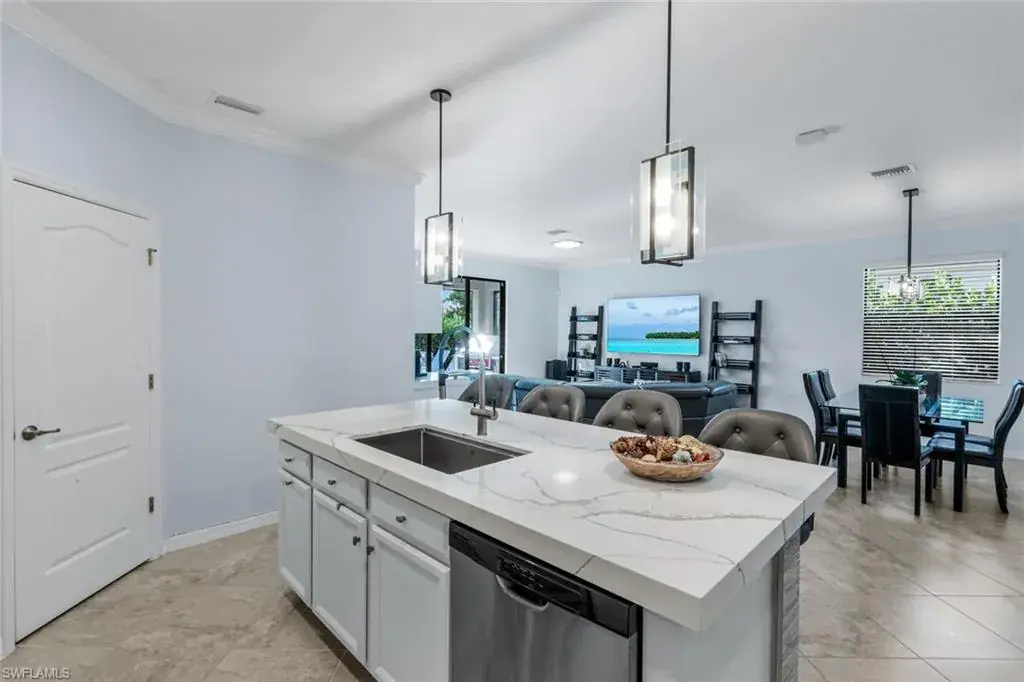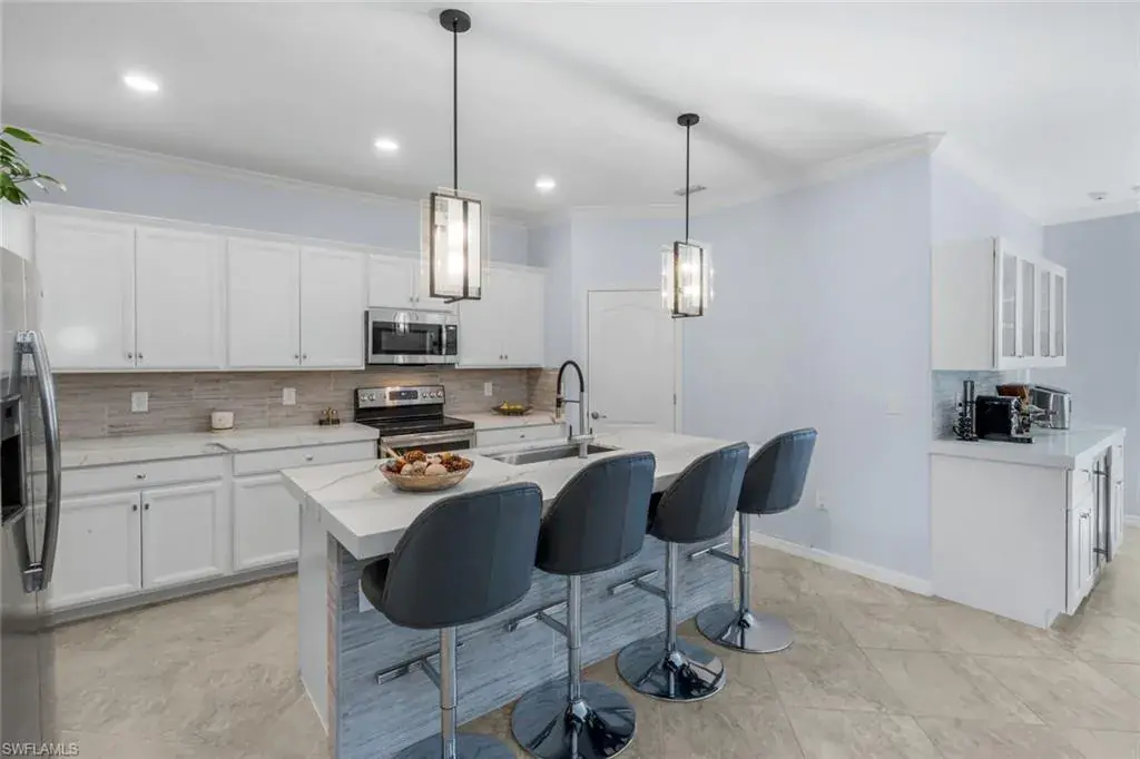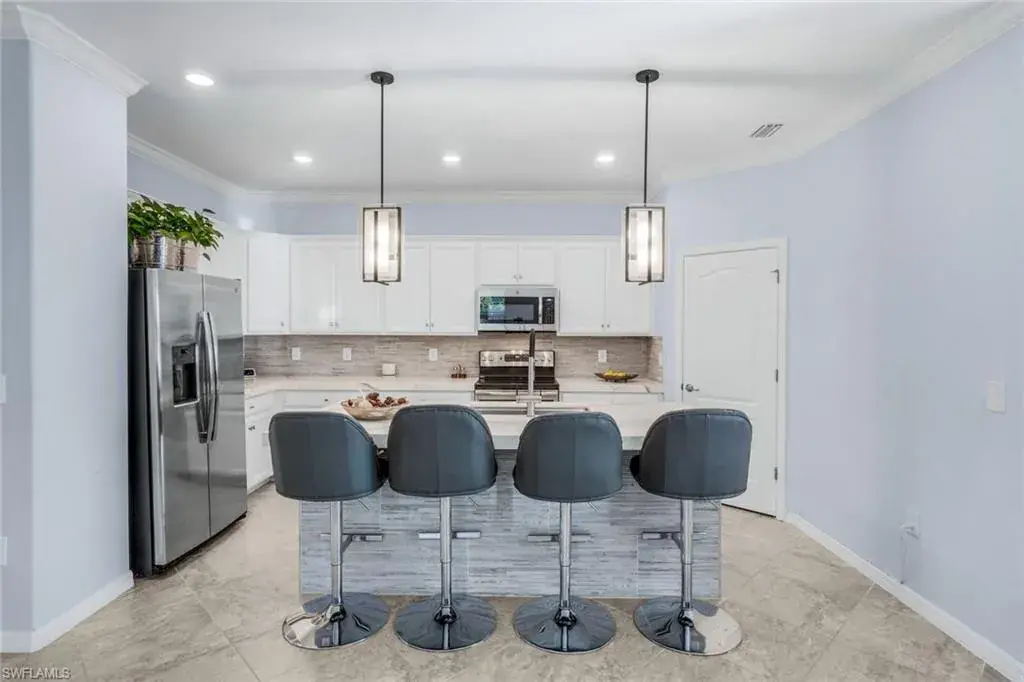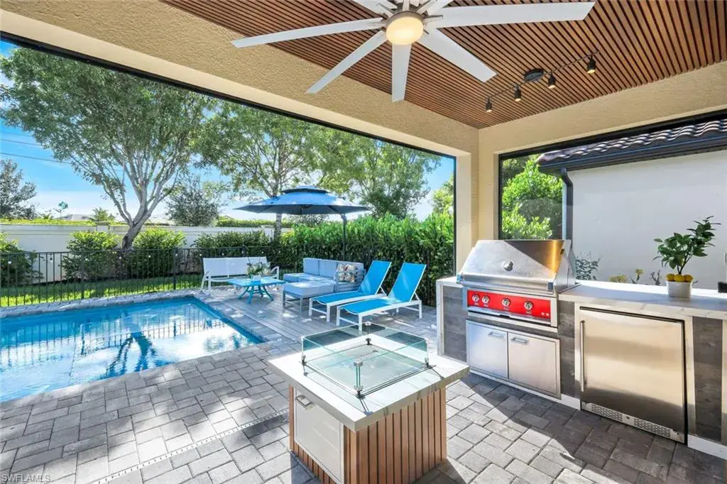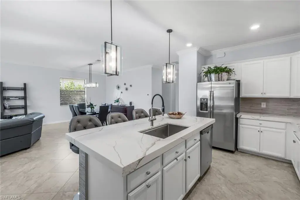 Welcome to Your Naples Oasis! This stunning 3-bedroom, 3-bathroom home with a 2-car garage and extended driveway offers the Naples lifestyle you’ve been dreaming of. Featuring soaring ceilings, an open floor plan, and a large lanai with a private pool, spa, and outdoor kitchen, this residence is perfect for both relaxation and entertaining. Inside, the sleek kitchen showcases white cabinetry, quartz countertops, a stylish backsplash, a massive island with seating for four, stainless steel appliances with hood, and a spacious walk-in pantry. The open kitchen, living, and dining areas flow seamlessly together under a detailed tray ceiling, with windows and sliders filling the home with natural light and views of the pool and lanai.