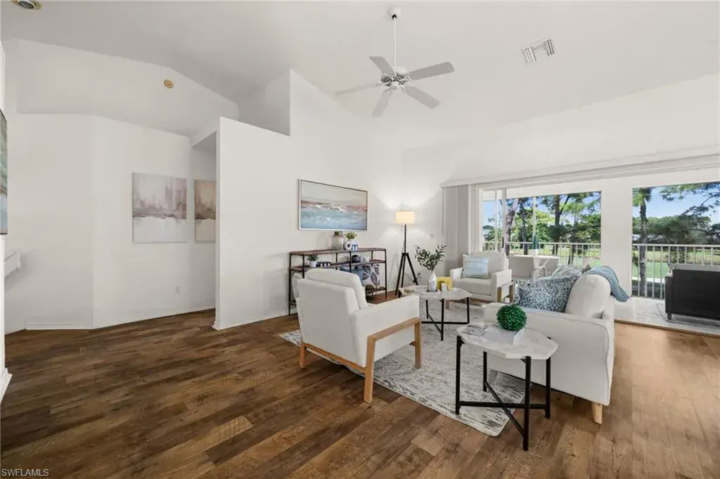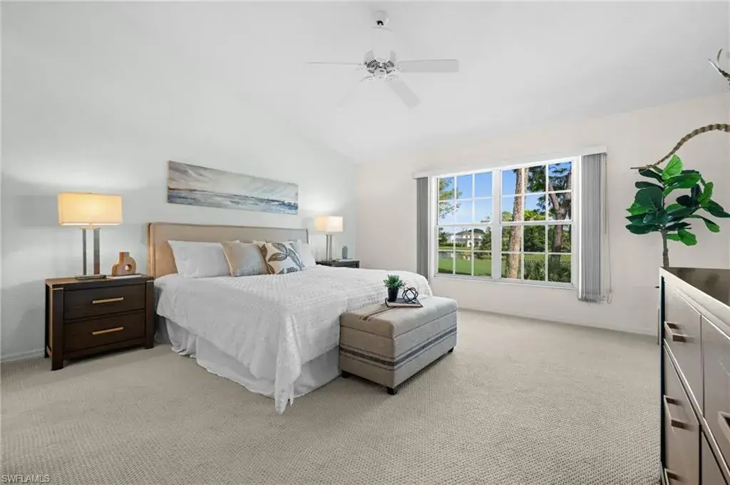 One of the largest floor plans in the community and rarely available end unit that offers the kind of space and natural light you don’t often find and an attached garage, which is such a bonus for condo living. Located on the second floor, this condo features soaring vaulted ceilings and an open-concept layout that flows beautifully out to an oversized balcony with peaceful lake and gorgeous golf course views. A neutral palette throughout offers easy customization. Bermuda Greens is a warm, welcoming neighborhood within Imperial Golf Estates, where owners tend to stay for years. This well-maintained community, surrounded by lakes and lush greenery, promotes an active lifestyle with a variety of resident events and amenities including a pool/spa and bocce court. Located in an ideal North Naples area, this property offers easy access to pristine beaches, shopping, and dining offering the perfect setting for both relaxation and leisure.