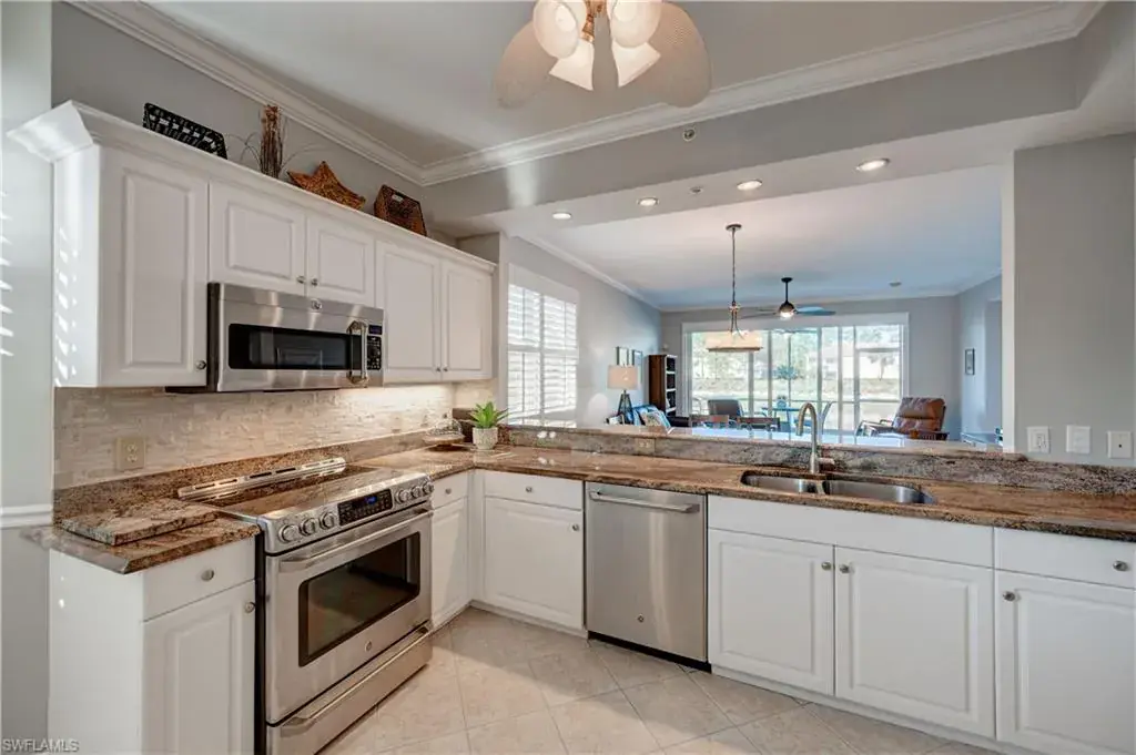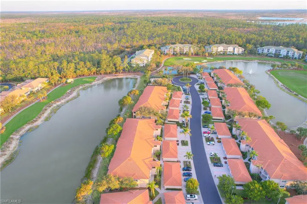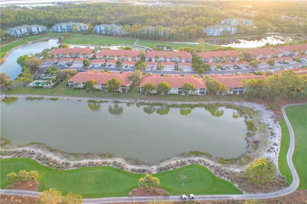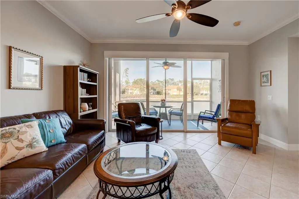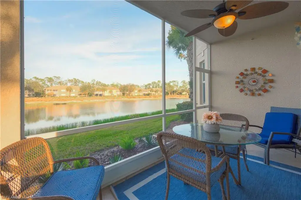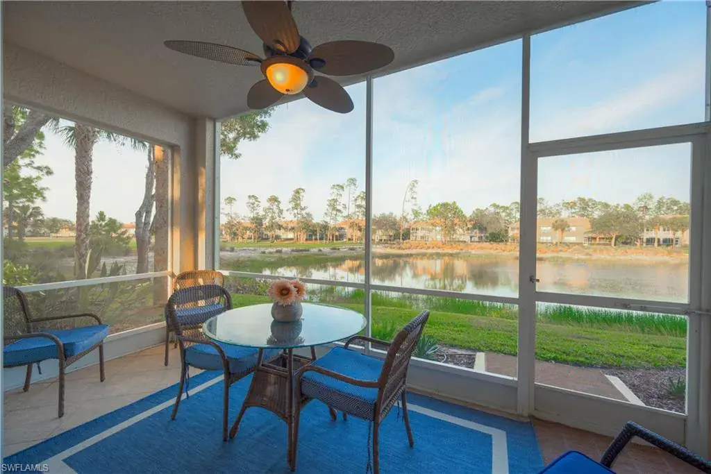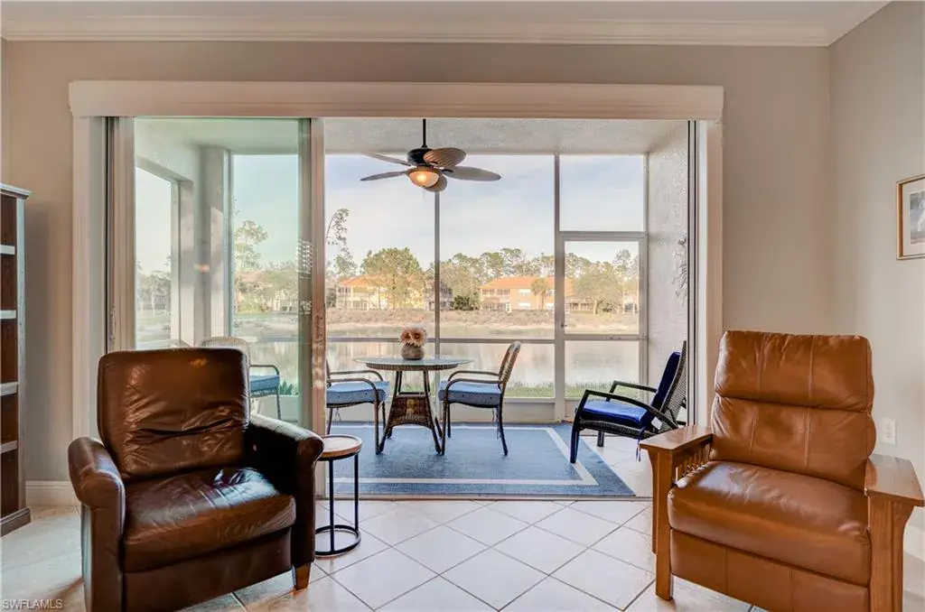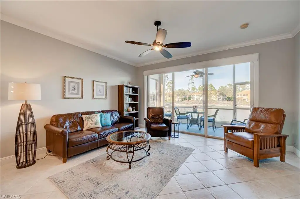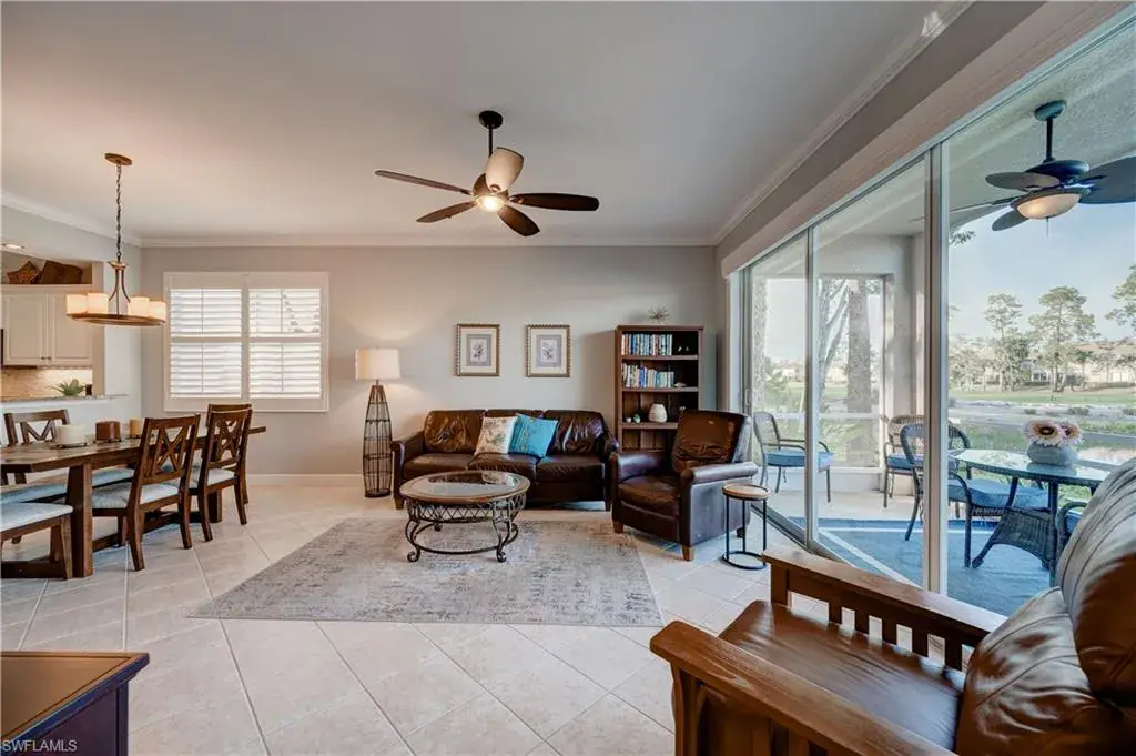 A stunning corner unit that lives like a single-family home while offering the maintenance-free convenience of a condo. This 2+Den, 1-car garage residence is light, bright, and freshly painted, with breathtaking lake and golf course views that remain private and tranquil, thanks to the cart path being across the lake. The open floor plan features granite countertops throughout, tile on the diagonal, and bamboo flooring in the bedrooms, creating a seamless blend of elegance and comfort. The kitchen boasts a stylish backsplash, stainless steel appliances, and a large pantry, while the spacious great room flows effortlessly onto the screened lanai—perfect for entertaining. Thoughtful upgrades include custom fans and lighting, plantation shutters, crown molding, a frameless glass shower door, and his-and-her walk-in closets. With impact doors and windows, a dedicated laundry room with ample storage, and an included PHANTOM SCREEN on the front door for a refreshing cross breeze, every detail has been designed for effortless Florida living. GOLF CART, GARAGE TOOLS, AND TWO BIKES ARE INCLUDED! Nestled in an amenity-rich community with bundled golf (no wait list), tennis, pickleball, resort-style pools with on-site dining, and more, this home offers a truly exceptional lifestyle just minutes from Naples and Marco Island beaches, shopping, dining, and everyday conveniences. Don’t miss this rare opportunity—schedule your private showing today!