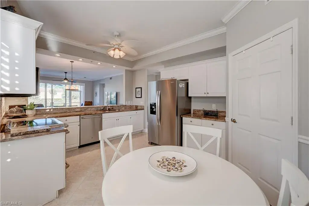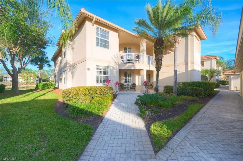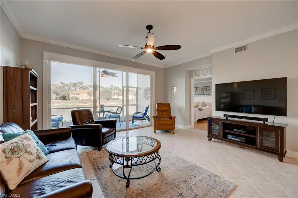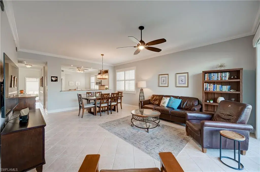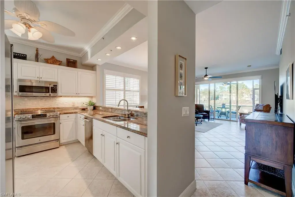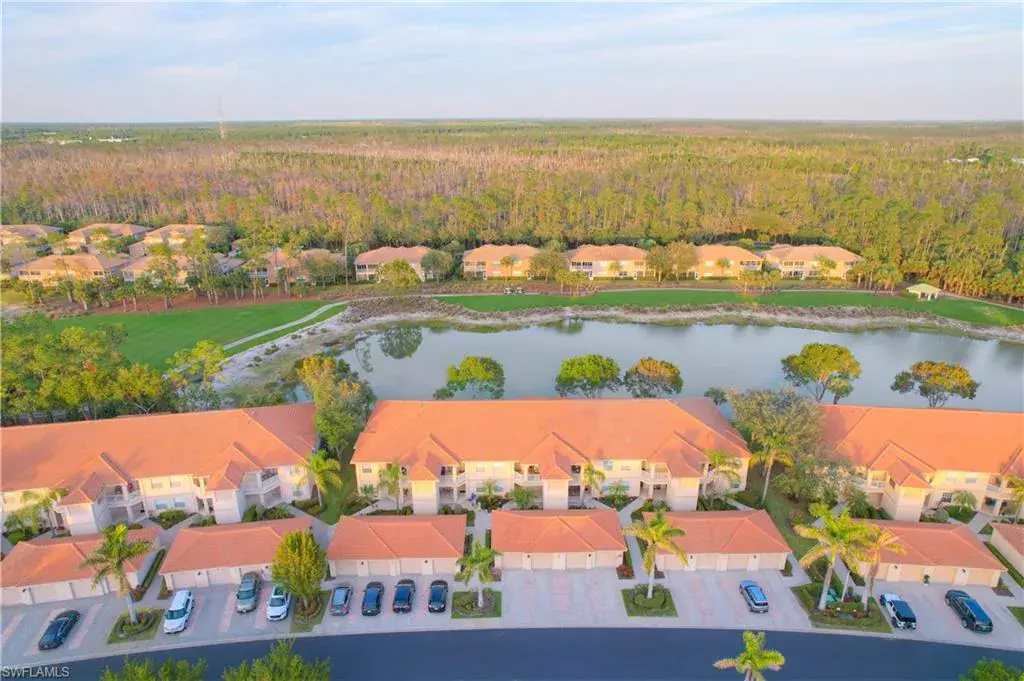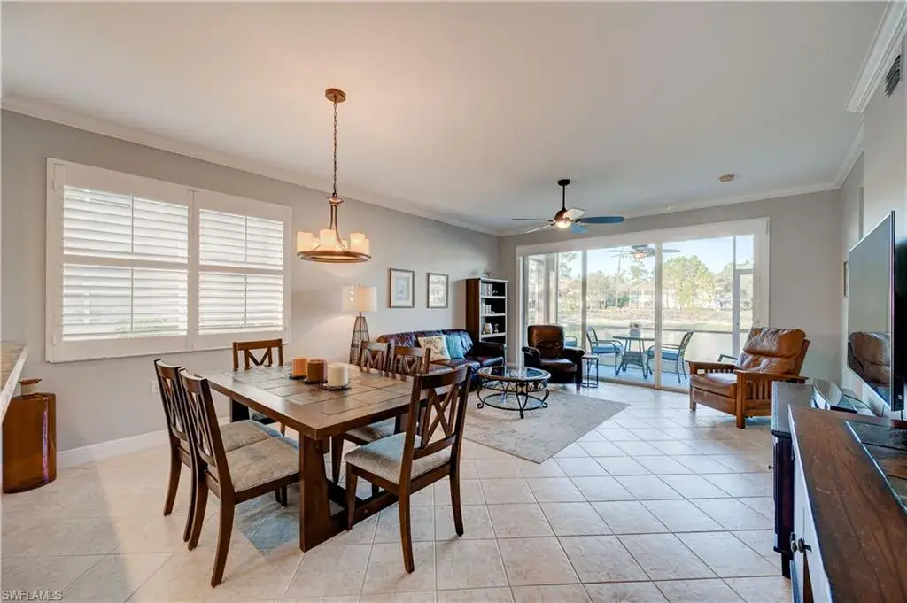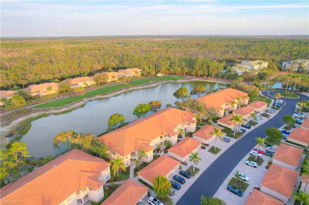 A stunning corner unit that lives like a single-family home while offering the maintenance-free convenience of a condo. This 2+Den, 1-car garage residence is light, bright, and freshly painted, with breathtaking lake and golf course views that remain private and tranquil, thanks to the cart path being across the lake. The open floor plan features granite countertops throughout, tile on the diagonal, and bamboo flooring in the bedrooms, creating a seamless blend of elegance and comfort. The kitchen boasts a stylish backsplash, stainless steel appliances, and a large pantry, while the spacious great room flows effortlessly onto the screened lanai—perfect for entertaining. Thoughtful upgrades include custom fans and lighting, plantation shutters, crown molding, a frameless glass shower door, and his-and-her walk-in closets. With impact doors and windows, a dedicated laundry room with ample storage, and an included PHANTOM SCREEN on the front door for a refreshing cross breeze, every detail has been designed for effortless Florida living. GOLF CART, GARAGE TOOLS, AND TWO BIKES ARE INCLUDED! Nestled in an amenity-rich community with bundled golf (no wait list), tennis, pickleball, resort-style pools with on-site dining, and more, this home offers a truly exceptional lifestyle just minutes from Naples and Marco Island beaches, shopping, dining, and everyday conveniences. Don’t miss this rare opportunity—schedule your private showing today!