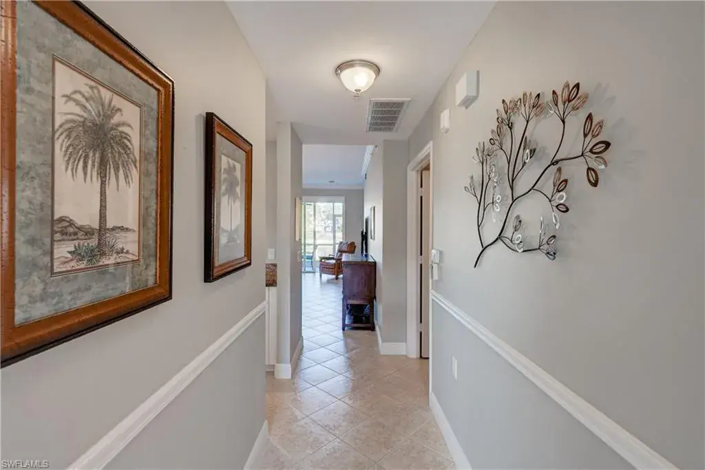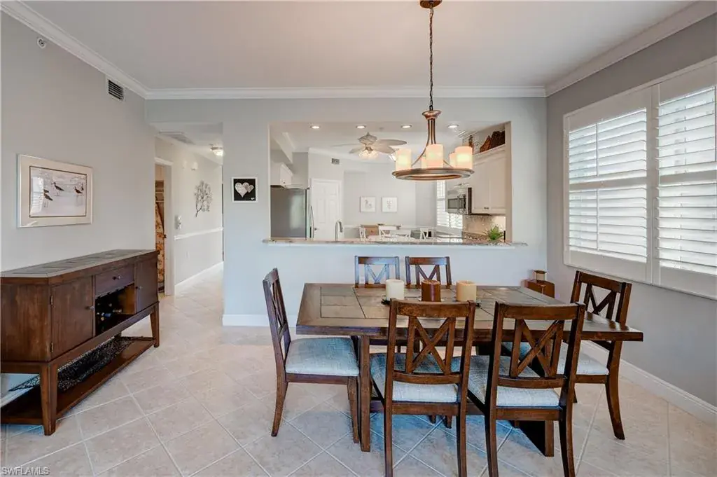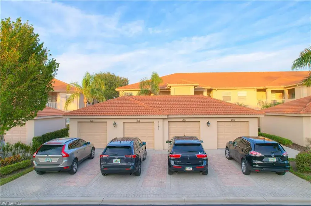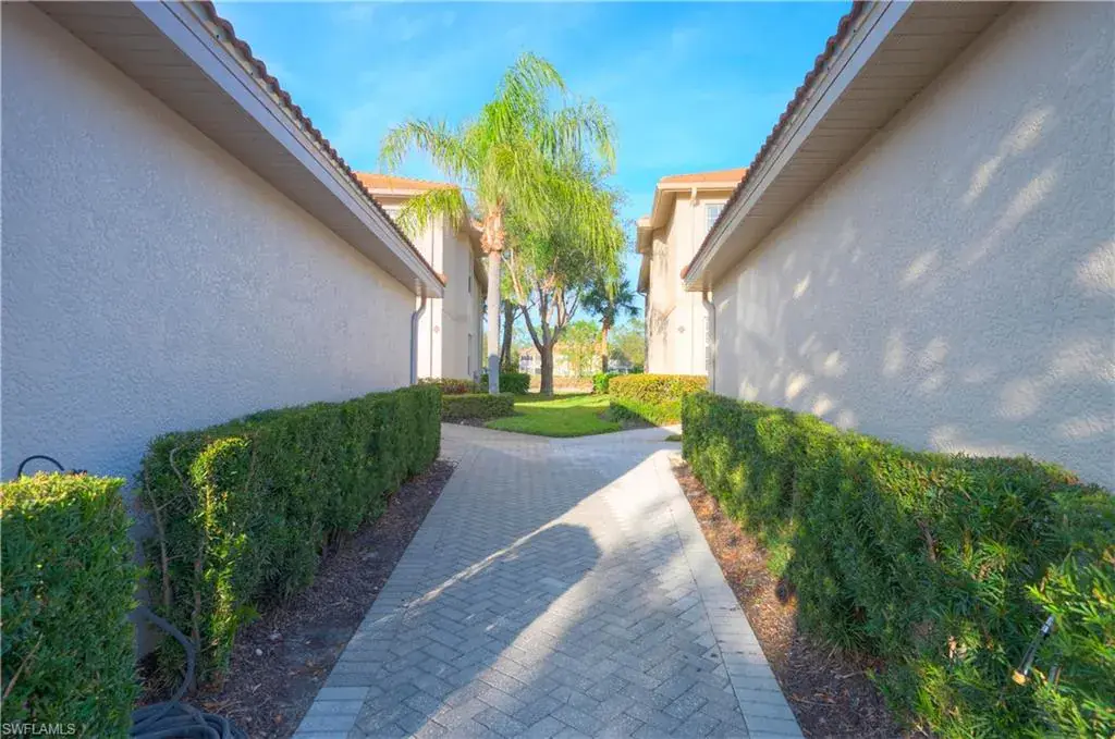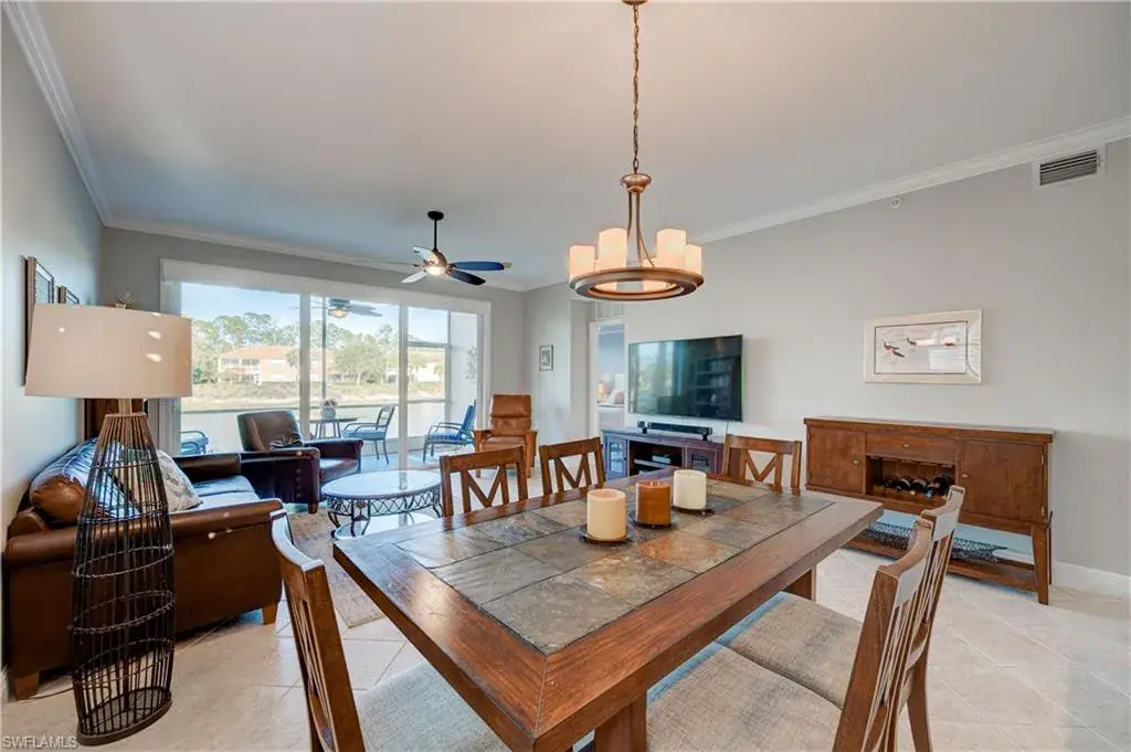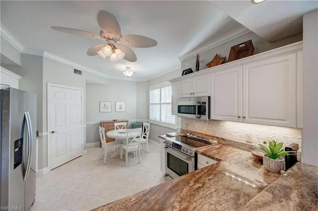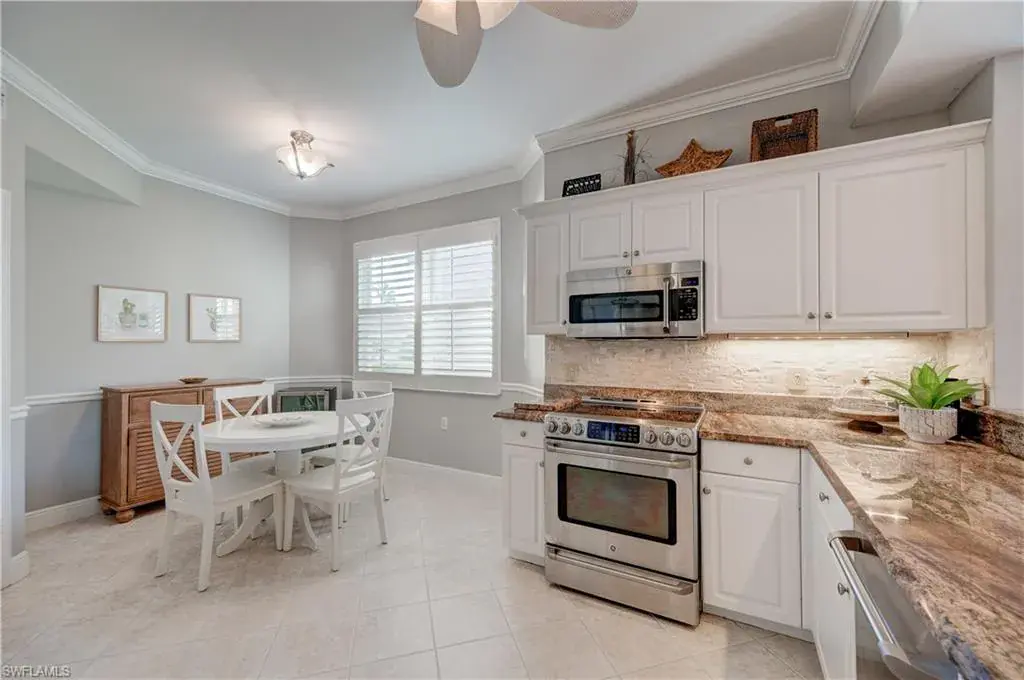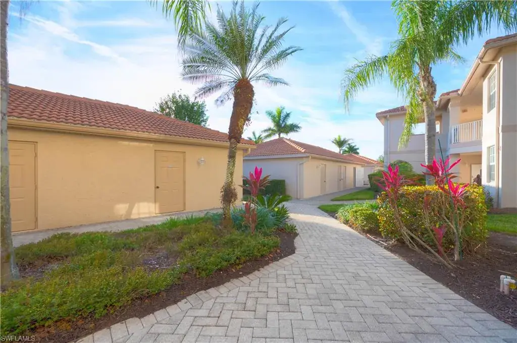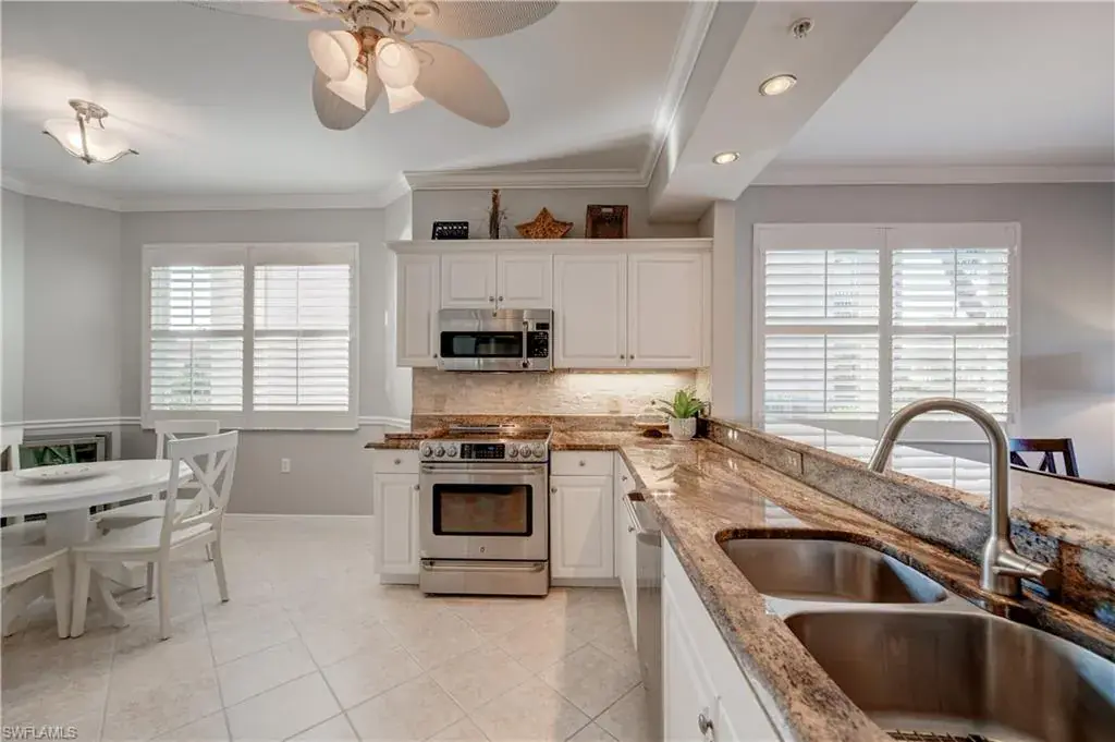 A stunning corner unit that lives like a single-family home while offering the maintenance-free convenience of a condo. This 2+Den, 1-car garage residence is light, bright, and freshly painted, with breathtaking lake and golf course views that remain private and tranquil, thanks to the cart path being across the lake. The open floor plan features granite countertops throughout, tile on the diagonal, and bamboo flooring in the bedrooms, creating a seamless blend of elegance and comfort. The kitchen boasts a stylish backsplash, stainless steel appliances, and a large pantry, while the spacious great room flows effortlessly onto the screened lanai—perfect for entertaining. Thoughtful upgrades include custom fans and lighting, plantation shutters, crown molding, a frameless glass shower door, and his-and-her walk-in closets. With impact doors and windows, a dedicated laundry room with ample storage, and an included PHANTOM SCREEN on the front door for a refreshing cross breeze, every detail has been designed for effortless Florida living. GOLF CART, GARAGE TOOLS, AND TWO BIKES ARE INCLUDED! Nestled in an amenity-rich community with bundled golf (no wait list), tennis, pickleball, resort-style pools with on-site dining, and more, this home offers a truly exceptional lifestyle just minutes from Naples and Marco Island beaches, shopping, dining, and everyday conveniences. Don’t miss this rare opportunity—schedule your private showing today!