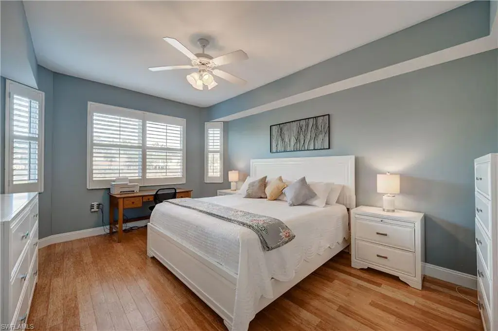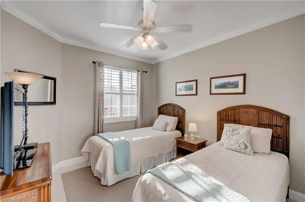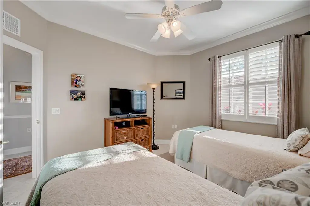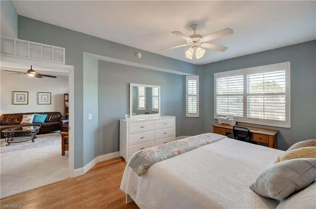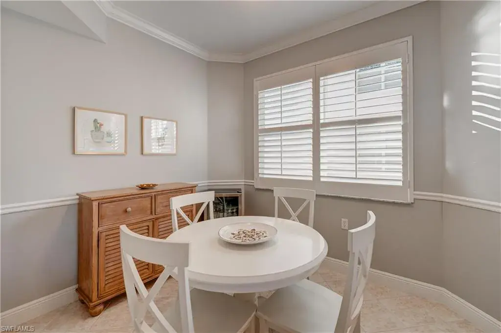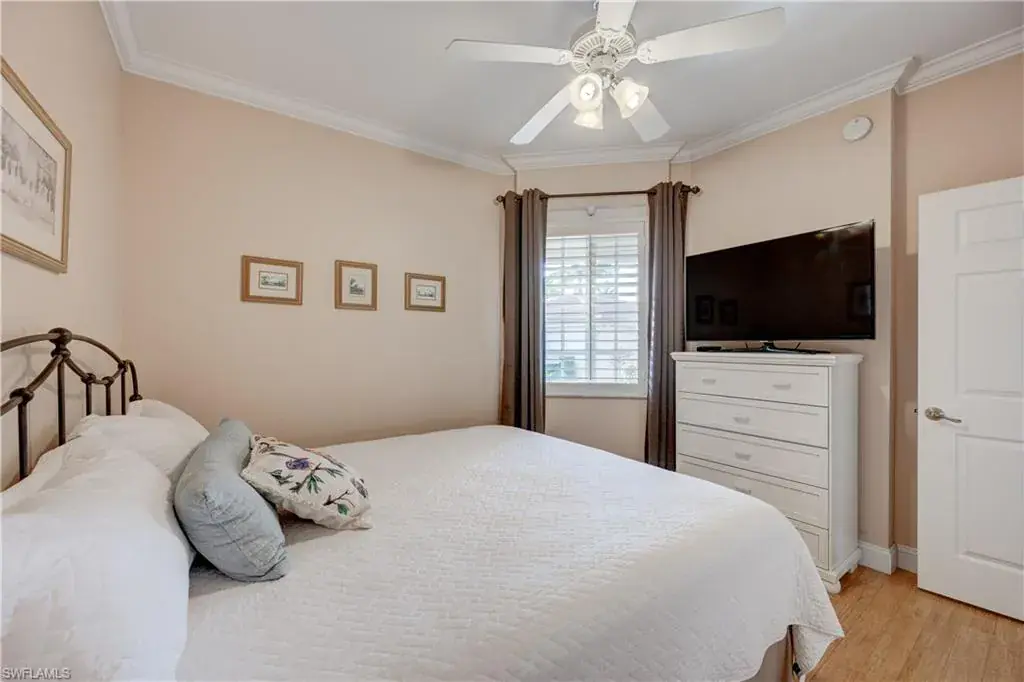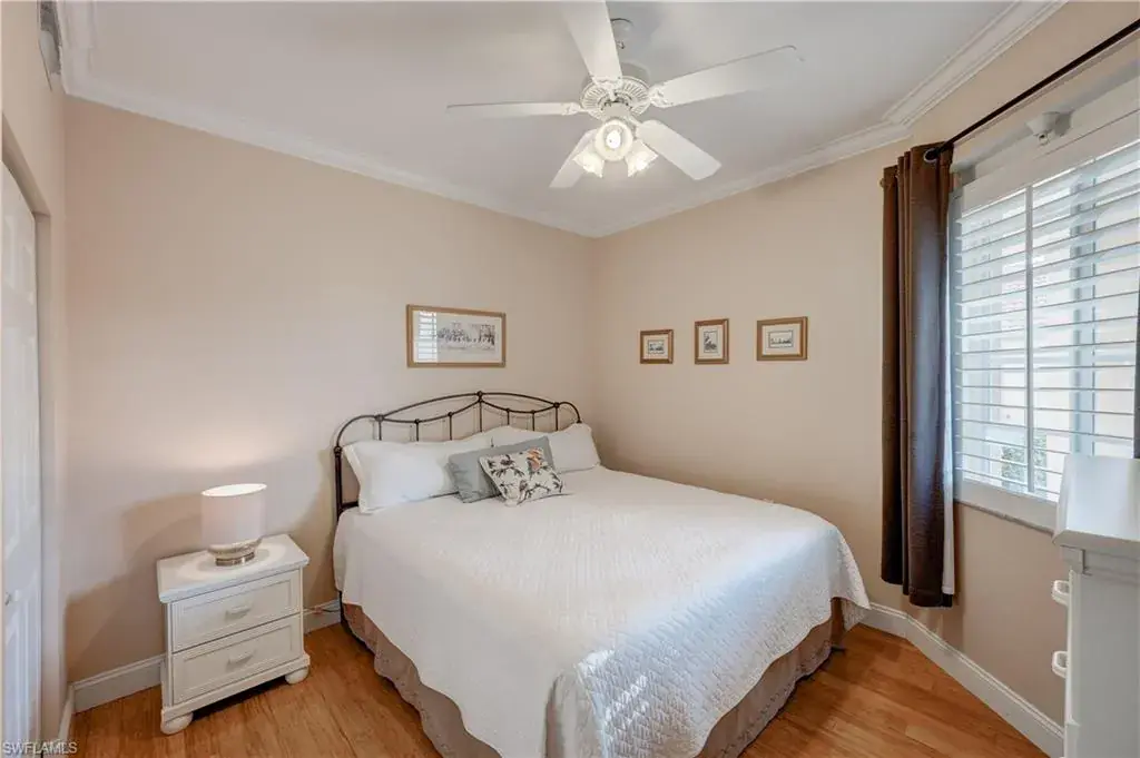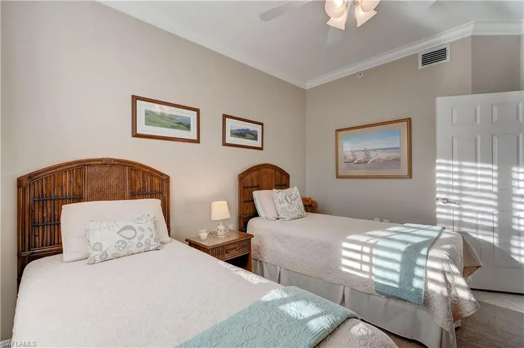 A stunning corner unit that lives like a single-family home while offering the maintenance-free convenience of a condo. This 2+Den, 1-car garage residence is light, bright, and freshly painted, with breathtaking lake and golf course views that remain private and tranquil, thanks to the cart path being across the lake. The open floor plan features granite countertops throughout, tile on the diagonal, and bamboo flooring in the bedrooms, creating a seamless blend of elegance and comfort. The kitchen boasts a stylish backsplash, stainless steel appliances, and a large pantry, while the spacious great room flows effortlessly onto the screened lanai—perfect for entertaining. Thoughtful upgrades include custom fans and lighting, plantation shutters, crown molding, a frameless glass shower door, and his-and-her walk-in closets. With impact doors and windows, a dedicated laundry room with ample storage, and an included PHANTOM SCREEN on the front door for a refreshing cross breeze, every detail has been designed for effortless Florida living. GOLF CART, GARAGE TOOLS, AND TWO BIKES ARE INCLUDED! Nestled in an amenity-rich community with bundled golf (no wait list), tennis, pickleball, resort-style pools with on-site dining, and more, this home offers a truly exceptional lifestyle just minutes from Naples and Marco Island beaches, shopping, dining, and everyday conveniences. Don’t miss this rare opportunity—schedule your private showing today!