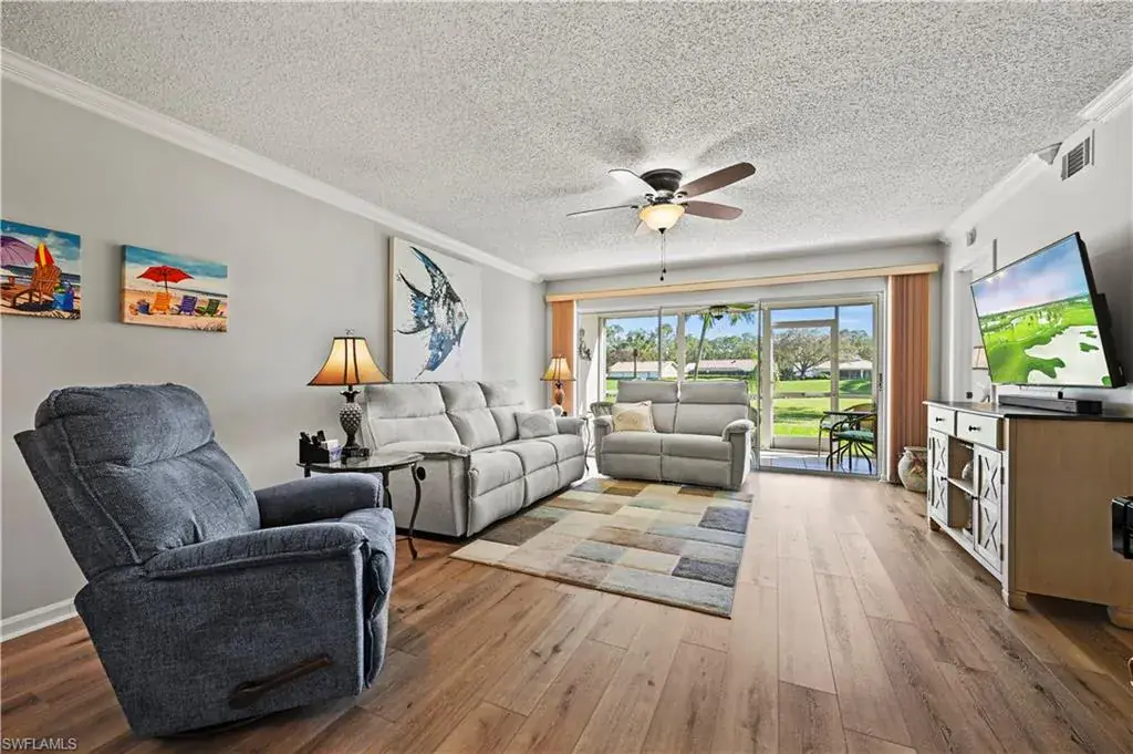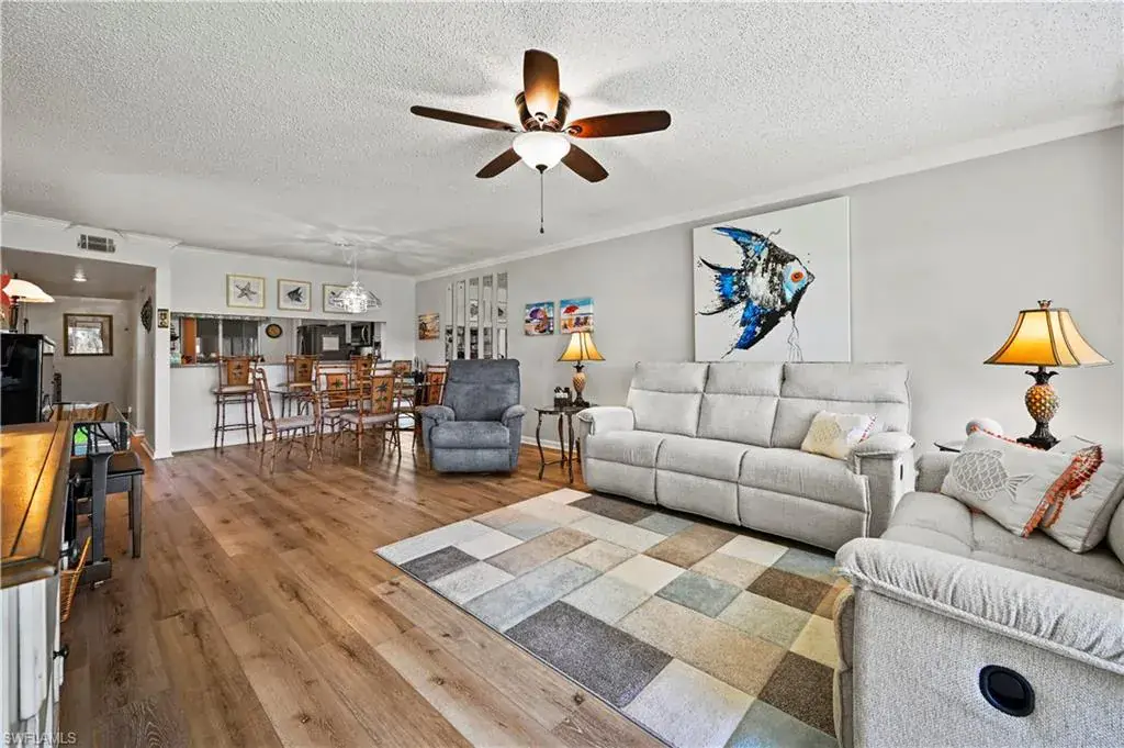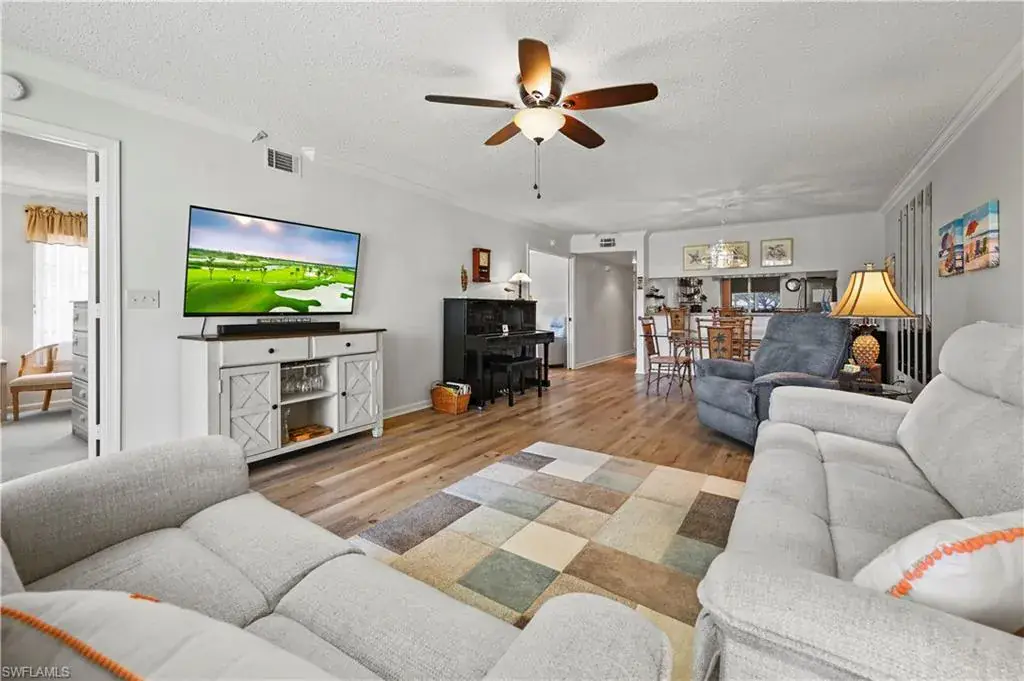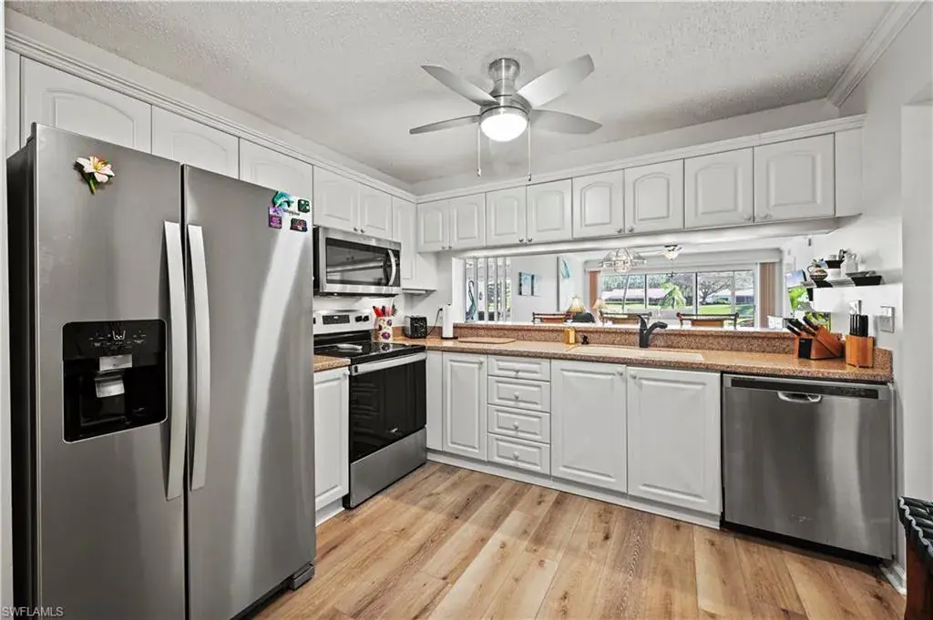 This first-floor end unit offers stunning lake and golf course views, partially furnished and a meticulously clean interior. Featuring a rare third bedroom/den and extra square footage, this home has been thoughtfully upgraded with luxury vinyl flooring and all-new appliances in 2021. The open layout allows for an abundance of natural light and ample storage throughout.