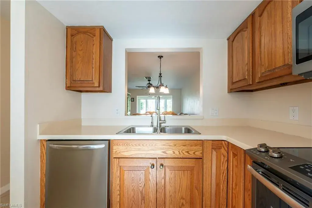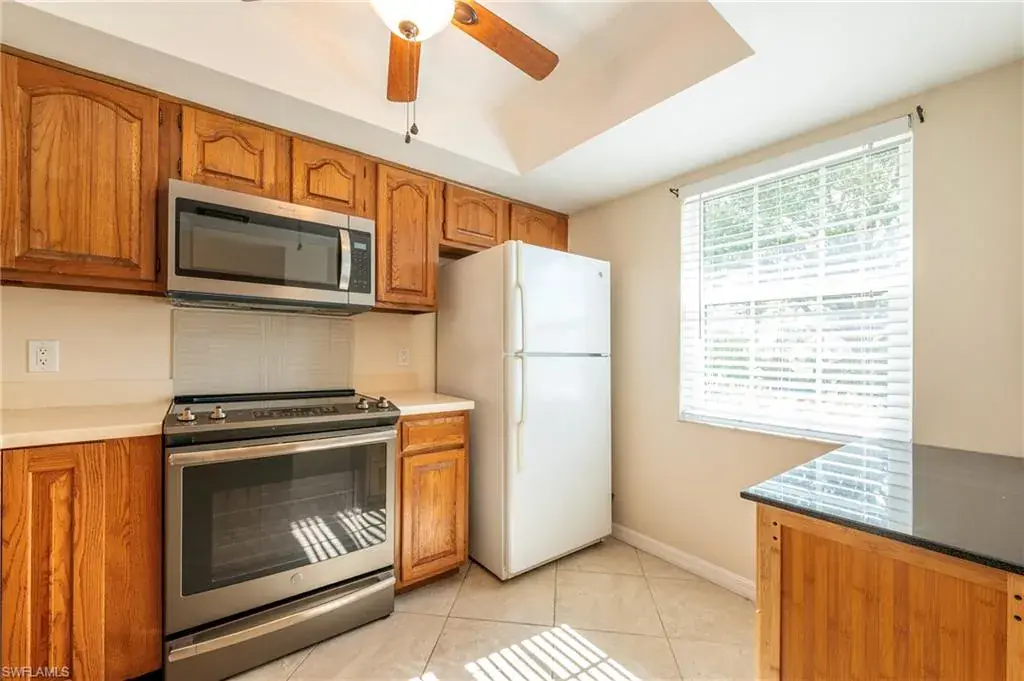 Welcome to your slice of paradise in the sought-after Lakewood community! This ground-floor villa offers the ultimate in privacy—no neighbors above—and comes with covered parking and extra storage for all your Florida lifestyle essentials. Step inside to discover diagonally laid tile floors throughout—no carpet anywhere! The spacious layout flows seamlessly into an enclosed lanai with impact-rated sliding doors, leading to an extended patio where you’ll soak in serene lake views and lush tropical landscaping. Enjoy peace of mind with impact windows and a 2018 roof, plus a host of recent upgrades: Range, dishwasher & water heater (2019), Microwave (2022), HVAC system (2017), and Brand-new reverse osmosis water system (2025), new plumbing fixtures in guest bath and kitchen (2025), Master Shower is handicap accessible. Boca Ciega Village is a low-density, pet-friendly community with low fees and a sparkling pool steps away. You’re only minutes from Naples’ world-famous beaches, scenic parks, pickleball courts, public golf, and a vibrant mix of dining, shopping, and entertainment. With rental restrictions in place—no rentals allowed until 3 years of ownership—your investment is protected, making this villa ideal for a primary residence or vacation retreat. Move-in ready and waiting for you! Don’t miss out on this rare opportunity to own a peaceful, well-maintained home in one of Naples’ most charming communities.