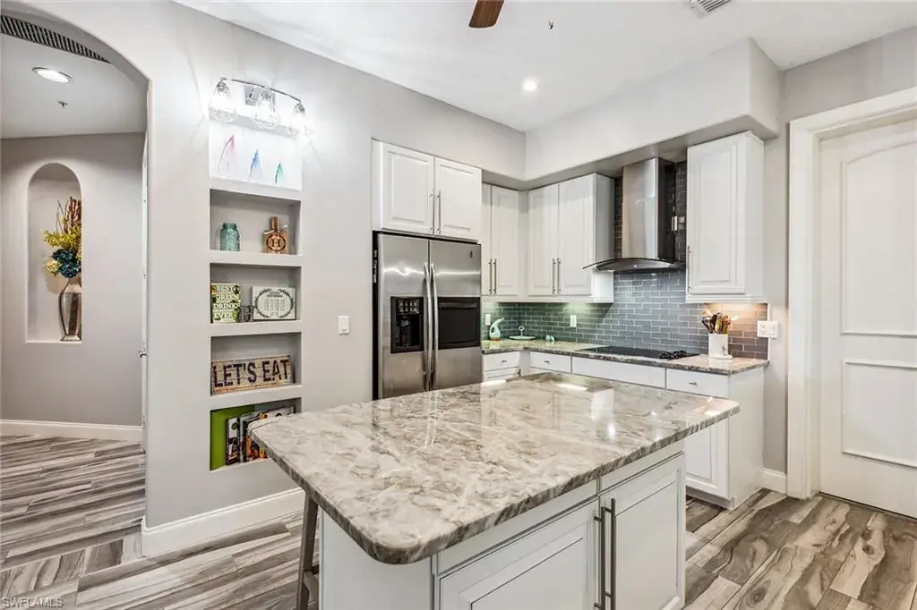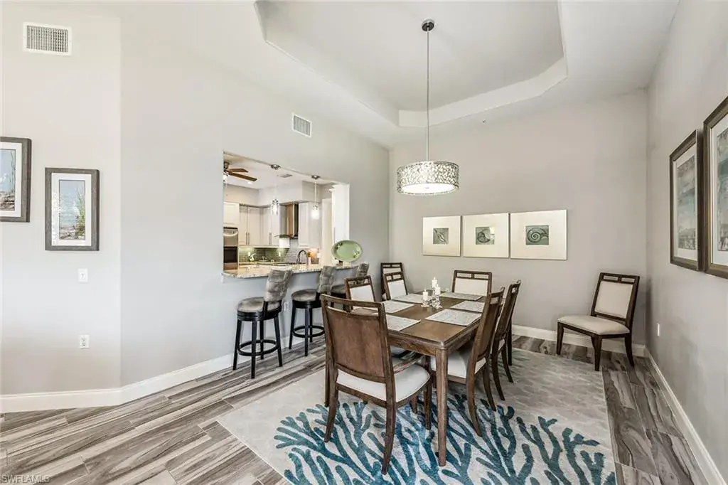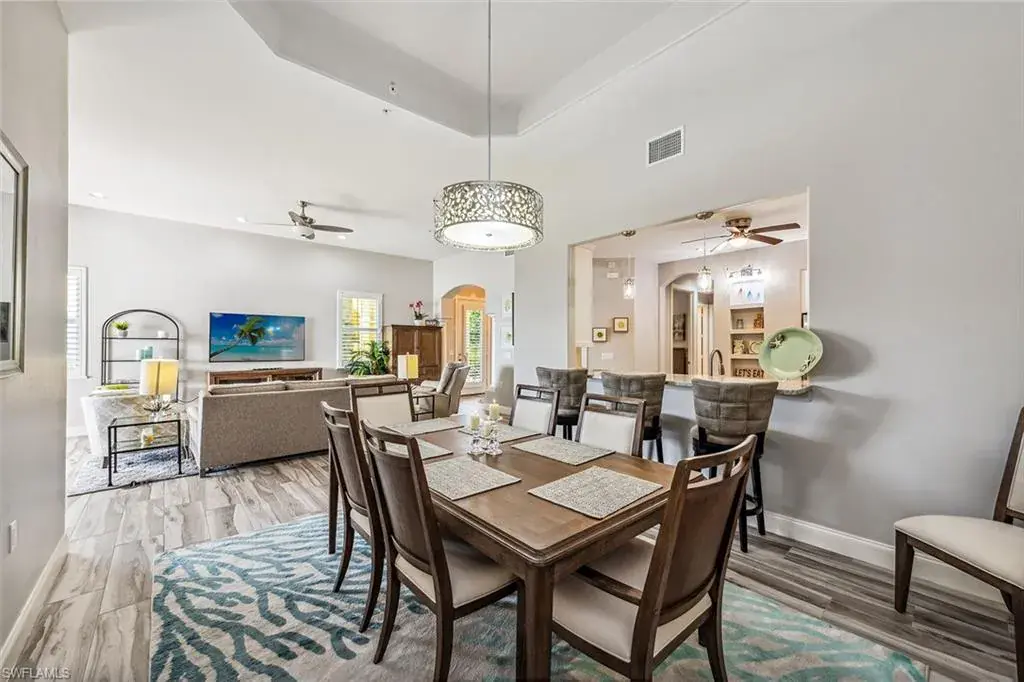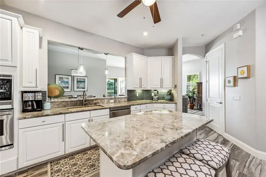 Stunning first-floor, end-unit condominium in the prestigious Hammock Bay Golf and Country Club. This furnished home offers 2,104 square feet of living space, featuring three bedrooms, 2.5-baths and a two-car garage. The exterior boasts southern panoramic views of the lake and lush golf course, complemented by impact doors and windows, paver driveway and a tile roof. Step inside and be greeted by soaring ceilings, plantation shutters and wood-like tile floors throughout. The kitchen is equipped with stainless appliances, white cabinets, granite countertops, three-seater breakfast bar, and a center island. The adjacent dining room features an elegant tray ceiling and opens to the living room, creating an open-concept space filled with natural light. The owner’s suite is complete with two walk-in closets and an en-suite bath with a floating dual sink vanity, frameless glass shower and a separate claw tub, providing a spa-like experience. Outdoor living is redefined with a covered, screened-in lanai, featuring tile flooring and unobstructed lake and golf course views. Residents enjoy access to world-class amenities and a quick drive to downtown Naples and Marco Island beaches.