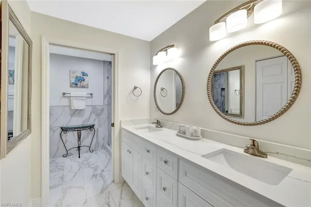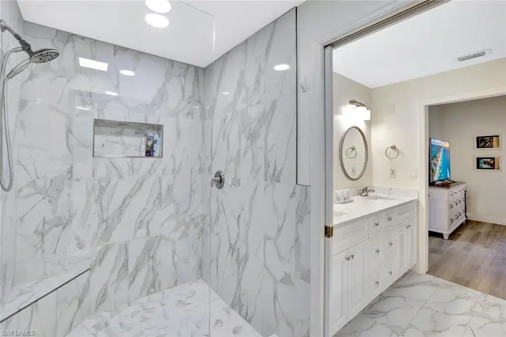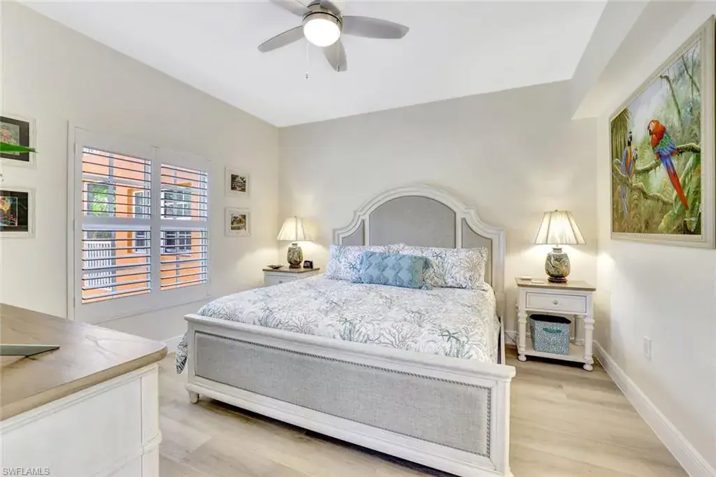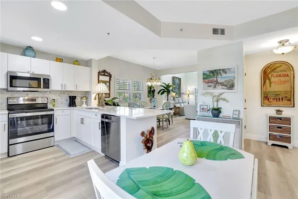 Inside, discover a fully updated interior, featuring a newly redesigned kitchen with stainless steel appliances and sleek quartz countertops, all-new spa-inspired baths with modern finishes, luxury vinyl flooring throughout, stylish plantation shutters, and brand-new motorized lanai shades—seamlessly combining comfort and sophistication. This property also includes a one-car garage and a generously sized storage space outside the unit.
