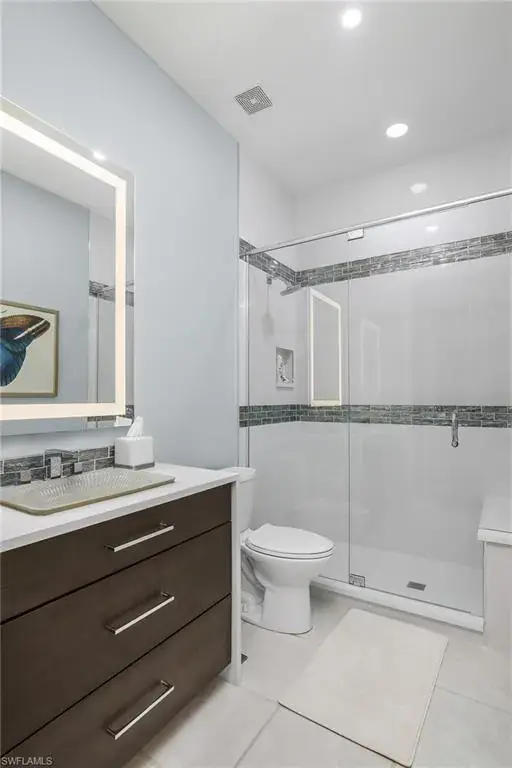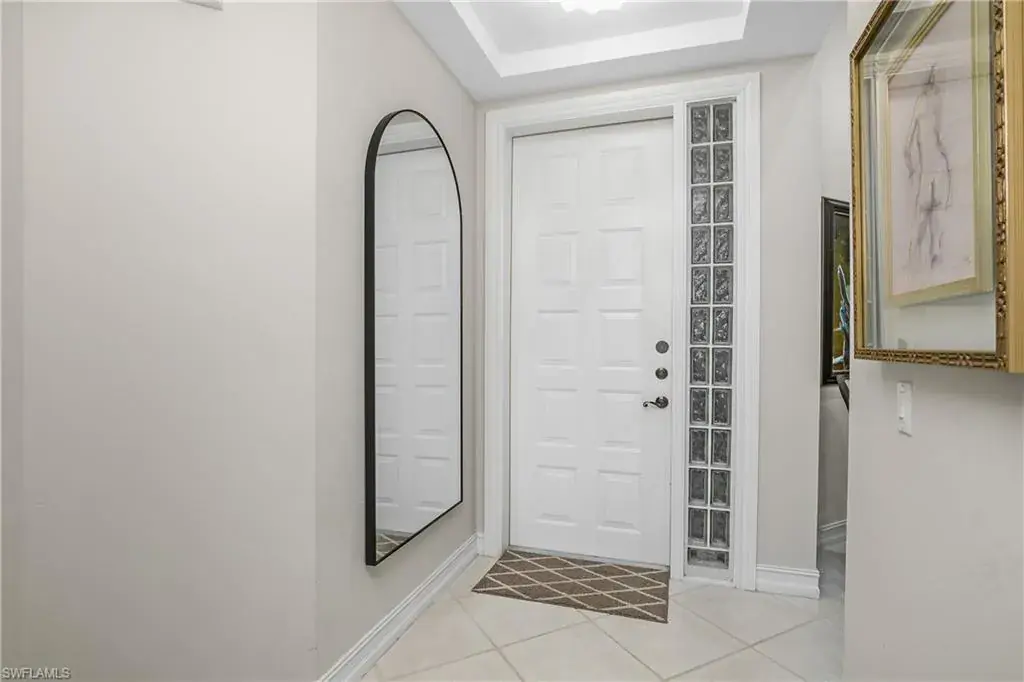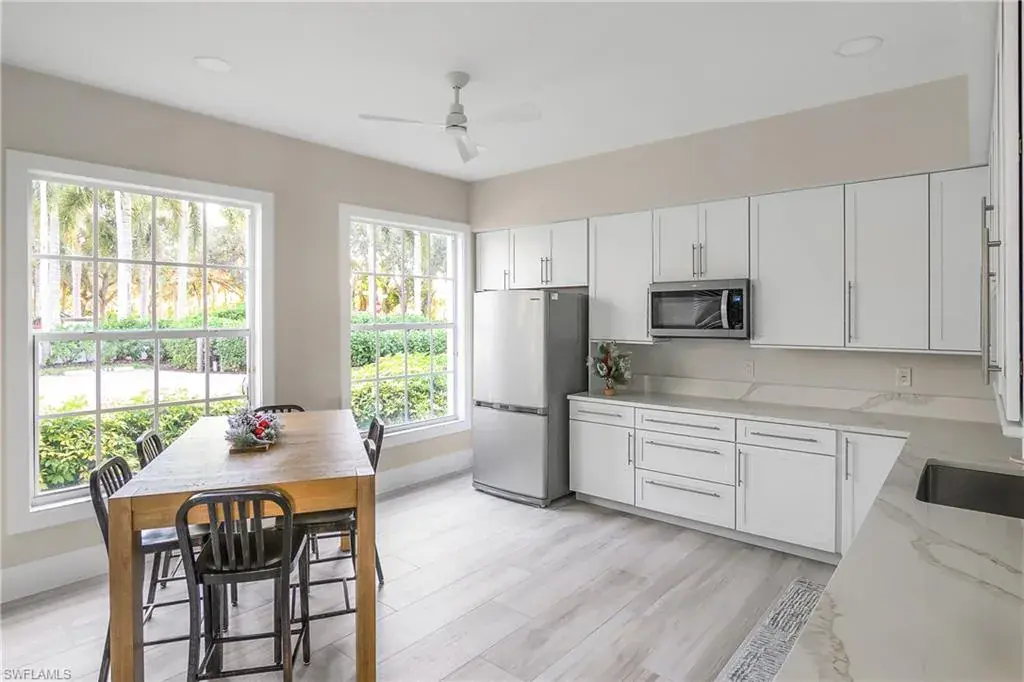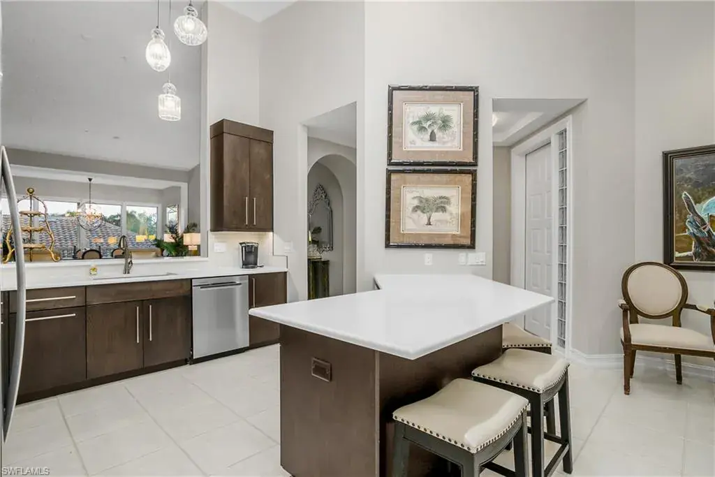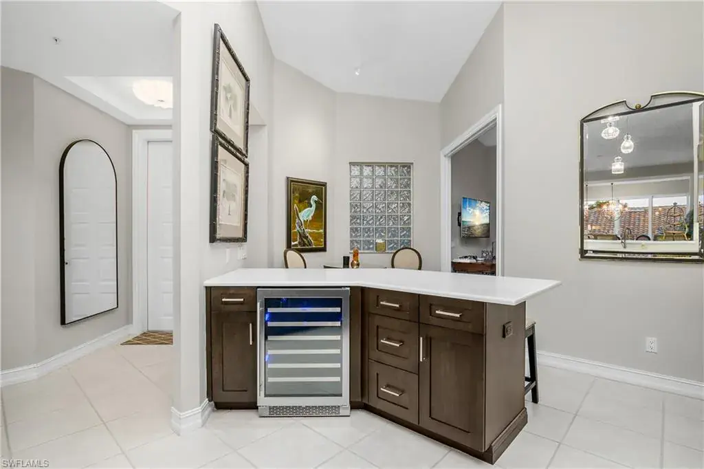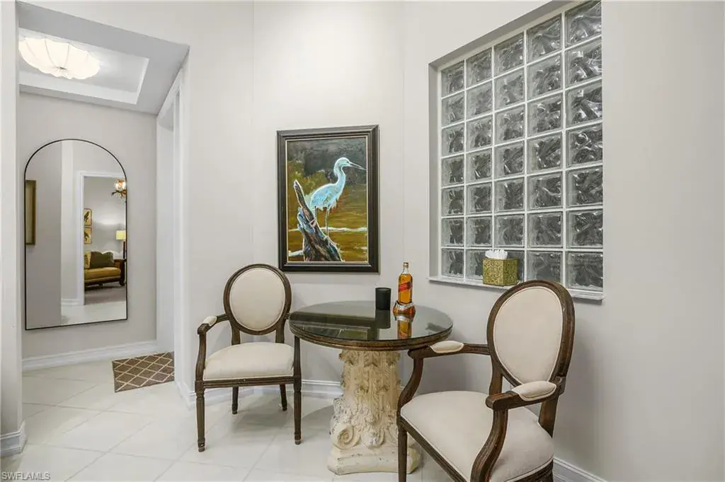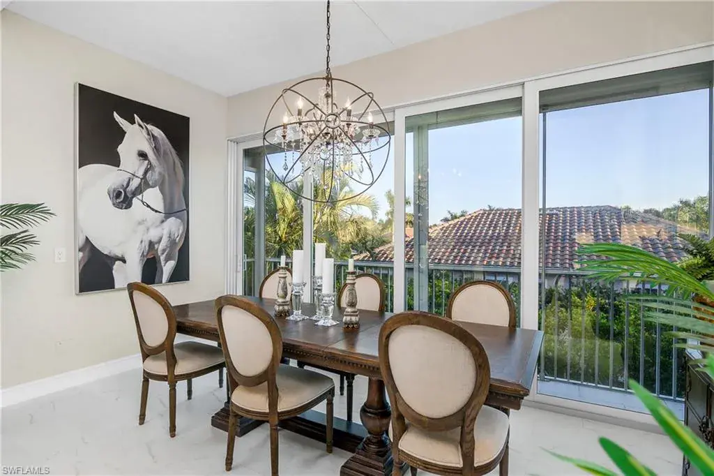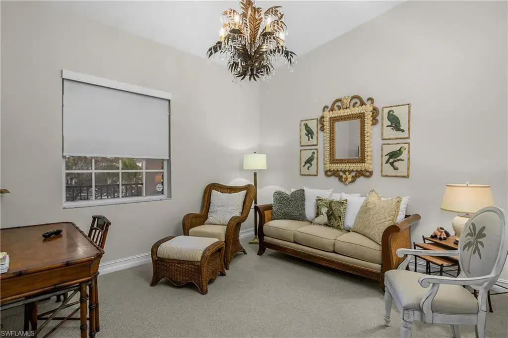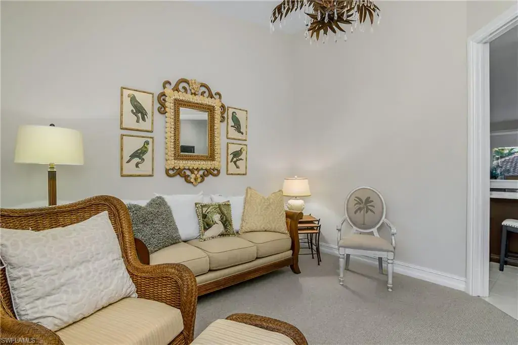 Welcome to this beautifully remastered Breakwater two bedroom plus a den condo with its unique 2 car plus storage enclosed garage, directly under your unit. In 2023 the entire unit underwent a NEW and LUXURIOUS TRANSFORMATION that created a sophisticated designer interior with high quality appointments throughout. The remodel included the replacement of all plumbing piping…very important, the building roof tiles, new impact glass sliding glass doors were installed on the lanai in front of the screen enclosure creating a grand dining area that is in the air conditioned space as well as being able to open the SGDs and have the outside air to fill the unit on a beautiful day. The AC and Hot Water Heater were replaced in 2022. Partially furnished, see inclusion list, this unit location offers a very private view with no units looking back into your home and is directly across the street from the community club house and pool area with lots of guest parking. Located directly inside the main gate allows for a quick walk or bike ride to the many amenities in Pelican Bay !
