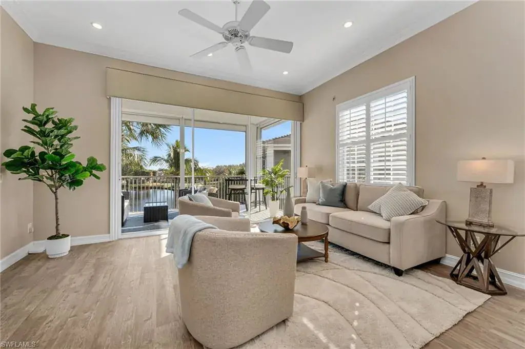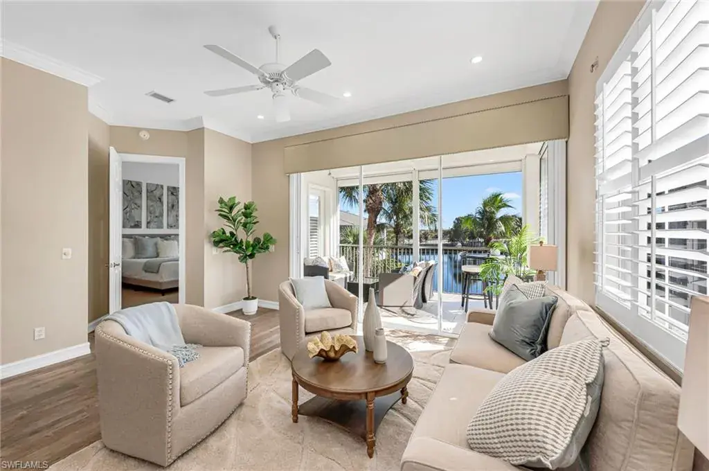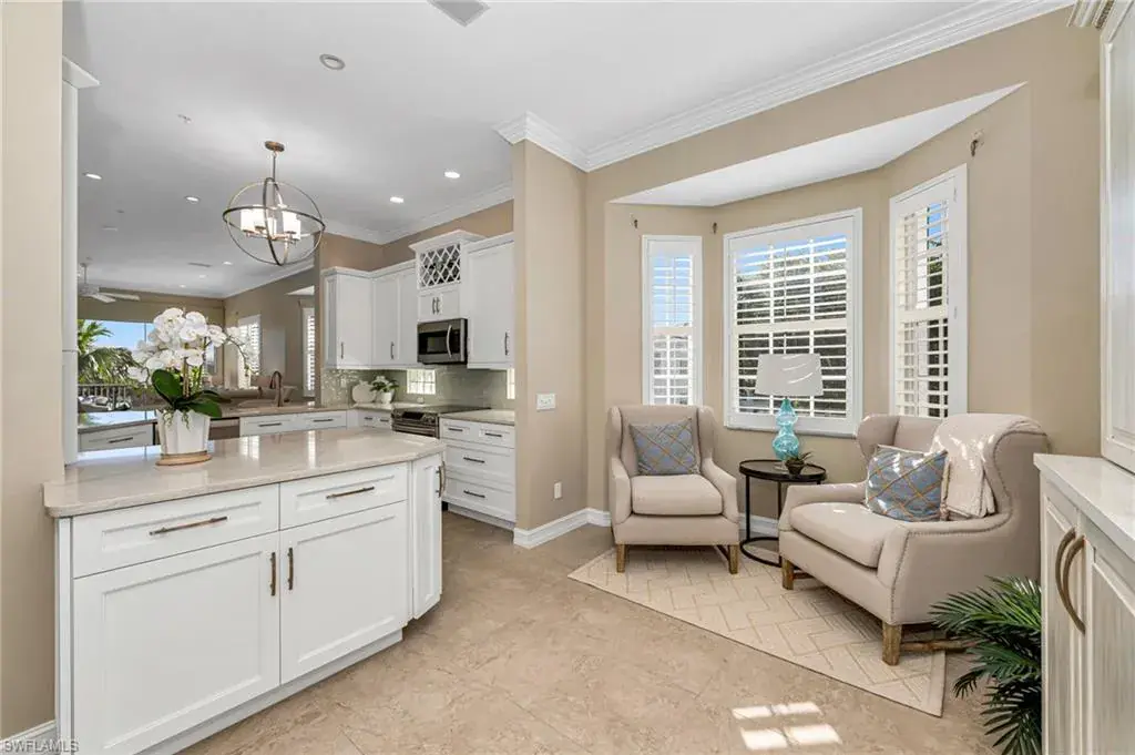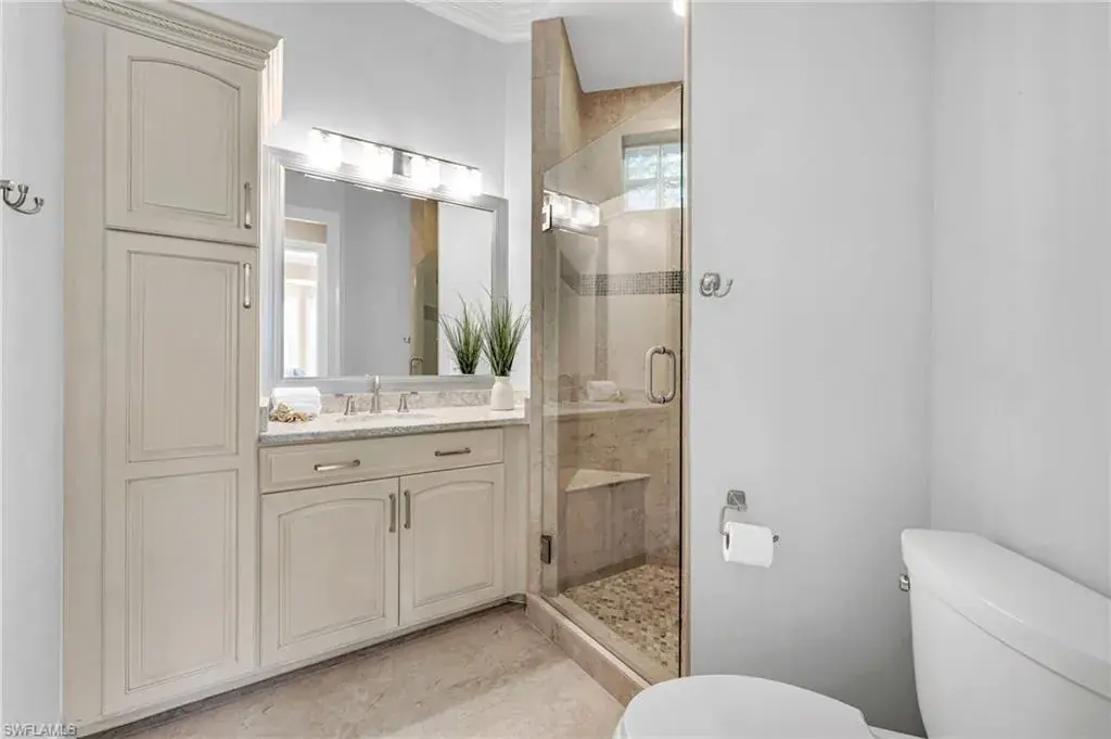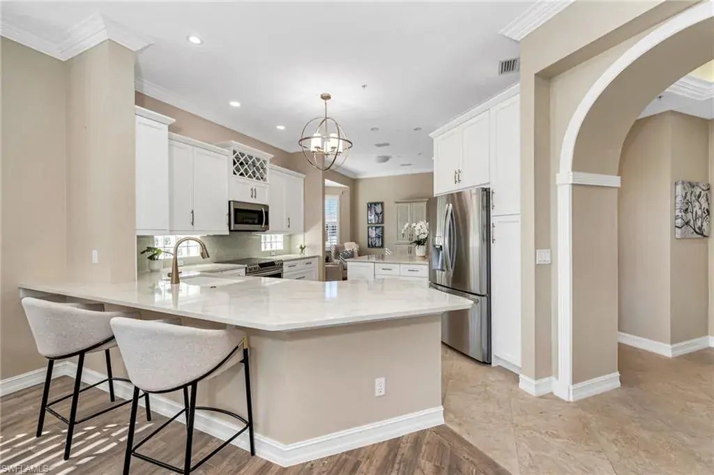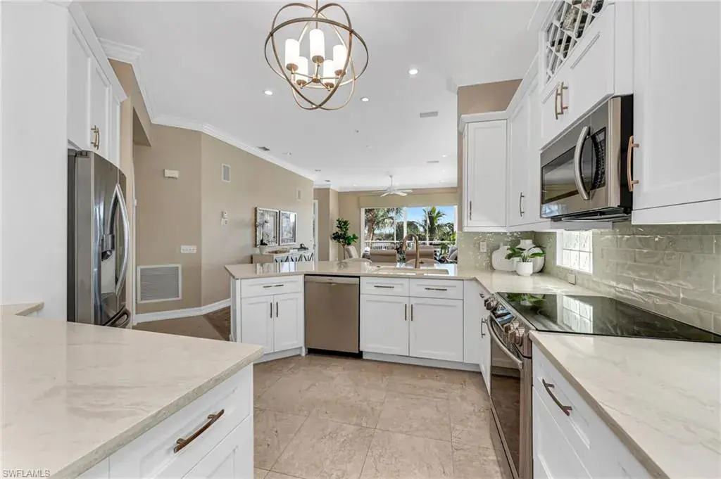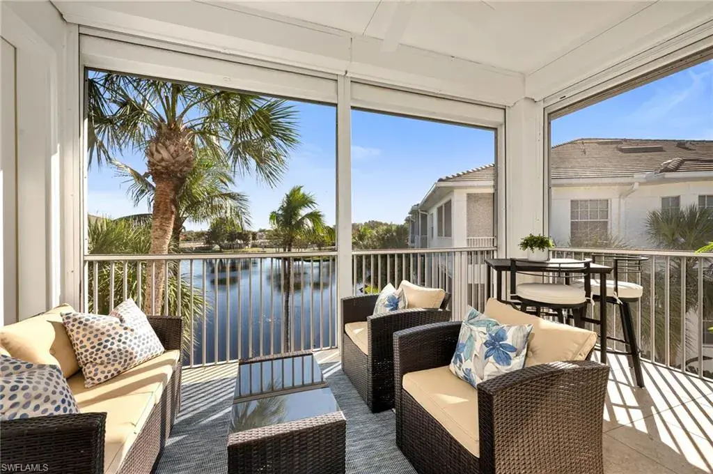 Coveted, second floor END UNIT overlooking a tranquil lake. Enjoy coffee on the screened lanai as natural morning light abounds. Kitchen and bathrooms have been re-imagined with KraftMaid dovetail cabinetry accompanied by quartz and granite countertops. Take advantage of various, roll outs, pot and pan drawers and extensive storage. The kitchen boasts stainless steel appliances with an abundance of counter service areas to prepare meals for guests and family. The floor plan allows for eat in kitchen at the counter, an area for formal dining or a meal on the lanai. All bedrooms recently painted in 2025; as well as newer lighting fixtures and fans in many areas. Breakwater 2nd Floor units enjoy oversized, 30’x 21′ garages which are a premium in Pelican Bay.