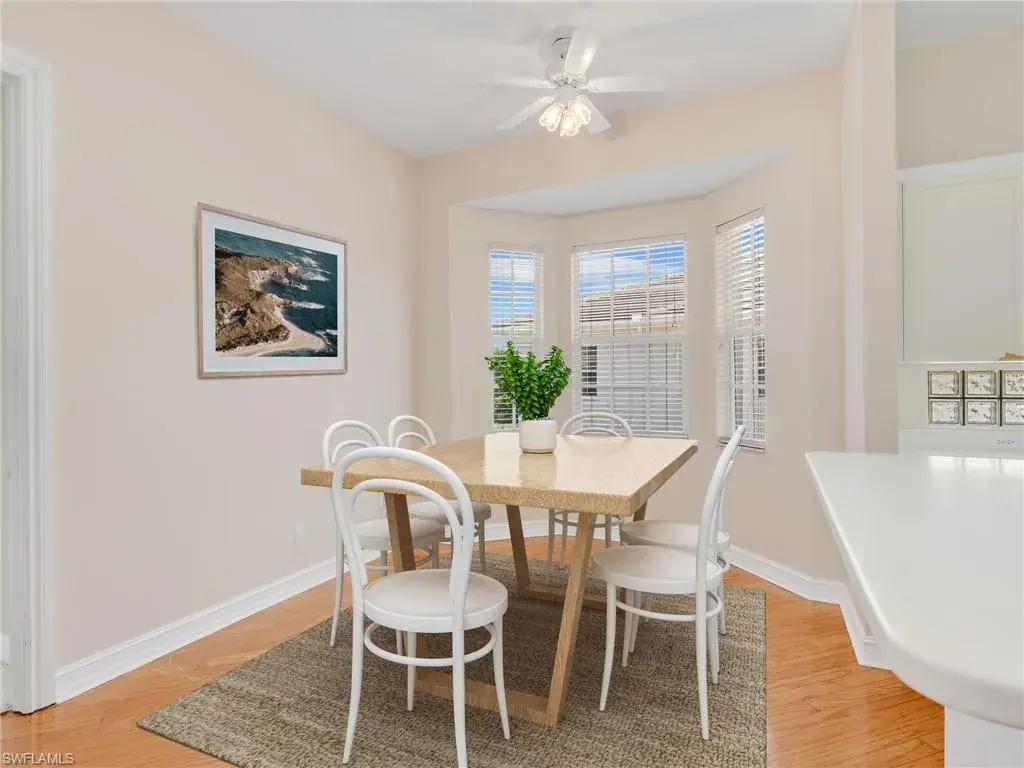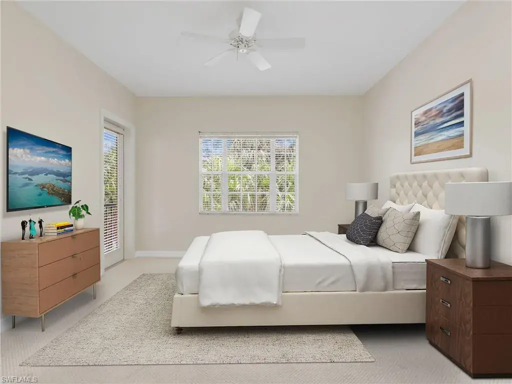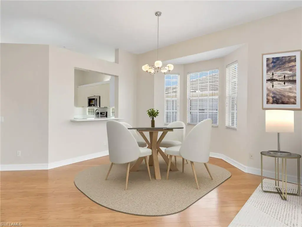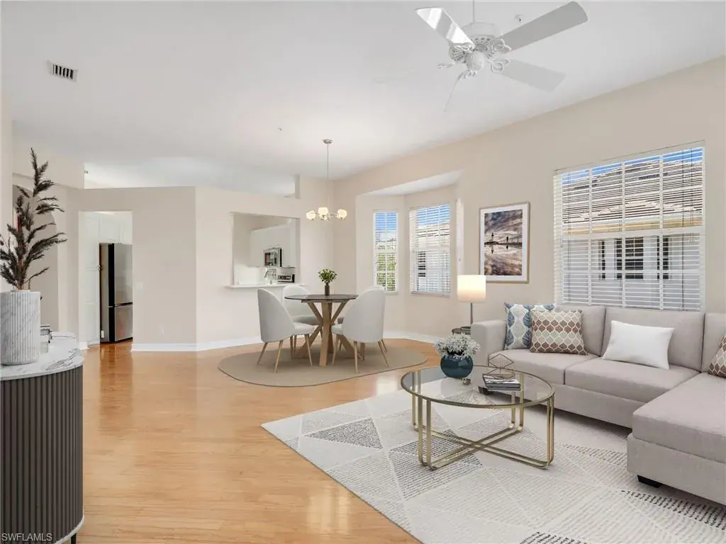 Welcome to this beautifully maintained, spacious 3 bedroom, plus den, 2 and one half bathroom condo located in the heart of North Naples. Nestled in the desirable Breakwater community of Pelican Bay, this second-floor end unit offers a light-filled open floor plan with almost 2,000 square feet of living space and serene, private views of lush tropical landscaping as well as a partial lake view. From the foyer, step into a bright and airy living area with gleaming hardwood floors, high ceilings, and a seamless flow from the dining space to the enclosed lanai. The expansive glass-enclosed lanai with sliding doors allows for year-round enjoyment of the Florida lifestyle while overlooking palm trees, mature greenery and partial lake. The kitchen features white cabinetry, solid-surface countertops, upgraded, newer, stainless steel appliances (refrigerator 2024, microwave, stove, dishwasher 2023), a breakfast bar, and a charming breakfast nook and den with bay windows. The spacious owner’s suite offers large windows, private lanai access, his and her walk-in closets, and a generous en-suite bath with dual vanities, a soaking tub, separate water closet, and a walk-in shower. Two additional, sizable bedrooms provide space for guests, a home office, or hobbies, and share a full guest bath. There is a convenient half bathroom right off the den for guests. Other features include large, in unit laundry with extra cabinets for storage and an oversized 2 car garage with ample storage. The freshly painted condo provides a neutral paint palette ready for your personal touch. The condo has been upgraded with hurricane impact doors and windows and had the outdated plumbing replaced in 2022. Breakwater is located less than 1 mile from the North Tram of Pelican Bay to bring you to the north end beach and restaurant, Marker 36. Here you will find one of the airy, bright, open restaurants, allowing you to relax and take in gorgeous views of nature, beautiful white sand beaches, and, the breathtaking Naples sunset while savoring quick bite or a complete meal with a full bar. Or just relax on the beach under an umbrella, on a lounger provided for the residents. Breakwater also provides a private gate, just steps away, to the nearly finished, brand new Pelican Bay community park. This park will have racquetball, bocce, basketball and clay tennis courts. A playground, walking trail system, pavilion, softball and soccer field are almost complete. Located just minutes from Naples’ award-winning beaches, world-class dining, shopping, and golf, this condo is ideal as a year-round residence, vacation home, or investment property. Don’t miss your opportunity to own this piece of paradise in one of Naples’ most peaceful communities.