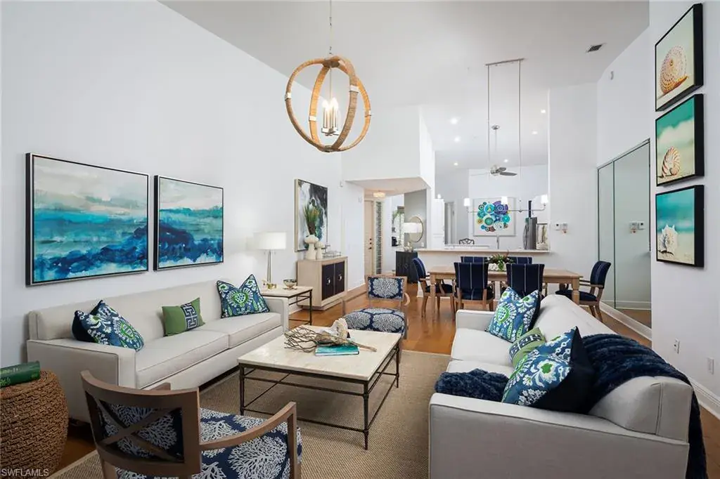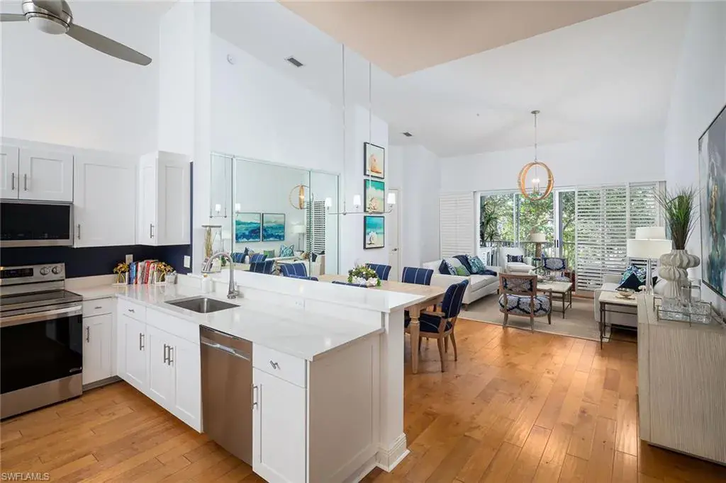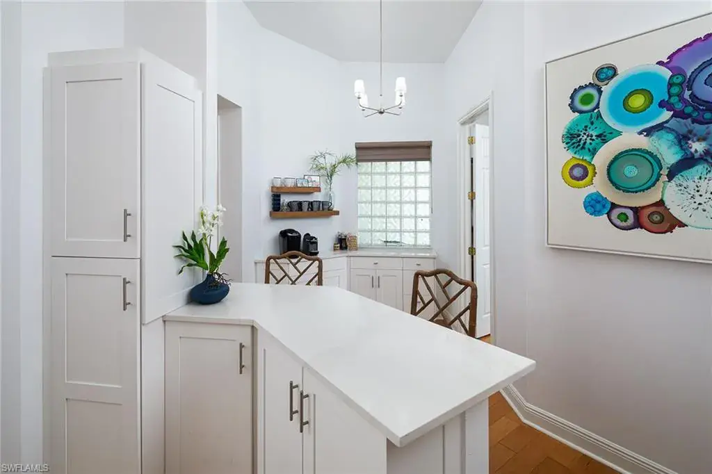 Enjoy the peaceful lakefront setting from this sought-after second-floor residence with soaring cathedral ceilings, new wide plank wood floors, an enclosed lanai with glass sliders, a renovated and redesigned kitchen with new bar area, quartz counters, stainless appliances and more. New thoughtful design makes the space more functional with the enclosed study or third bedroom off the back hallway. Other recent improvements include new roof in 2022, new plumbing pipes in 2022, electric hurricane shutters, new light fixtures and fans, quartz counter in guest bath, and newer HVAC and water heater. Breakwater at Pelican Bay is a popular gated community just a short distance to the beach and The Pavillion shops and restaurants, and offers elevator access to the oversize two-car garages, newly renovated pool, spa, fitness center and clubhouse.