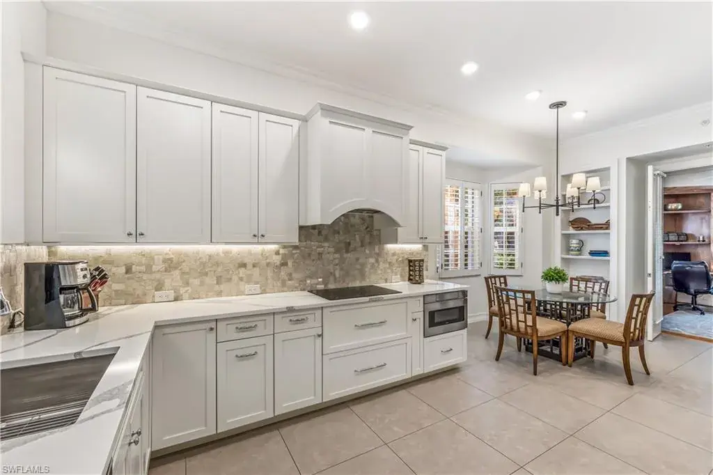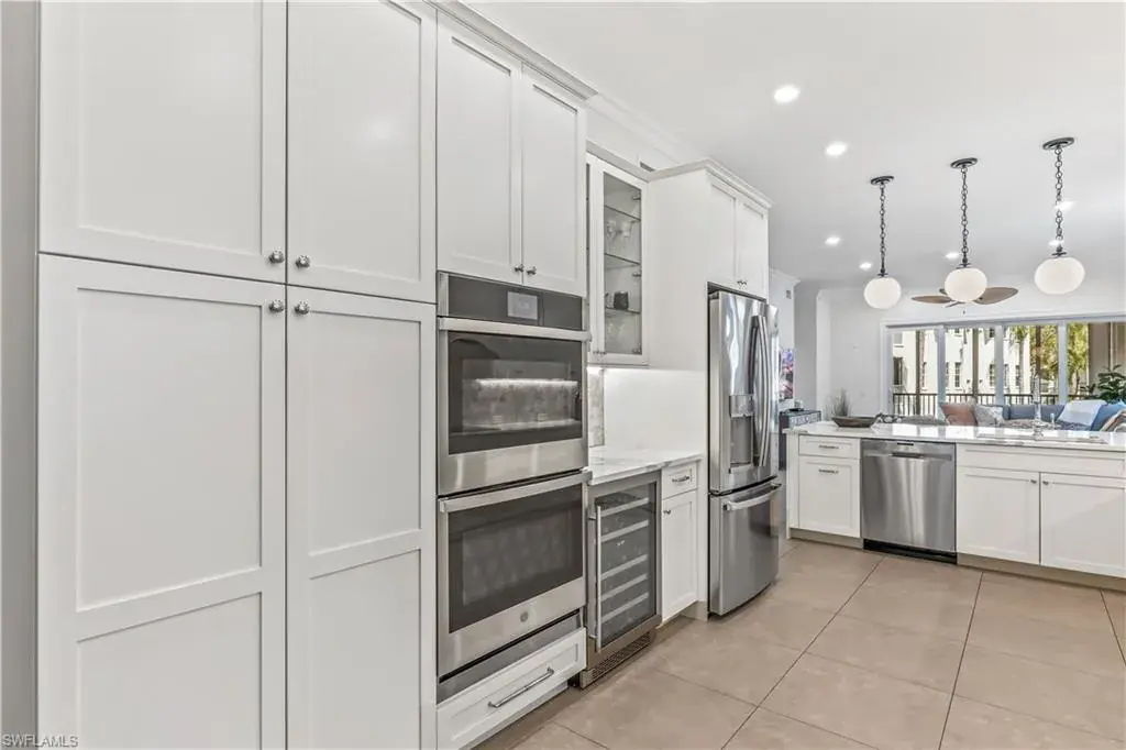 Updated in 2020! Stunning best describes this beautiful end-unit condo in the highly sought-after community of Breakwater at Pelican Bay. This recently updated three-bedroom spacious residence features an abundance of upgrades throughout. The third bedroom, which is a home office, includes a built-in queen-sized Murphy bed and features custom cabinetry with plenty of storage. Interior upgrades include tile and hardwood floors, custom built-in cabinets in the kitchen for additional storage, plantation shutters on all windows, and crown molding throughout the home. The well-appointed kitchen boasts sleek white cabinets with pull-outs, soft close doors and drawers, quartz counters, tile backsplash, and stainless steel appliances, including a double oven and wine chiller. The primary bedroom with an ensuite bath has also been updated with a large walk-in shower and soaking tub for relaxing. Additional features of the property include a new HVAC system (2022), a newer water heater (2017), a private 2-car garage, elevator access, a thermal slider door with privacy blinds, and a peaceful glass slider door/screened lanai for enjoying your morning coffee or afternoon cocktail. Breakwater amenities include a fitness room, pool, and spa. Membership in the prestigious Pelican Bay provides exclusive access to beaches, restaurants, tennis courts, fitness centers, and many other amenities for you to enjoy. This residence is a must-see! Pet-friendly, no pet restrictions!