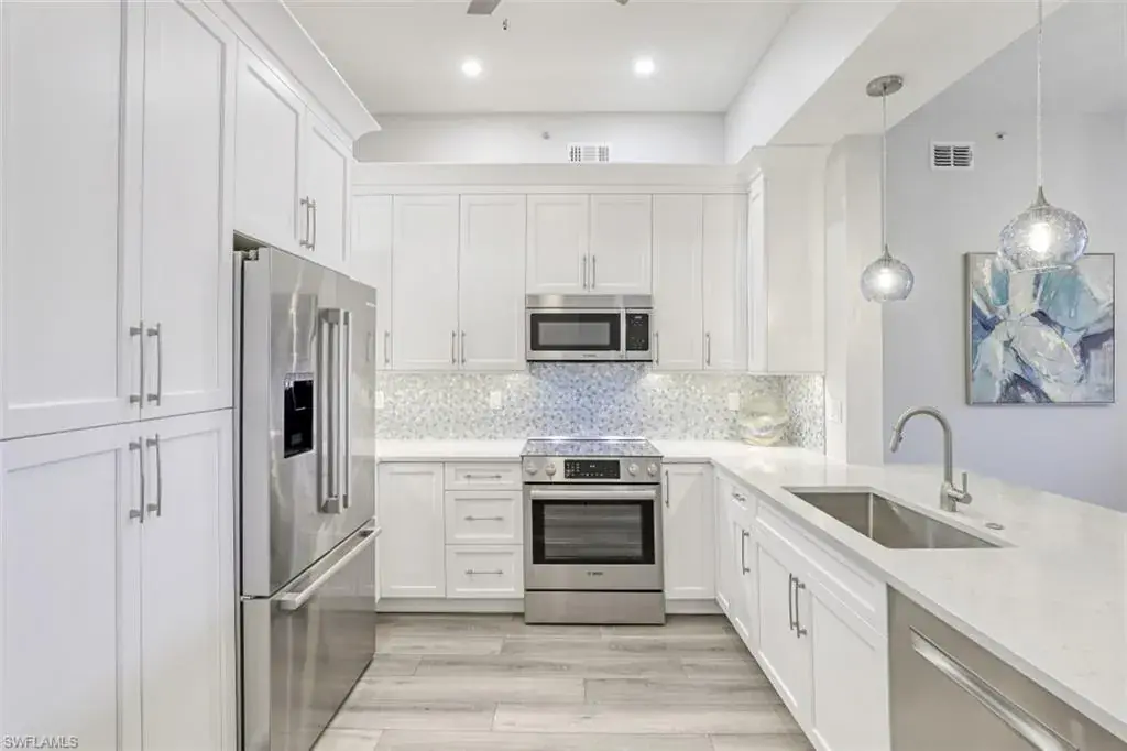 C7733 – Completely reimagined. No detail was overlooked! Walls and arches were removed to create a spacious open kitchen, overlooking the living area and peaceful lake in the distance. Features include a Bosch appliance package, Zephyr wine and beverage cooler, and gorgeous hand-blown artisan glass pendants. A large living area opens seamlessly to the oversized lanai for relaxing fountain views. Likewise, the sizeable Primary bedroom offers the best view of the lake and fountain, framed by palm trees. An amazing primary bathroom offers dual sinks, a soaking tub, separate shower, and striking waterfall tilework – it is truly spa-like and satisfying to all senses. A wonderful floor plan offers a private, quiet 2nd bedroom, a true 3rd bedroom, highlighted by glass-paneled French doors, and an adorable coastal guest bathroom. Quintessential laundry room with custom cabinetry, sink and walk-in storage. All new pipes, replacing the polybutylene pipes, new water heater, HVAC was new in 2019, new solid-core doors throughout, new floors, baseboards, kitchen, bathrooms, new, new, new. True to its name, the entire community of Breakwater was high and dry during Hurricane Ian.