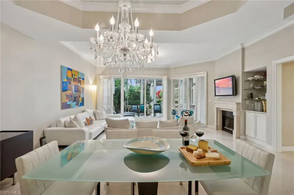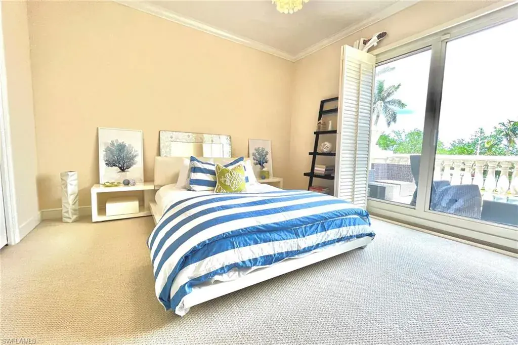 A scenic courtyard path leads directly to the beach, while a private boat slip (available for purchase) would allow you to conveniently dock your boat immediately across the street. The villa’s elegant interiors include marble floors, multiple wood burning fireplaces, and a spacious primary suite with partial Gulf views from its private enclosed balcony.