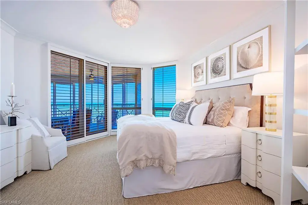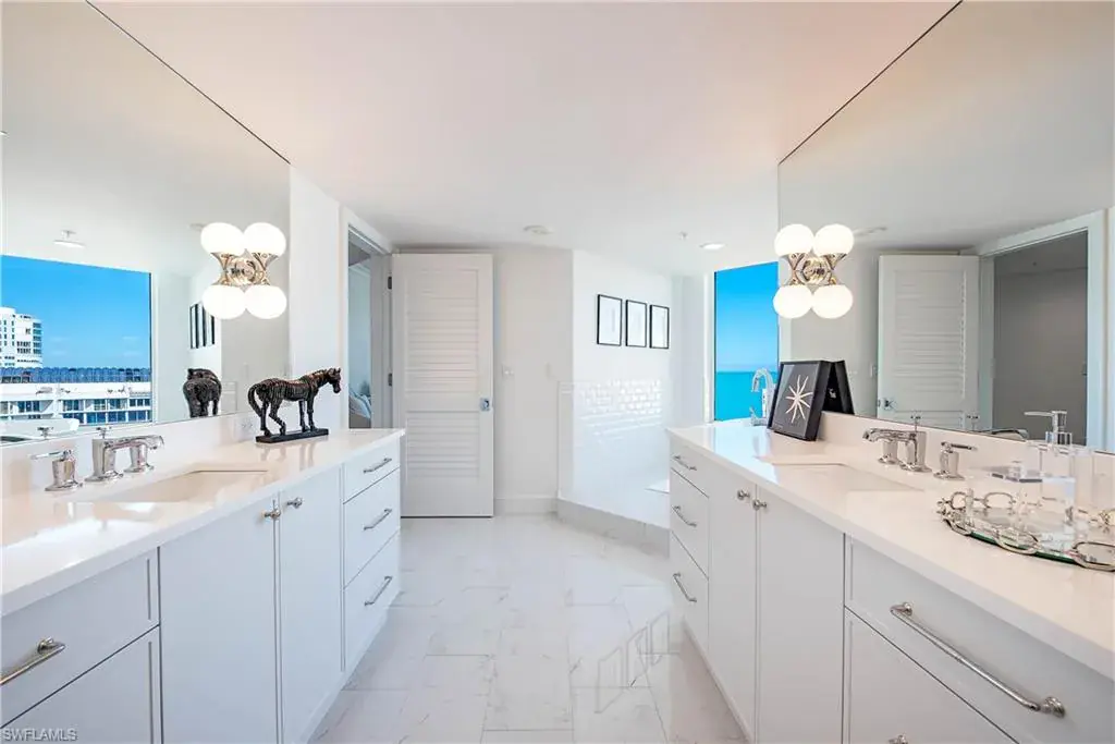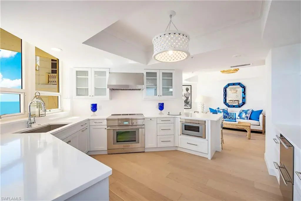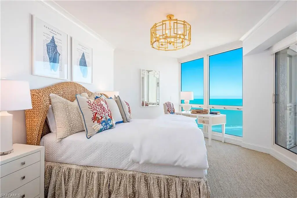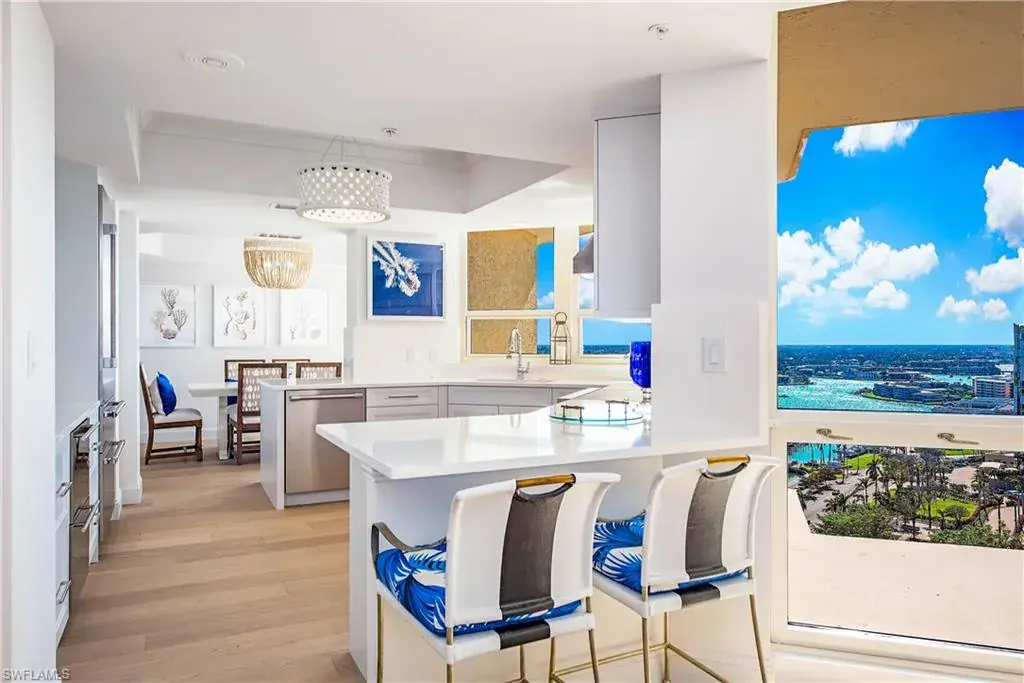 Remastered in 2024 with absolute sophistication by Joy Tribout Interior Design, this exquisitely updated 20th-floor residence in The Brittany at Park Shore is a true testament to luxurious elevated living. Positioned in the coveted ’05 stack, this haven captures breathtaking western Gulf views, serene bay vistas, and the sparkling cityscape at night, offering premier panoramic vistas from dual covered balconies and an abundance of natural light in every room. The carefully designed floor plan encompasses four en-suite bedrooms, four bathrooms, and 3,278 square feet of impeccable living space. Each spacious living area is refined with the finest custom finishes, including wide plank white oak flooring, beautifully remastered bathrooms, intricate ceiling details, and perfectly curated furnishings and fixtures. The gourmet kitchen features a top-tier Thermador appliance package, induction range, dual beverage drawers, and custom cabinetry and countertops. The primary bedroom en-suite includes a walk-in shower with multiple shower heads, dual sinks, oversized walk in closet, and soaking tub with tranquil views. Additional conveniences include electric shutters for privacy and storm protection, extra storage, and two secured, covered parking spaces, providing both peace of mind and exclusivity. This residence is offered fully turnkey, thoughtfully prepared for effortless and immediate enjoyment. The Brittany offers world-class amenities, including a resort-style beachfront pool and spa, a well-equipped fitness center, tennis courts, private beach access, elegant guest suites, and a social card room, all complemented by 24-hour security services. Ideally located just steps from Venetian Village, residents enjoy upscale dining, shopping, and entertainment, with proximity to destinations like Waterside Shops, Artis-Naples, and Mercato, as well as the charm of 5th Avenue South and 3rd Street South. Boating enthusiasts have the rare opportunity to lease or purchase boat slips at the Venetian Yacht Club, adding a maritime dimension to this living experience. This residence offers an unmatched blend of timeless sophistication, modern comfort, and the serene beauty of Naples’ coastal lifestyle.