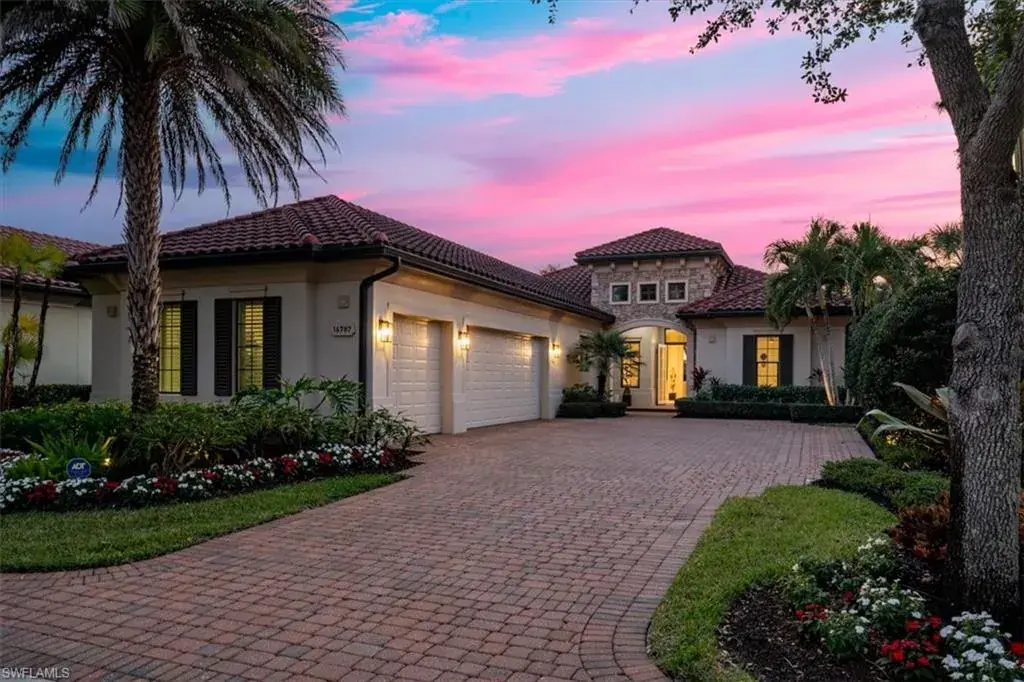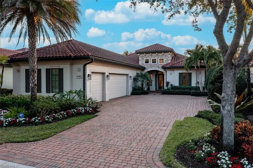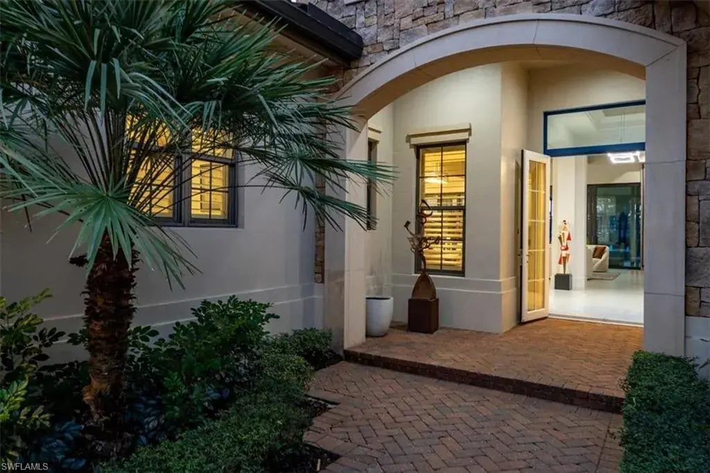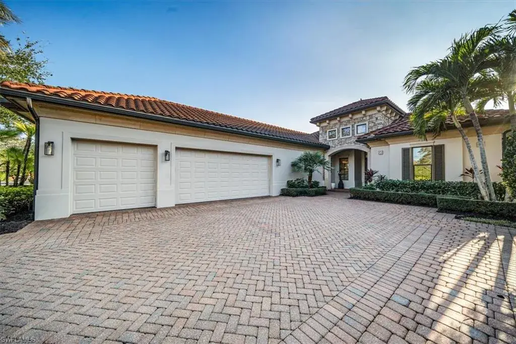 Welcome to this exquisitely upgraded 2016 custom built London Bay single-family home in the prestigious Mediterra community. Featuring western exposure, this 4-bedroom, 4-bathroom smart home is equipped with a Control 4 system and Sonos sound system for seamless modern living. The “Bettina” open-concept floor plan impresses with soaring ceilings, extensive millwork, and refined details, including deep baseboards, ceiling trim, and a custom media wall.  The gourmet kitchen is a chef’s dream, boasting high-end shaker-style cabinetry, a wooden furniture styled range hood, natural gas cooktop, wine refrigerator, walk-in pantry, quartz countertops, and ample workspace. It flows effortlessly into the breakfast nook and great room, perfect for entertaining. The owner’s suite features hardwood floors, a vestibule, and two custom walk-in closets. The spa-inspired bath offers a serene retreat with an oversized vanity, floating porcelain tub, and a walk-in shower with bench seating. All guest suites include hardwood floors, large closets, and full baths for ultimate comfort.   Additional features include a convenient drop zone with a built-in desk, extra storage, and an oversized 3-car garage. The outdoor living area is a showstopper, with a spacious covered lanai featuring a media wall, gas fireplace, and summer kitchen with stacked stone, stucco, and built-in grill and refrigeration. The pool area is adorned with light stone decking, cascading waterfalls, fountains, and fire bowls, creating a luxurious oasis. Enjoy tranquil lakefront views and lush tropical landscaping. Electric storm shutters and a full 22 KW generator provide added peace of mind. With impact glass windows, stunning curb appeal, and Mediterra’s world-class amenities—including a beach club, tennis, pickleball, wellness center, and two Tom Fazio-designed golf courses—this home offers the perfect blend of luxury, style, and functionality