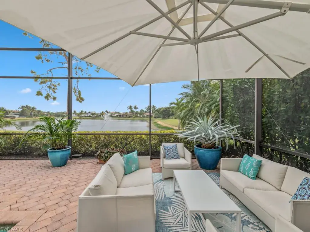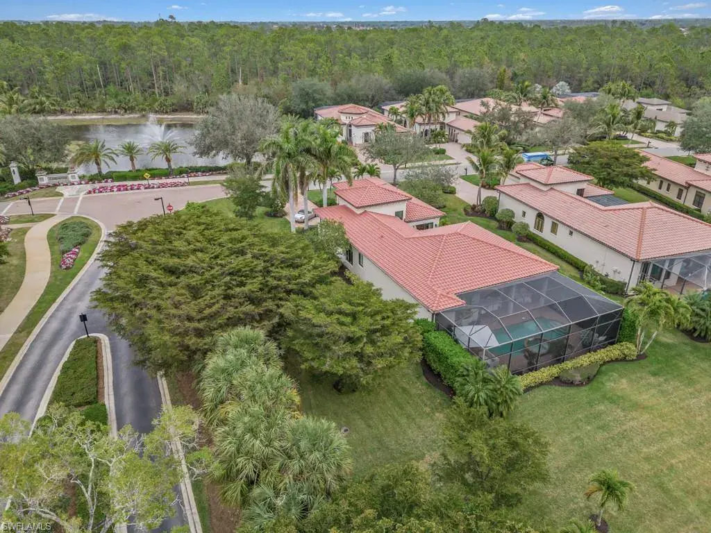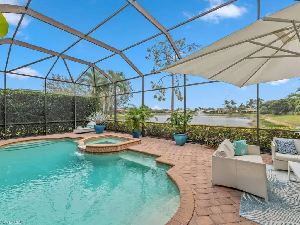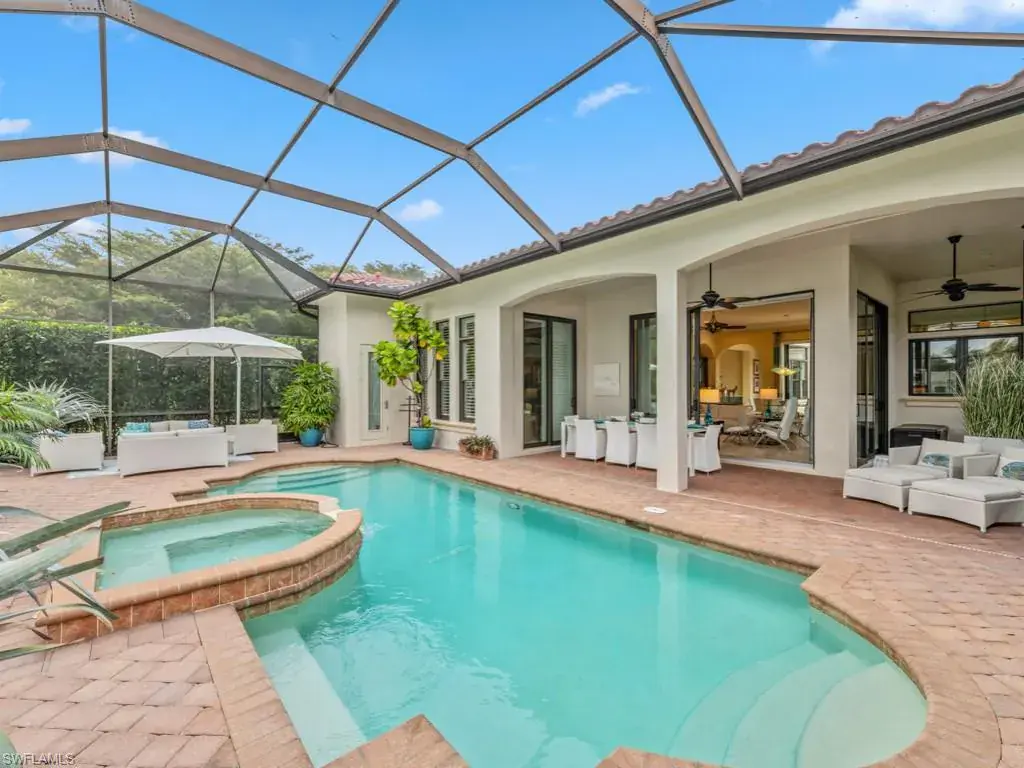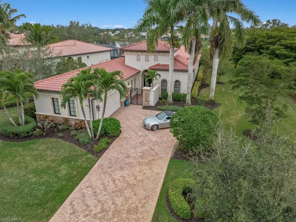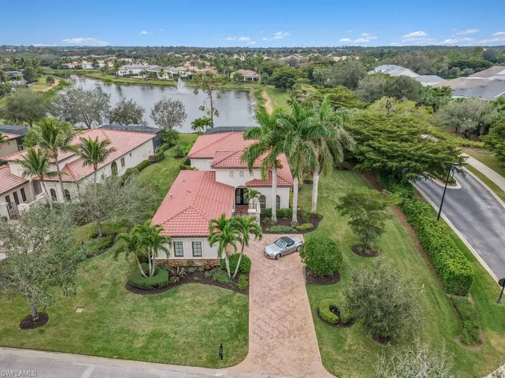 Located in the beautiful Mediterra Golf & Country Club of Naples that offers a newly renovated private beach club for residents – This stunning home combines refined architecture with modern luxury, starting with the striking curb appeal with lush landscaping, lakes with fountains both in front and behind the house, and the spacious paver driveway, which leads past iron gates and stone-accented pillars into a private courtyard entry. The foyer emphasizes an open and welcoming atmosphere with soaring ceilings, arched passageways, and gentle, neutral tones. The sunlit den is located just beyond the foyer, which functions as a private office with courtyard access through tall sliding doors. The formal dining room exudes style & sophistication with a beautiful glass table and tasteful contemporary décor. The main living areas accommodate open-concept design, allowing seamless flow between spaces, incorporating modern design elements, stylish furniture, and abundant natural lighting through the wall of tall glass sliding doors connecting the Living and outdoor spaces. The Gourmet kitchen is full of light with a private courtyard adjacent and features a walk-in pantry, premium Monogram appliances, beautiful wood cabinetry, granite countertops wrapped around the gas cooktop, double wall ovens, and a breakfast bar. Just a few steps from the kitchen is a convenient bar with its own wine cooler, perfect for entertaining. The primary suite is indulgent, with two walk-in closets, private outdoor access, a quiet sitting area, and a spa-inspired bath equipped with a separate tub & shower, dual vanities, modern fixtures, and tasteful finishes. The guest bedrooms are spacious and well-appointed, with contemporary décor, large windows, and en-suite bathrooms. The large screened outdoor area is the perfect gathering space to soak in those sunny days. A generous-sized pool & spa are the centerpiece. It includes an outdoor kitchen, dining space, and lounge seating, creating a perfect oasis for relaxation & entertainment with the delightful backdrop of vibrant landscaping and a sparkling lake in the backyard. Mediterra is a prestigious luxury golf & country club community featuring Two championship Tom-Fazio golf courses for avid golfers, multiple tennis courts, pickle-ball & bocce, fitness center, pristine bike & jogging trails, and luxurious dining at the private country club restaurant. The Mediterra Beach Club offers an escape to a 10,000 sq. ft two-story private oceanfront paradise on the Gulf of Mexico. Featuring a restaurant & bar that serves members via indoor & outdoor dining, this private facility boasts a heated swimming pool, a sundeck, and cabana beach service for chairs, umbrellas & refreshments.