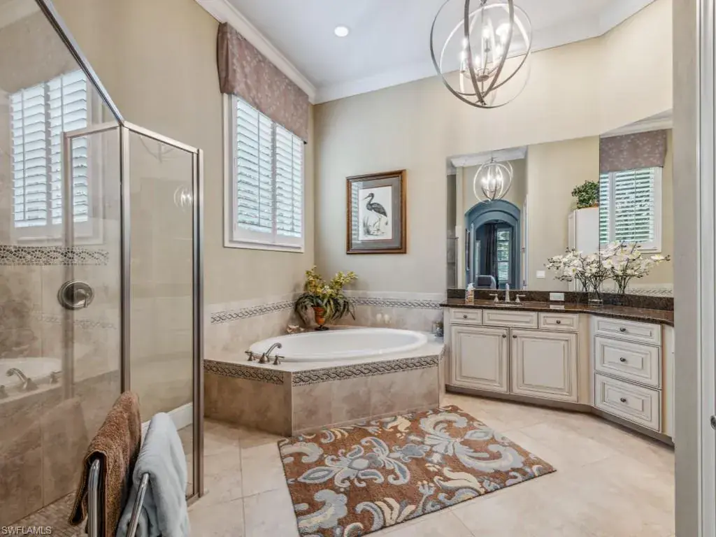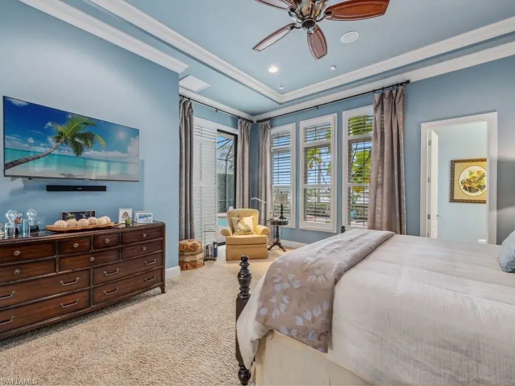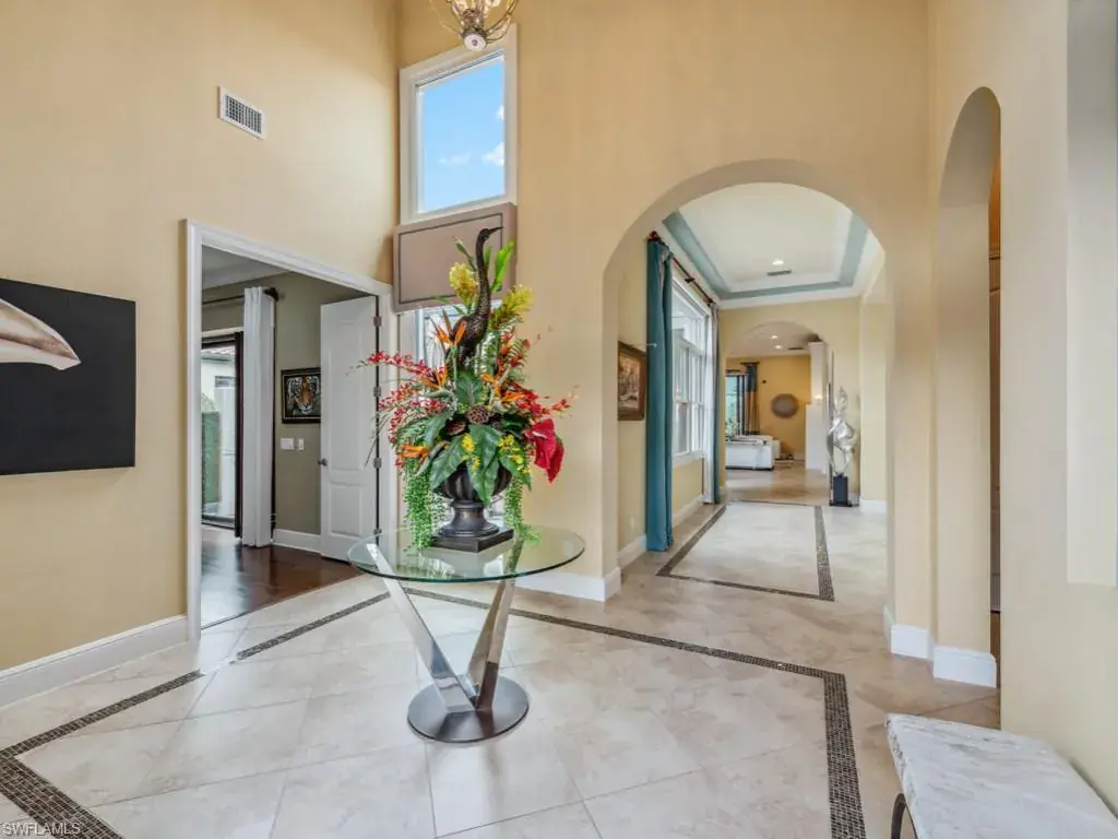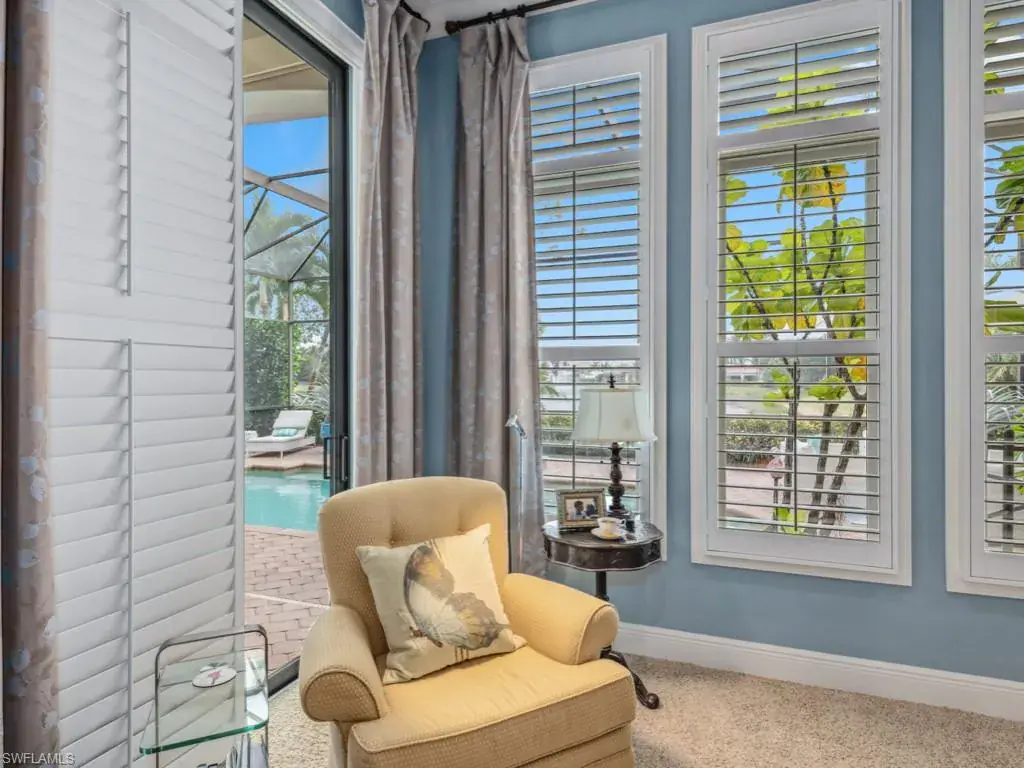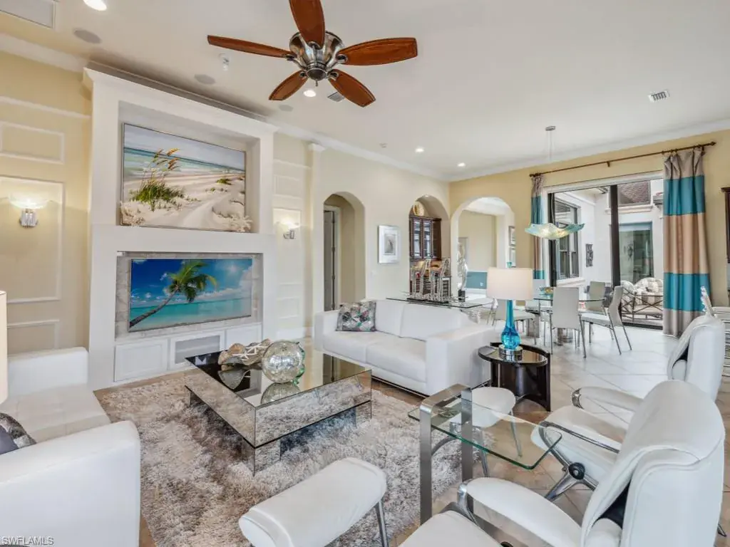 Located in the beautiful Mediterra Golf & Country Club of Naples that offers a newly renovated private beach club for residents – This stunning home combines refined architecture with modern luxury, starting with the striking curb appeal with lush landscaping, lakes with fountains both in front and behind the house, and the spacious paver driveway, which leads past iron gates and stone-accented pillars into a private courtyard entry. The foyer emphasizes an open and welcoming atmosphere with soaring ceilings, arched passageways, and gentle, neutral tones. The sunlit den is located just beyond the foyer, which functions as a private office with courtyard access through tall sliding doors. The formal dining room exudes style & sophistication with a beautiful glass table and tasteful contemporary décor. The main living areas accommodate open-concept design, allowing seamless flow between spaces, incorporating modern design elements, stylish furniture, and abundant natural lighting through the wall of tall glass sliding doors connecting the Living and outdoor spaces. The Gourmet kitchen is full of light with a private courtyard adjacent and features a walk-in pantry, premium Monogram appliances, beautiful wood cabinetry, granite countertops wrapped around the gas cooktop, double wall ovens, and a breakfast bar. Just a few steps from the kitchen is a convenient bar with its own wine cooler, perfect for entertaining. The primary suite is indulgent, with two walk-in closets, private outdoor access, a quiet sitting area, and a spa-inspired bath equipped with a separate tub & shower, dual vanities, modern fixtures, and tasteful finishes. The guest bedrooms are spacious and well-appointed, with contemporary décor, large windows, and en-suite bathrooms. The large screened outdoor area is the perfect gathering space to soak in those sunny days. A generous-sized pool & spa are the centerpiece. It includes an outdoor kitchen, dining space, and lounge seating, creating a perfect oasis for relaxation & entertainment with the delightful backdrop of vibrant landscaping and a sparkling lake in the backyard. Mediterra is a prestigious luxury golf & country club community featuring Two championship Tom-Fazio golf courses for avid golfers, multiple tennis courts, pickle-ball & bocce, fitness center, pristine bike & jogging trails, and luxurious dining at the private country club restaurant. The Mediterra Beach Club offers an escape to a 10,000 sq. ft two-story private oceanfront paradise on the Gulf of Mexico. Featuring a restaurant & bar that serves members via indoor & outdoor dining, this private facility boasts a heated swimming pool, a sundeck, and cabana beach service for chairs, umbrellas & refreshments.