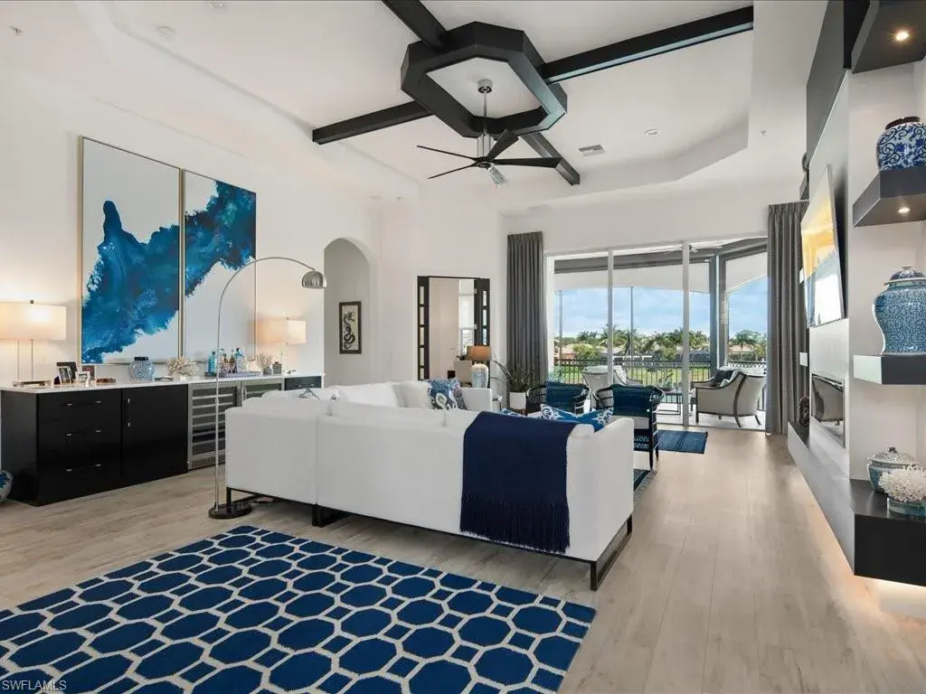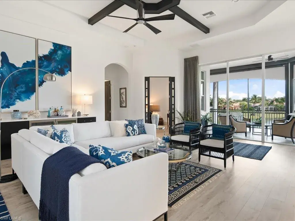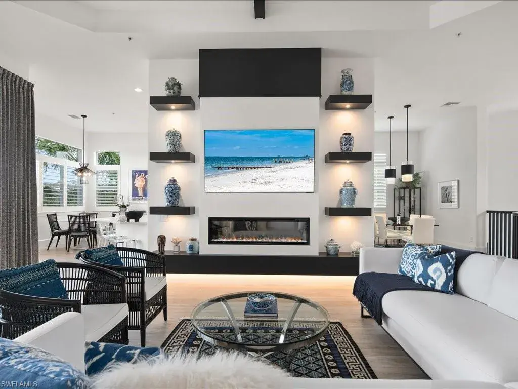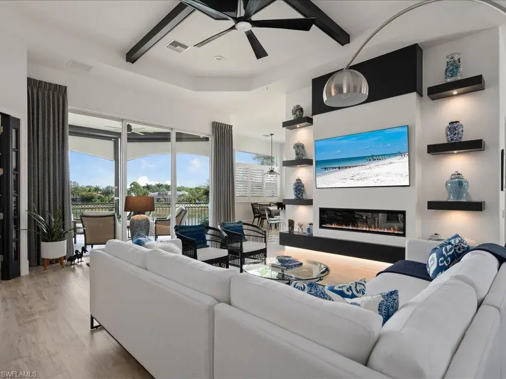 This stunning 2nd floor coach home in Mediterra has been totally renovated and professionally decorated with high end furnishings and finishes. The 3 bedroom/3 bath plus study residence features an open layout that evokes casual elegance and comfort. Interior details include a private entry elevator, new flooring, linear fireplace flanked with floating shelves, built-in with 2 wine refrigerators, designer kitchen with high-end stainless-steel appliances, natural gas and quartz countertops. Large primary suite offers a spa like bathroom with free standing tub and additional 8′ closet.