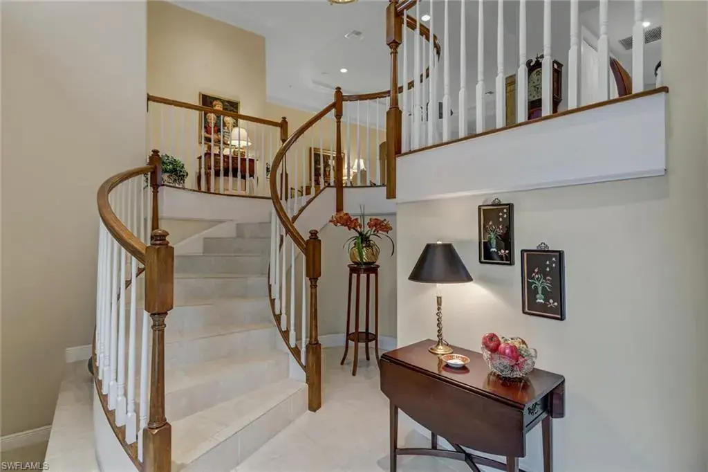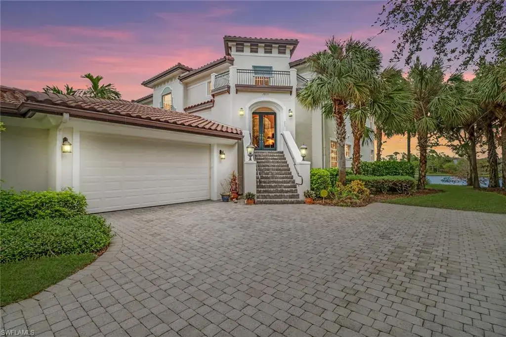 Seldom seen available, this end unit coach home sits in the cul de sac and is surrounded by beautiful lake views in the highly desirable community of Calabria of Mediterra. A meticulously maintained second floor unit featuring three bedrooms (plus den), private elevator, three baths and a two-car garage. First to welcome you in the home is a grand foyer and spiral staircase leading you to the great room with voluminous ceilings that flow perfectly into the kitchen with an Induction Cooktop. There is casual dining in the kitchen, as well as a formal dining room. An abundance of natural light fills the space with water views at every angle. The Primary suite feels like a retreat featuring oversized picture windows, tray ceilings and expansive lake views. Enjoy the countless amenities of the community and moreover, entertain your friends and family on your oversized screened lanai. The Club at Mediterra offers its residents two 18-hole Tom Fazio designed golf courses, a sports facility with world-class tennis courts and member access to the private beach club!