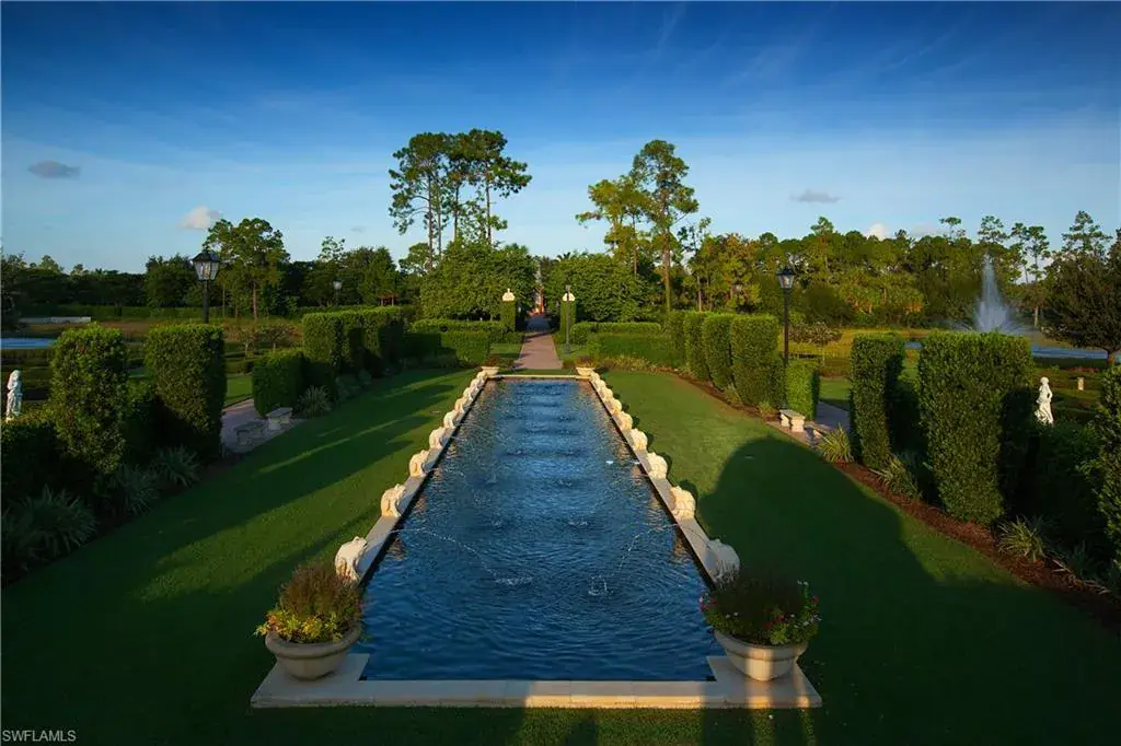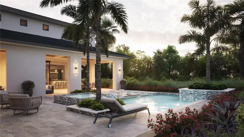 sparkle on the waterlines of the pool and spa. The pools sun shelf is accented by a raised planter with cascading waterspouts to provide added serenity. The elegant master suite features two spacious walk-in closets and a lavish private bathroom with a freestanding tub, dual vanities and a large shower. The home also offers a ground-floor guest suite, two bedrooms and a large covered balcony on the second floor. As a resident of Mediterra, homeowners have the opportunity to enjoy the community’s world-class amenities, including a 60,000-square-foot clubhouse, Sports Club, and Beach Club. Expected completion date of December 2025.
