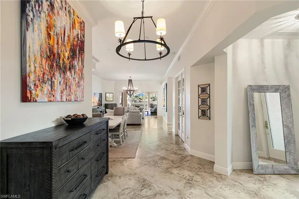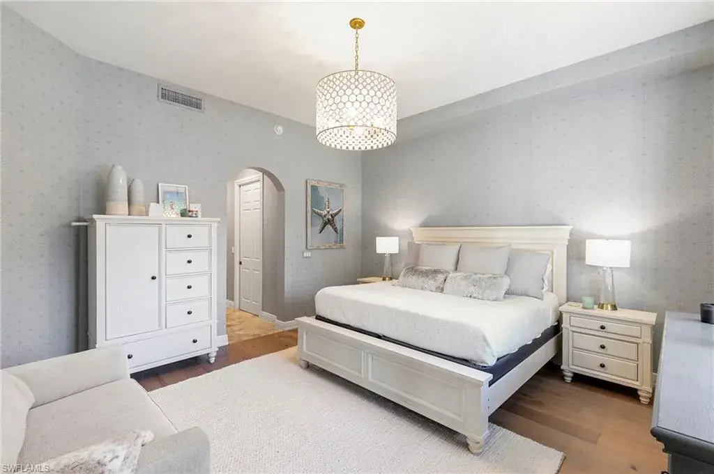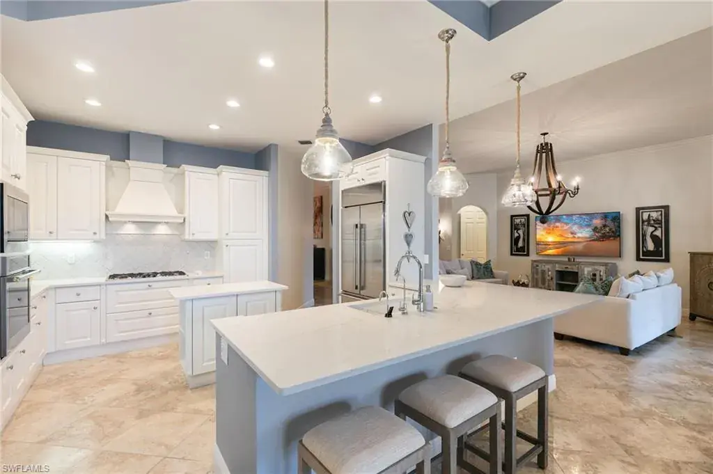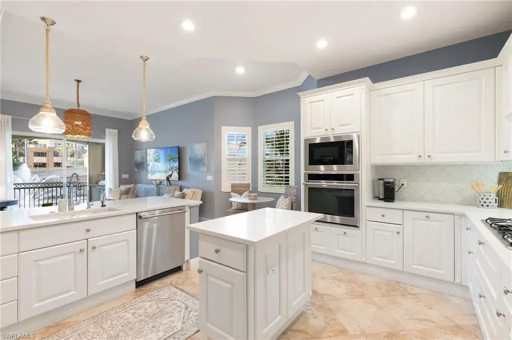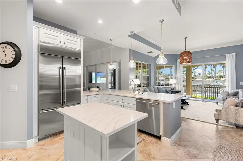 Just a short stroll to the Pelican Bay beach tram and steps from the community pool, you’ll have convenient access to private beachfront dining, white-sand shores, and Gulf waters. Inside, the remodeled gourmet kitchen is a showstopper, featuring a gas stove, stainless steel appliances, off-white cabinetry, and striking quartz countertops—perfectly positioned in an open-concept design that flows into the dining, living, and outdoor spaces. Soaring 11-foot ceilings and expansive windows frame water views from the main living areas and the luxurious primary suite.