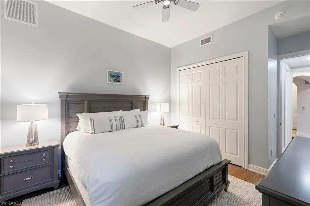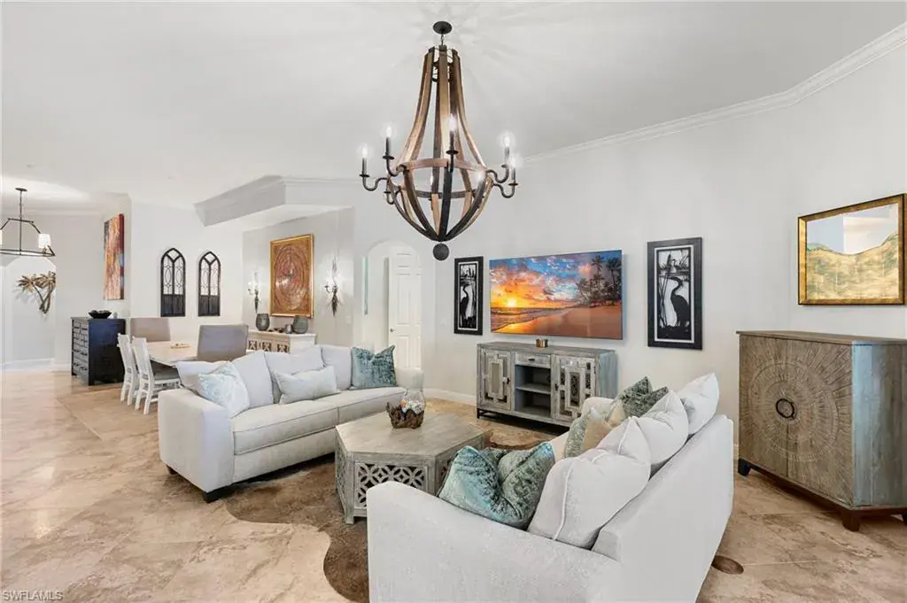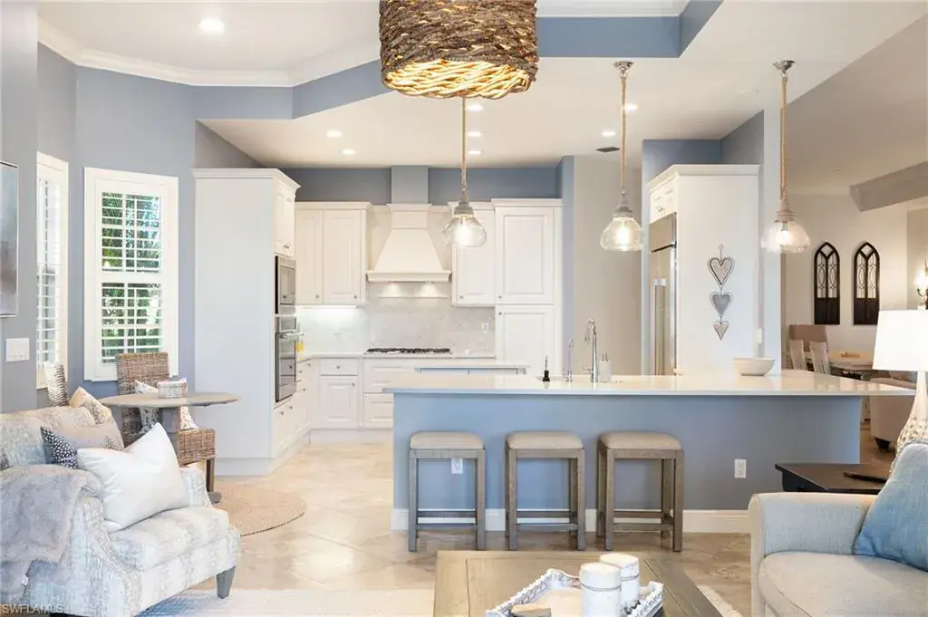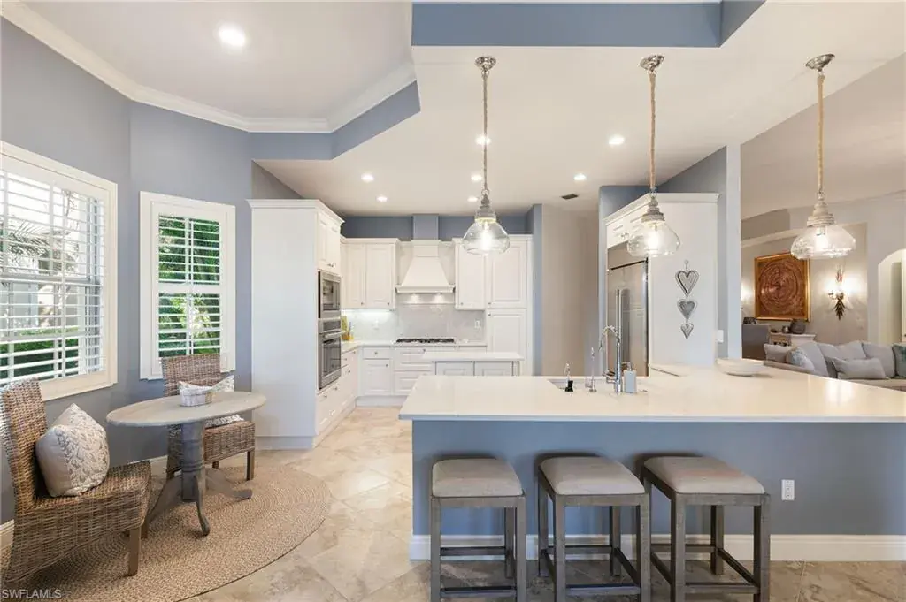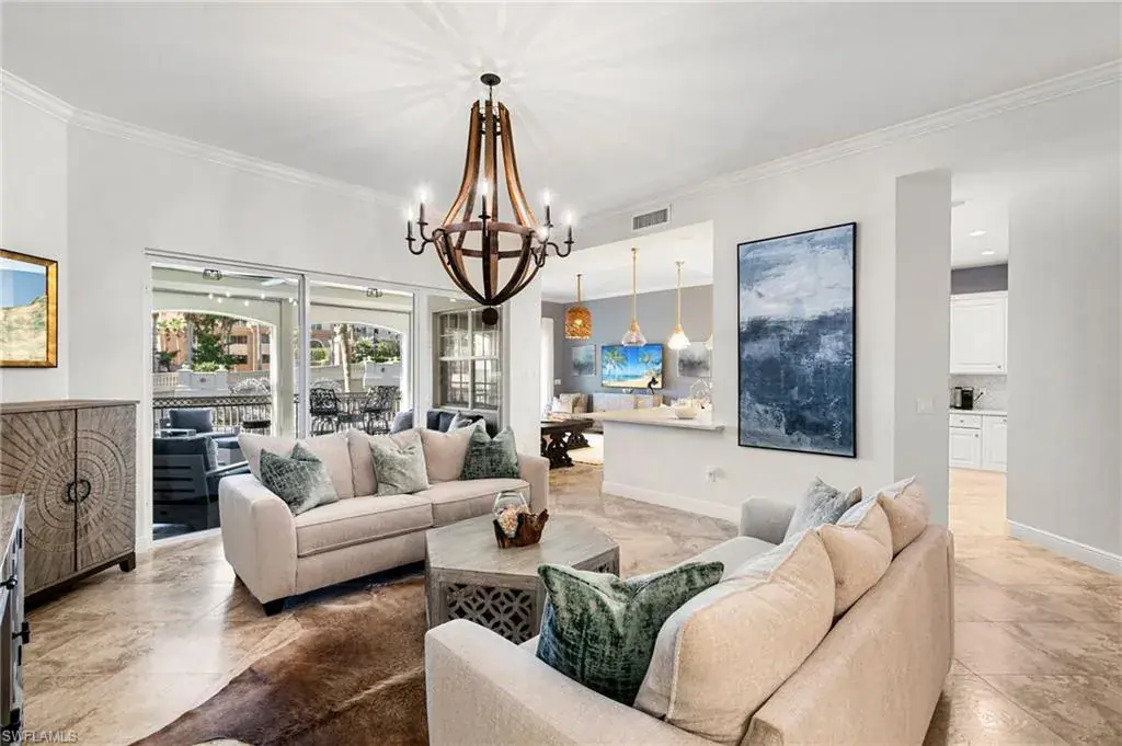 Just a short stroll to the Pelican Bay beach tram and steps from the community pool, you’ll have convenient access to private beachfront dining, white-sand shores, and Gulf waters. Inside, the remodeled gourmet kitchen is a showstopper, featuring a gas stove, stainless steel appliances, off-white cabinetry, and striking quartz countertops—perfectly positioned in an open-concept design that flows into the dining, living, and outdoor spaces. Soaring 11-foot ceilings and expansive windows frame water views from the main living areas and the luxurious primary suite.