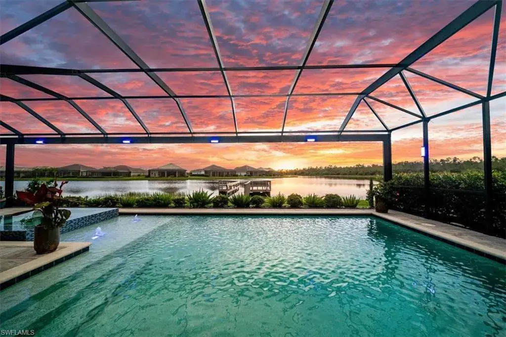 WOW!! Completely upgraded and decked out!! Indulge in the pinnacle of luxury living at Naples Reserve with this exquisite 2020 Stock-built masterpiece, where every detail has been thoughtfully crafted. Offering 4,050 total sq ft of opulent indoor and outdoor living space, this residence is set on an oversized Western rear exposure lot, providing breathtaking sunset views over the lake, complete with a private dock. Inside, discover 4 spacious bedrooms, 3.5 beautifully appointed bathrooms, and soaring volume ceilings adorned with custom coffered details. The chef’s kitchen is a culinary dream, boasting an expansive island, premium JennAir appliances, ample cabinetry, a walk-in pantry, a stand-alone ice maker, wine cooler, and trash compactor. The great room, enhanced with floating shelves, shiplap wall treatments, and a sleek linear fireplace, opens to a large, covered lanai, creating a seamless blend of indoor and outdoor living. The guest suites are thoughtfully designed with large closets, ceiling fans, and soothing neutral tones. The home is fully equipped with cutting-edge smart home technology, allowing you to control everything from blackout shades and surround sound to music, lighting, and security via iPad or Alexa. Additional top-tier upgrades include a 500-gallon propane tank for the whole-home generator, a spa, fireplace, cooktop, electric keypad and locks, instant hot water heater, upgraded electrical panel, enhanced landscaping, custom closets, and custom pool/lanai lighting. For the car enthusiast the garage boasts epoxy flooring, remote drop storage shelves. The expansive outdoor living area, complete with an outdoor kitchen, oversized salt-water pool, integrated spa, and panoramic screened lanai overlooking the long lake view, offers the perfect setting for relaxation and entertainment. Nestled within an exclusive gated community, Naples Reserve offers unparalleled amenities, including a clubhouse, lakefront beach and marina, restaurant, café, tiki bar, dog park, fitness center, volleyball, basketball, tennis, sand volleyball, pickleball courts, and more.