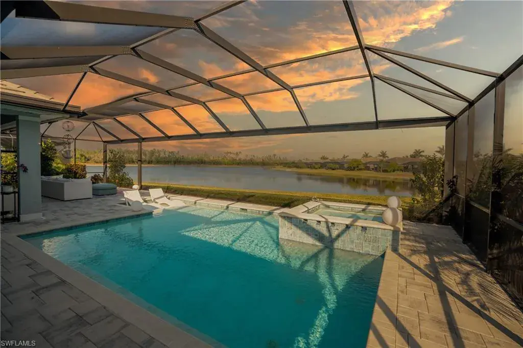 Smart home enthusiasts will appreciate the surround sound speakers inside and on the lanai, smart controls, and TVs in every room. The home also includes an EV charger in the garage, epoxy flooring, and a Husky work station for practicality.Step outside to the expansive lanai, overlooking the tranquil lake with picture-framed screens and landscaping that perfectly frame the views. The oversized pool has a sunbed, autofill, and jetted spa. The outdoor kitchen features a Coyote grill, wine coolers, a refrigerator, food warmer, and Weréver cabinetry, along with a bar, TV, and ceiling fan for the perfect atmosphere.