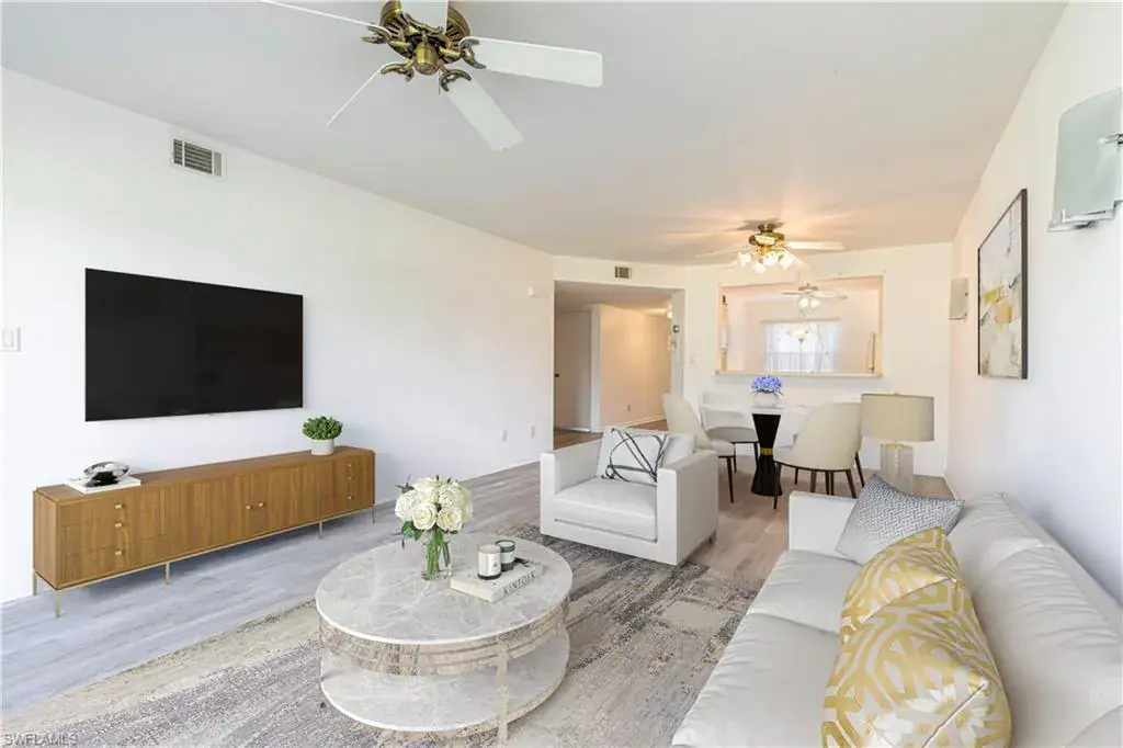 Unlock the door to your dream home with the power of a potential mortgage rate buy down. Nestled amidst the serene beauty of Naples, just minutes away from our white sandy beaches and world-class shopping, Canterbury Village offers a tranquil oasis for those seeking the perfect blend of luxury and convenience. With new floors and vanities, this 2-bedroom, 2-bathroom condo is an ideal retreat for discerning residents. As you step inside, you’re greeted by an inviting atmosphere accentuated by an abundance of natural light. The spacious living area provides ample room for relaxation and entertainment. The adjoining kitchen hosts a breakfast area making this an ideal space for culinary enthusiasts and casual diners alike. The master suite is a sanctuary of comfort, featuring a generously sized bedroom, a walk-in closet, and an en-suite bathroom. The second bedroom offers versatility and can serve as a guest room, home office, or cozy den, adapting effortlessly to your lifestyle needs. Outside, a private patio beckons you to unwind amidst the lush surroundings, providing the perfect spot to savor your morning coffee or bask in the gentle Florida breeze. Canterbury Village presents an array of amenities designed to enhance your living experience, including a sparkling swimming pool and meticulously landscaped grounds. This prime location affords easy access to the vibrant cultural scene, upscale shopping destinations, and pristine beaches that define Naples living.