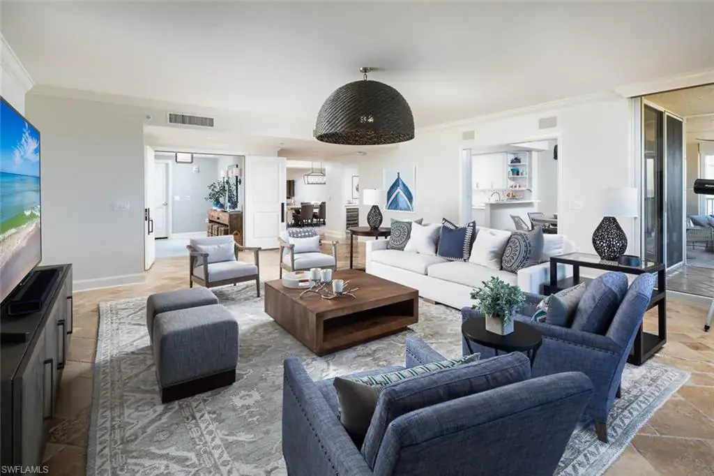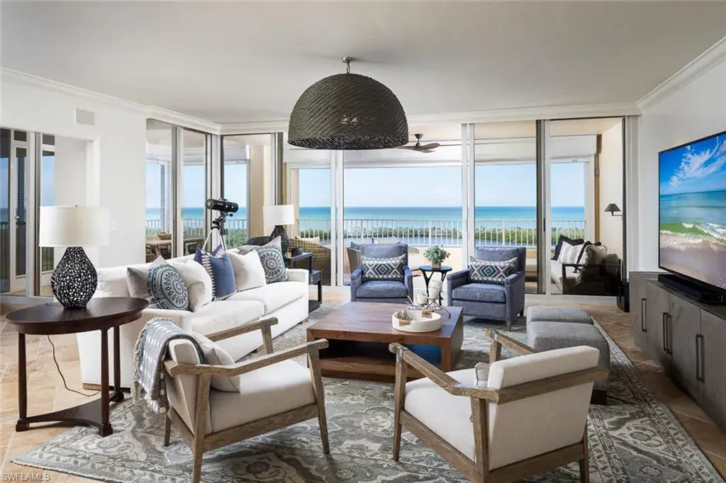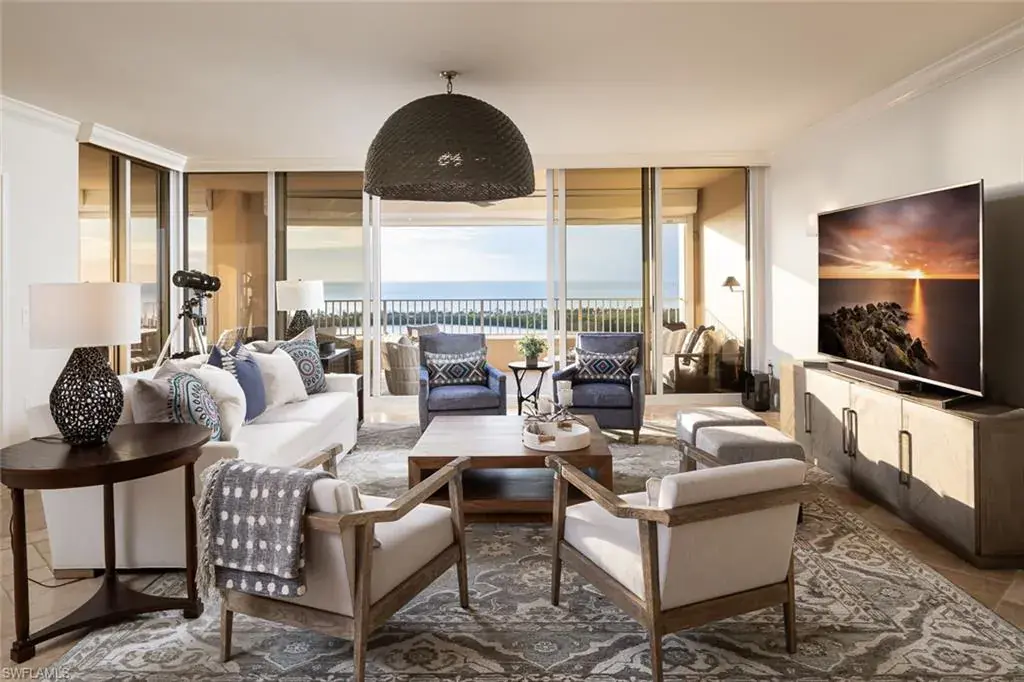 With 4,575 square feet of living space, including 925 square feet of private covered outdoor terrace space, take in breathtaking panoramic views of the Gulf of Mexico to the west and the Pelican Bay cityscape to the east. Revel in unmatched, sweeping views that stretch from the serene shores of Park Shore to the distant charm of Sanibel, offering a truly breathtaking setting for a refined lifestyle. Poised elegantly on the 14th floor, this prized 03 Cap Ferrat residence boasts four bedrooms, a versatile den, and expansive living spaces complete with two garage spaces. Step off the elevator into a private foyer that flows into the impeccably designed interiors curated by the esteemed Calusa Bay Design team. The living room showcases mesmerizing Gulf views, while the rear-facing den captures the vibrant city skyline. Each generously proportioned bedroom includes an en-suite bath, ensuring comfort and privacy for all.
