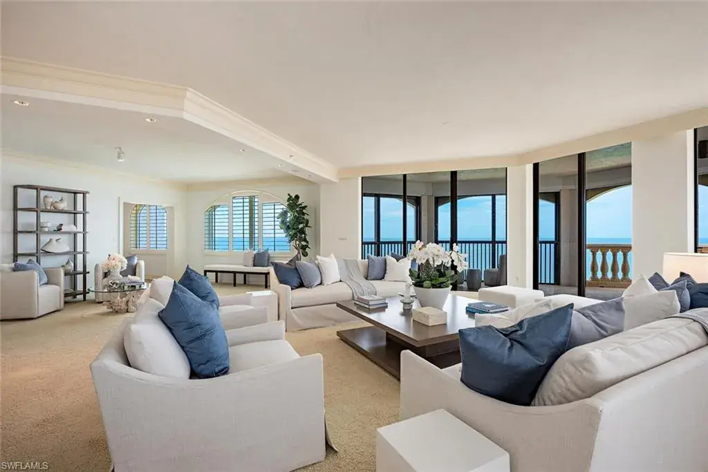 This Beachfront Bay Colony Carlysle Penthouse North LEGACY property comes to market after 25 years of single ownership. Current owners shared a lifetime of happy memories, and they now offer you an exceptional invitation to create delightful memories of your own. Designed for sensible, family-friendly living, all on one level, this gem highlights an expansive owner’s suite to the south, and a generous guest wing to the north. Every room maximizes stunning Sunrise-Bay-to-Sunset-Gulf panoramic forever vistas, opening to multiple screened lanais or wraparound open-air and covered terraces.  Included is also an attractive, updated pool-side cabana complete with full bath. Lovingly cared for, and in pristine condition, this Penthouse gem may be purchased with the Meredith Baer Homes furnishings presented, making your dream of a 2025 respite in the sun simply EZ breezy! Enjoy World Class Bay Colony and Pelican Bay included membership privileges: 3 private Beachfront Dining Clubs, located on 2½ miles of pristine sugar white sandy beach, attended Beachfront services, 3 active Tennis Clubs, miles of walk and bike paths, state-of-the-art Fitness & Lifelong Learning & Wellness Center. Artis Center for Performing Arts, Mercato, and Waterside Shops just steps away.