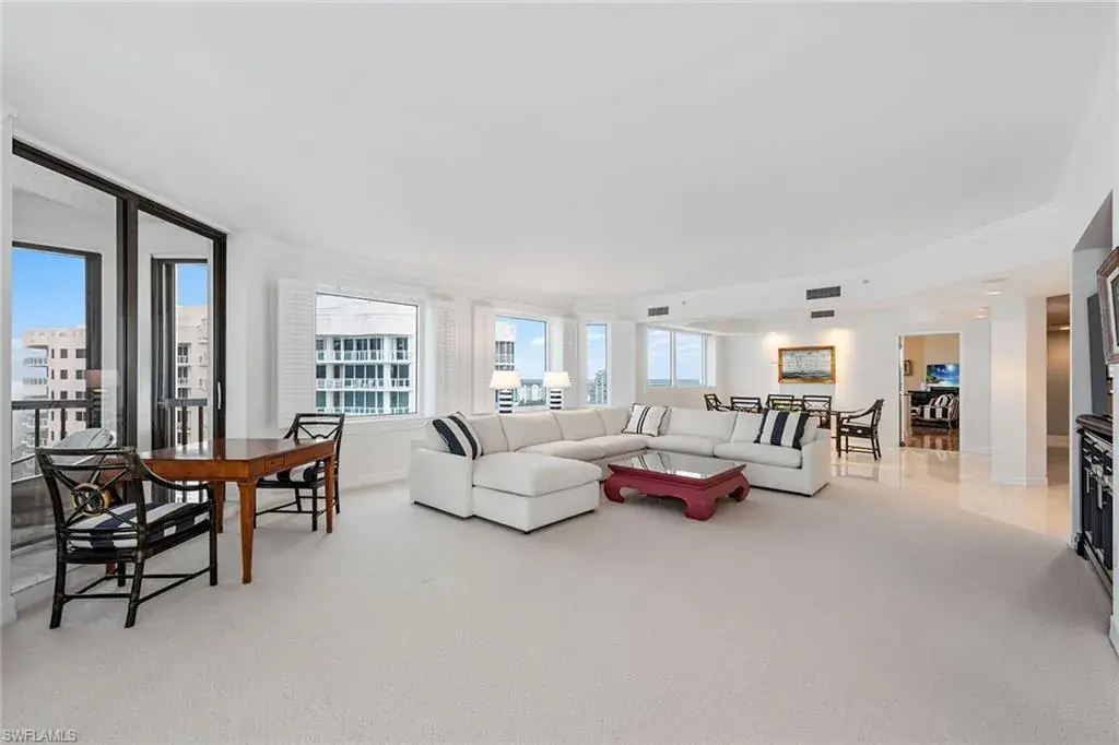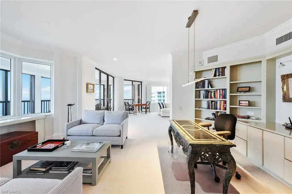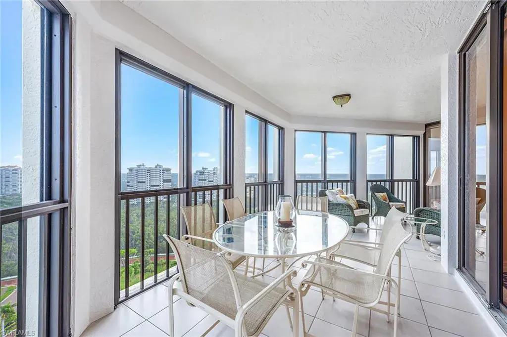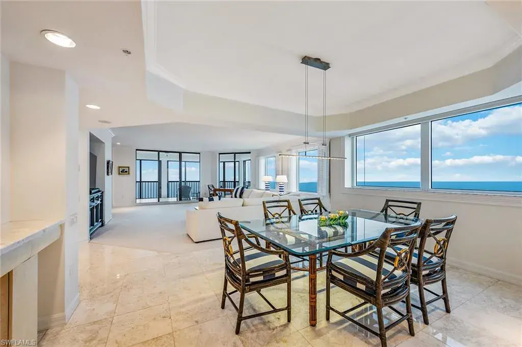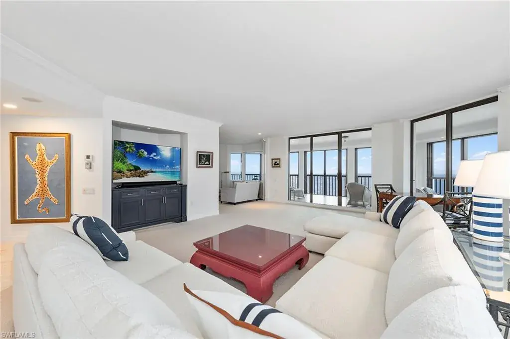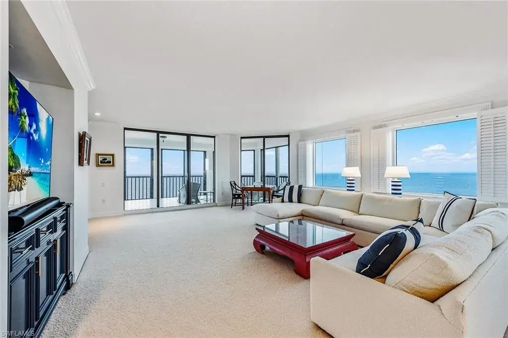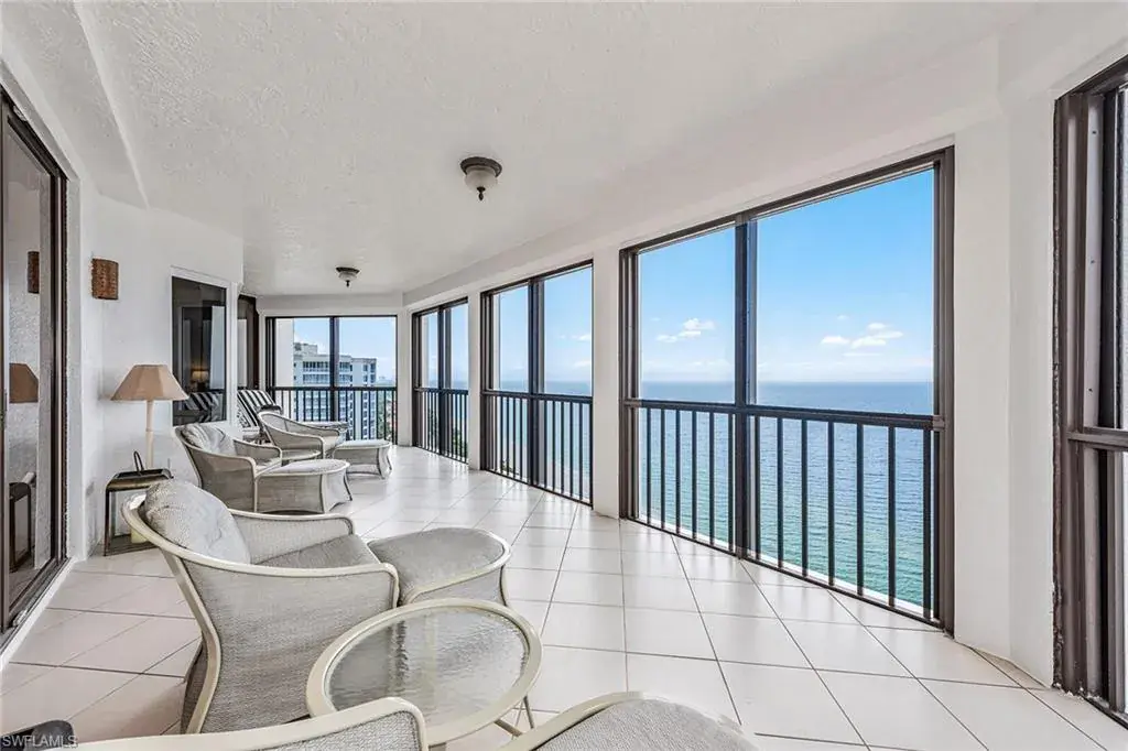 Gorgeous gulf and beach views! High-floor gulf view residence directly on the beach in the private gated community of Bay Colony. Featuring panoramic views of the Gulf of Mexico through hurricane-impact glass picture windows and floor-to-ceiling glass sliders off the main living area and the primary bedroom. This highly sought-after design welcomes you into an elegant entry foyer and spacious living area boasting tile, elegant moldings, lighting and trim and a separate dining area. The open kitchen with casual den area offers plenty of room for entertaining family and guests including two full guest bedrooms, both with en-suite baths. Extra storage at lobby level. The Carlysle amenities include an impeccable lobby with 24-hour staffed front desk, two guest suites, fitness center, social rooms and a resort-style pool. Bay Colony residents enjoy the use of their private beach club and restaurant, a tennis club, as well as use of amenities of Pelican Bay.