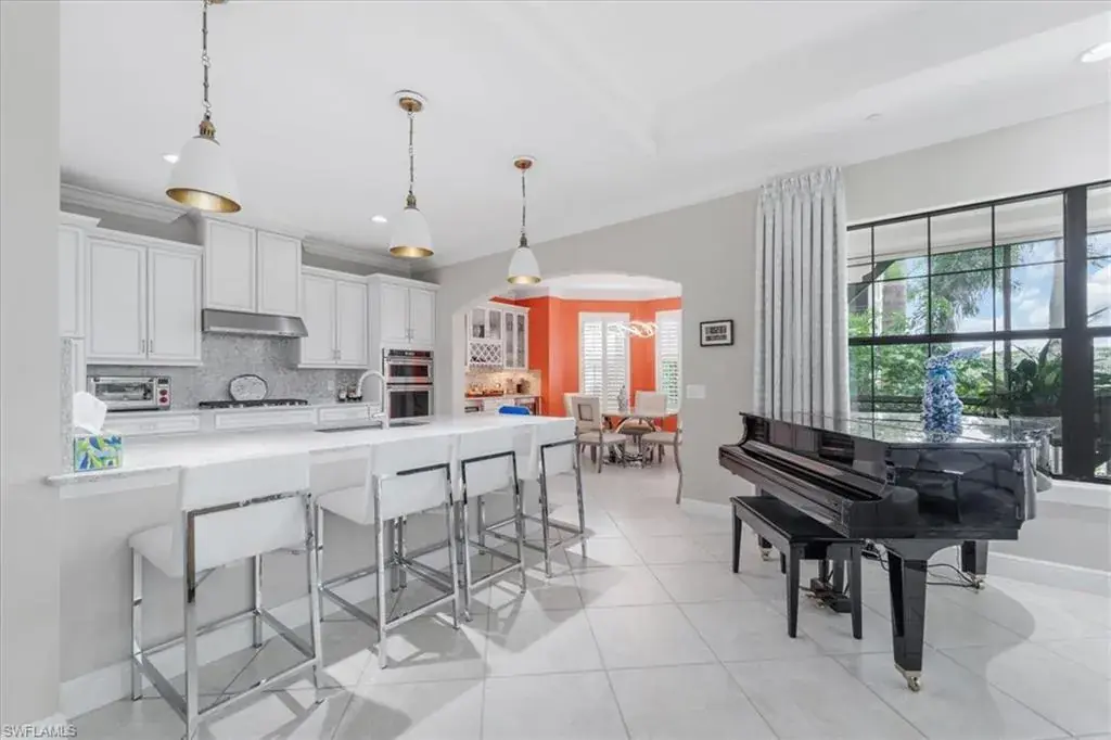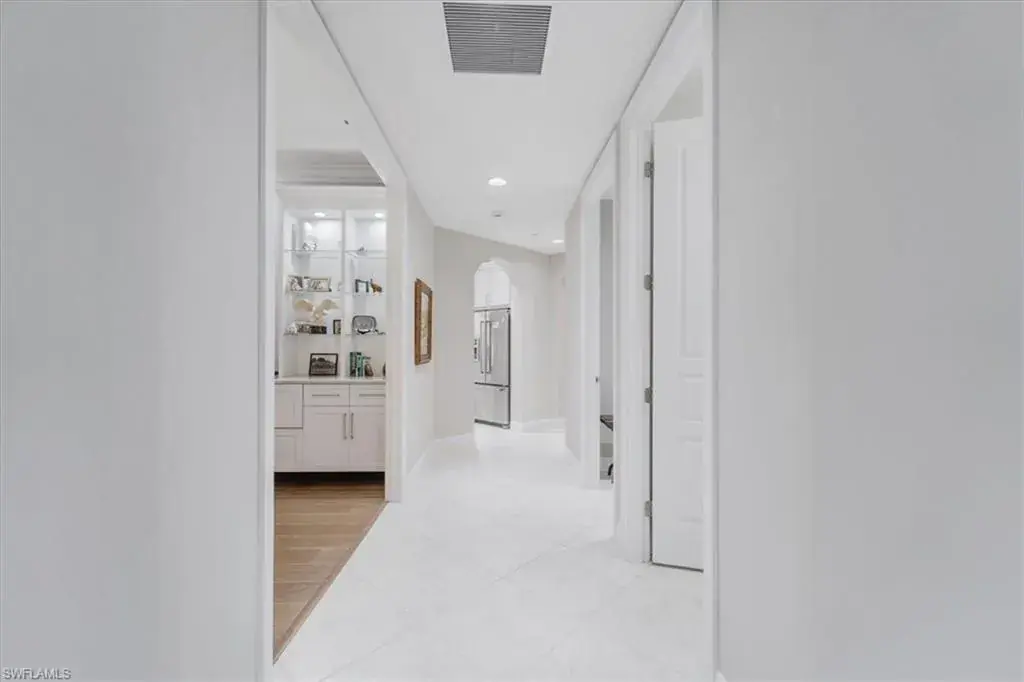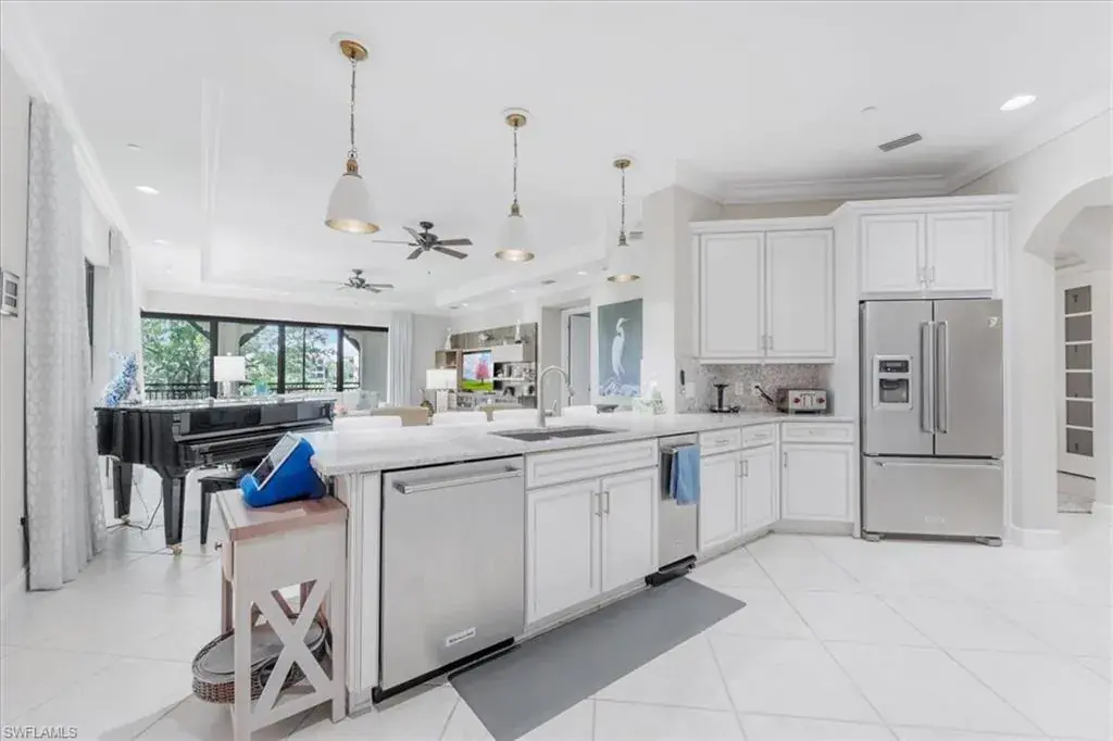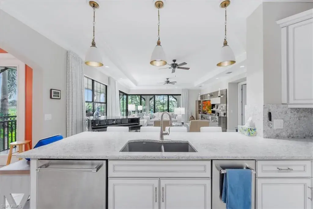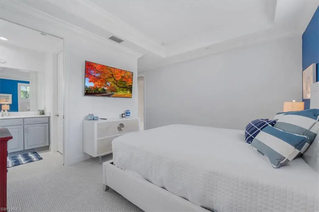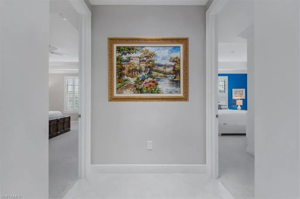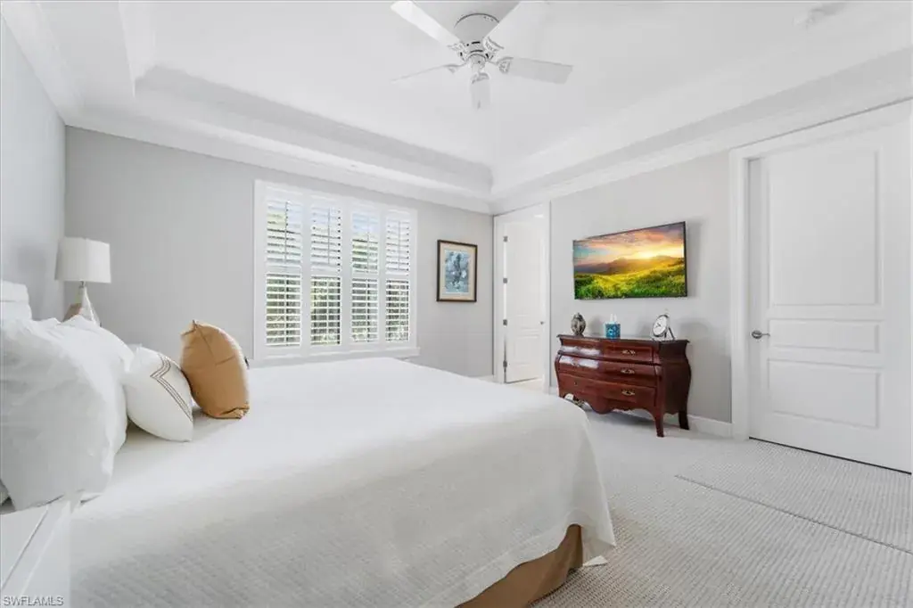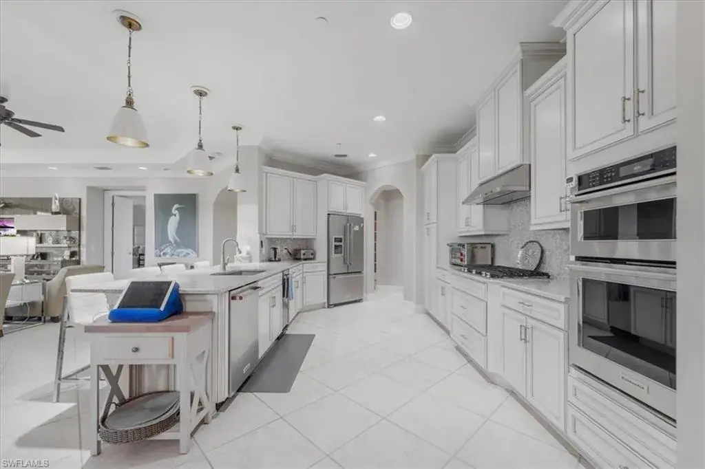 Luxury Living, Immaculate & Classy describes this End Unit Penthouse with elevator, located in the Prestigious Talis Park Community, if you’re Watching this house? The Seller is not dropping the Price…. Come get it now!! IMMEDIATE FULL GOLF MEMBERSHIP AVAILABLE SKIP THE WAIT LIST with this unit!!, this WCI built unit offers the most stunning spectacular south facing lake view of four golf holes fairway & greens on the Championship Pete Dye / Greg Norman designed Golf Course. This resort style property will exceed your expectations with all the amenities that are available. Entering this home, you are taken with the very spacious open entertaining floor plan, tray ceilings, high-end finishes, furnishings, plantation shutters & window draperies, deluxe upgraded molding package throughout, large quartz island breakfast bar white shaker cabinet kitchen offers stainless steel KitchenAid appliances, gas stove, compactor, commercial grade hood, pantry, recessed lighting & a dinette area with a serving station complete with refrigerator & wine cooler, the main family room offers a tray ceiling, porcelain tile floors, recessed lighting, large custom built in wall unit & 90 degree sliding impact glass doors that open up to your amazing wrap around screened balcony view with 8 electric Storm Smart roll down shutters for all your storm protection & entertaining needs, the den / office includes double French doors, tile wood plank flooring, all custom made cabinetry, glass book cases, quartz tops & includes all modern technology, there is also a screened balcony with new Storm Smart roll down shutters, down the hall there is a half bath, laundry room & two nicely appointed ensuite guest bedrooms with New high-end Berber carpeting, crown moldings & walk in closets, the main suite offers a tray ceiling, sliders out to the private lanai, tile wood plank flooring, large custom built in California walk in closet, the main bath offers a large quartz double vanity top, soaking tub, tiled walk in shower & a private lavatory, this property has a New A/C System 2025, tankless hot water heater for endless hot water demands, garbage chute, two assigned parking spaces & a storage area in the parking garage, non-flood zone location, close to I-75, 20 minutes to the airport, & the upscale shopping & night life in Naples. This is a must-see property for all the amenities, features, location & the Exclusive Luxury Florida Lifestyle.