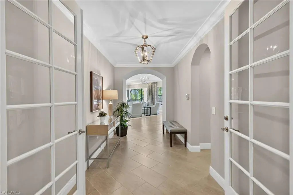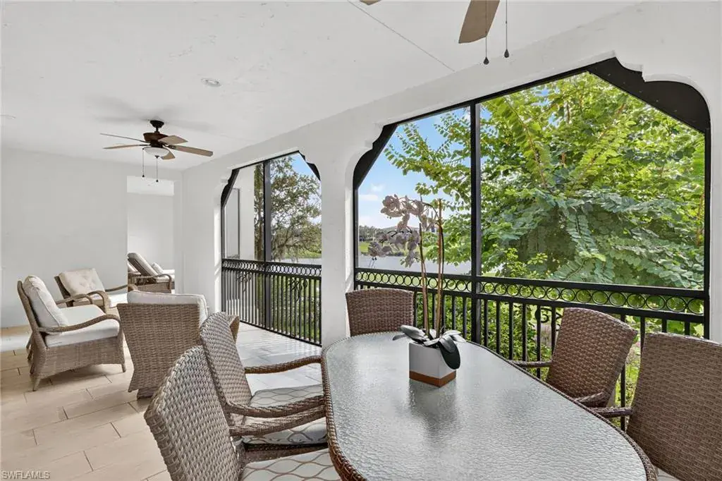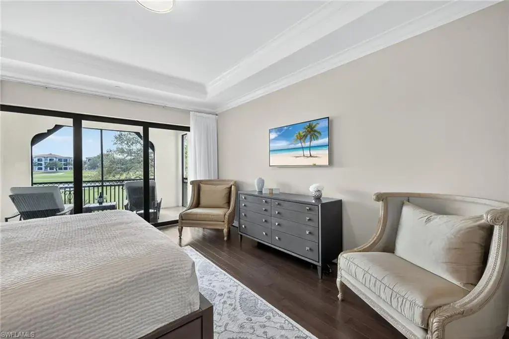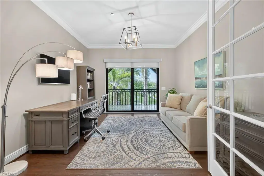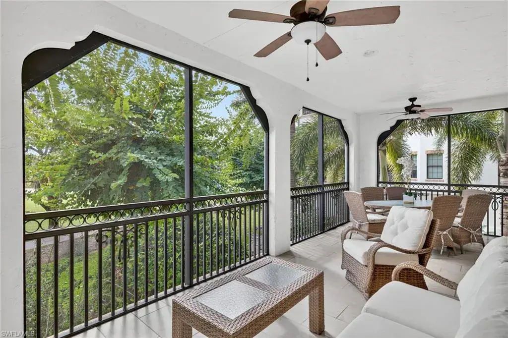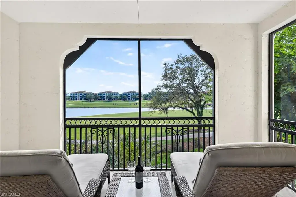 IMMEDIATE GOLF MEMBERSHIP AVAILABLE AT CLOSING! Skip the waitlist and start enjoying the award winning Greg Norman/Pete Dye designed course at TALIS PARK! This captivating TURNKEY condominium features a GOLF COURSE VIEW overlooking holes #4, #3 and #2 and the sparkling lake, a timeless primary suite with hardwood floors in the bedroom and in the custom closet, dual sinks, a bathtub and separate large shower. The captivating great room is impeccably decorated in a neutral decor which blends seamlessly with the soft white cabinetry in the chef inspired kitchen. A natural gas cooktop is a bonus as is the built in bar with both a wine and beverage refrigerator. Two ensuite guest rooms, a den/office with warm hardwood floors/private screened balcony and a lovely powder room combine for a condominium that lives like a true home with 2950 SF of air conditioned living space! The 700 SF wraparound screened loggia can be accessed from the corner sliding doors in the great room, the kitchen or the primary bedroom creating a perfect place to bring the outdoors inside while entertaining a group, dining al fresco or enjoying your morning coffee! An additional storage room in the garage is fitted with a dehumidifier. Two deeded garage parking places are also included in this graceful “lock and leave” residence. Carrara residents and their guests have the use of the private pool on the street and the grill area. In addition to the spectacular golf course, Talis Park residents enjoy the award winning clubhouse (formal and informal dining), Fiona’s casual dining with a pizza oven, the Casa Cortese at the practice range with an outdoor bar and indoor golf simulator, fitness center, spa, bocce, pickleball, tennis, two dog parks, a large community pool, playground and peaceful walking/running paths. The expansive social calendar is sure to impress with something for everyone. Located between Olde Naples and RSW Airport, it’s a premier locale. Shopping, dining and beaches are also in close proximity.