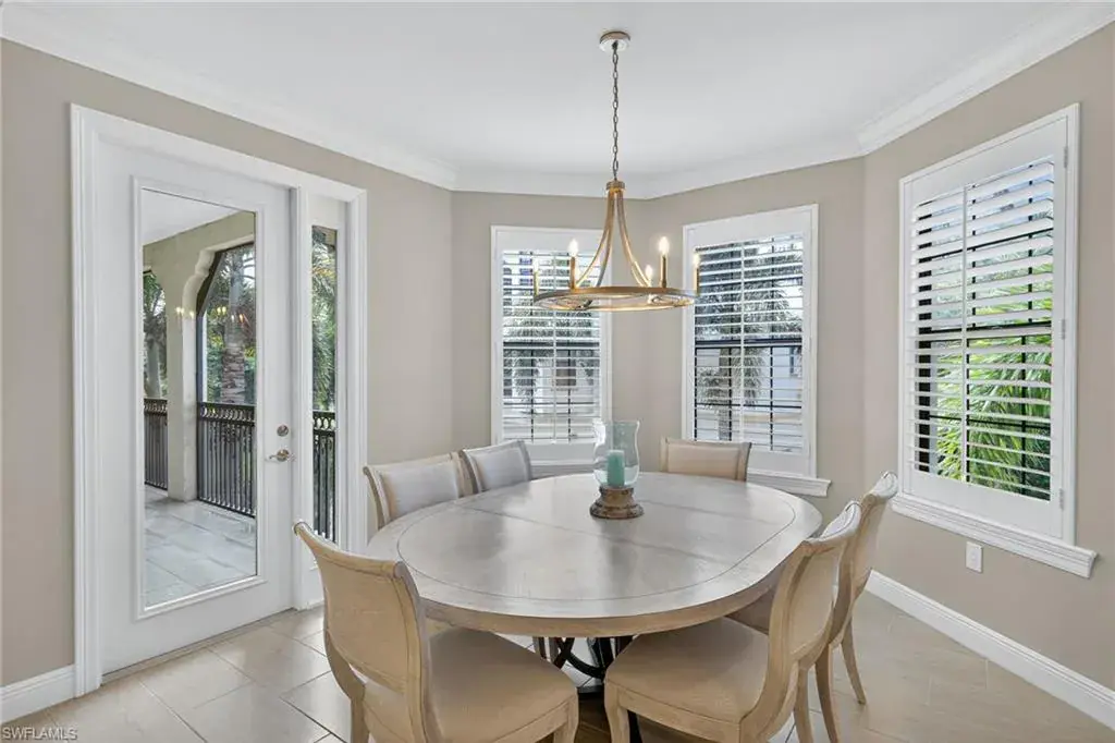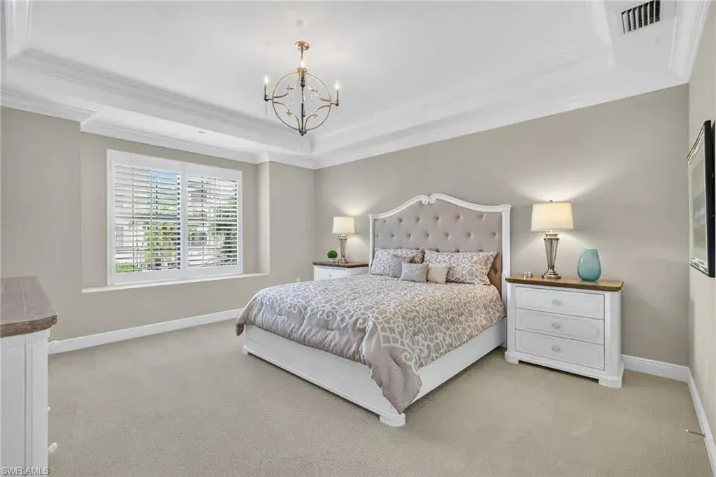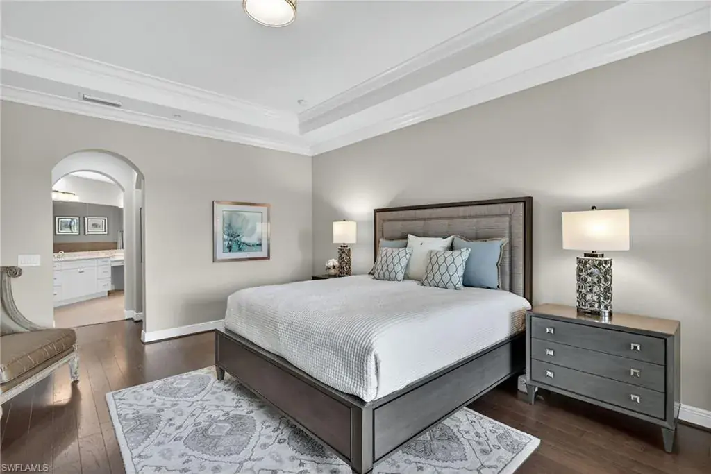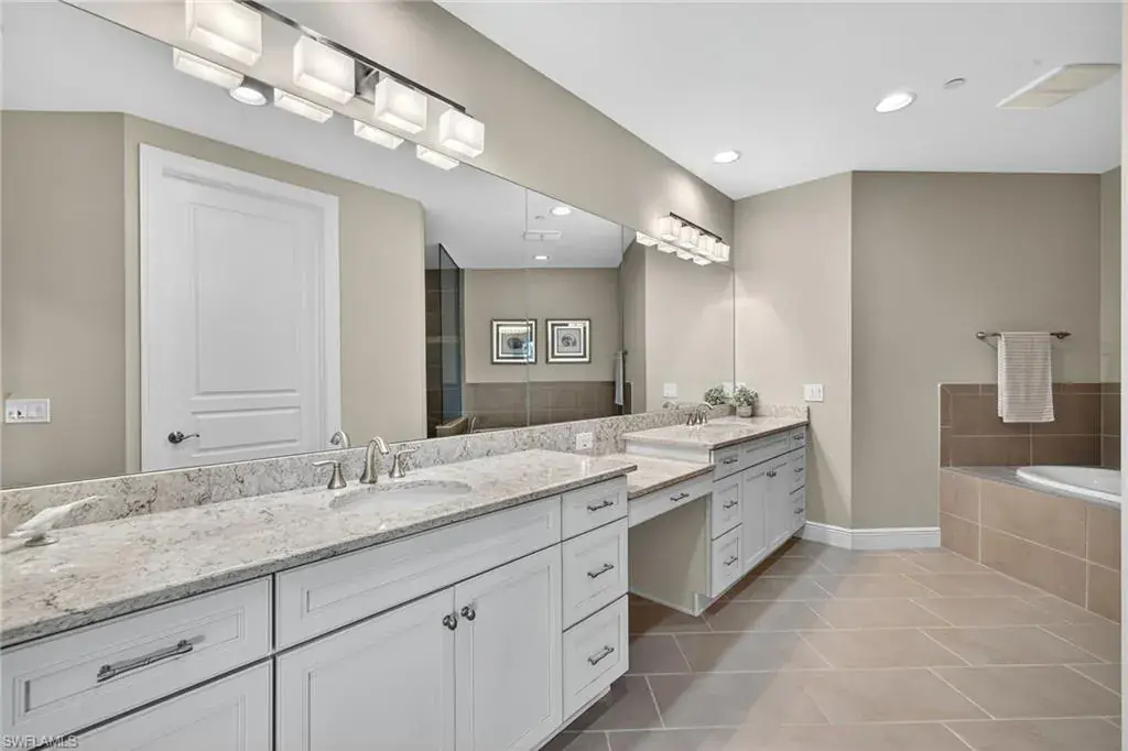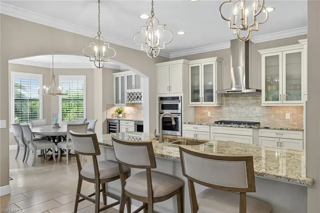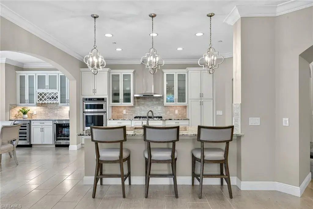 IMMEDIATE GOLF MEMBERSHIP AVAILABLE AT CLOSING! Skip the waitlist and start enjoying the award winning Greg Norman/Pete Dye designed course at TALIS PARK! This captivating TURNKEY condominium features a GOLF COURSE VIEW overlooking holes #4, #3 and #2 and the sparkling lake, a timeless primary suite with hardwood floors in the bedroom and in the custom closet, dual sinks, a bathtub and separate large shower. The captivating great room is impeccably decorated in a neutral decor which blends seamlessly with the soft white cabinetry in the chef inspired kitchen. A natural gas cooktop is a bonus as is the built in bar with both a wine and beverage refrigerator. Two ensuite guest rooms, a den/office with warm hardwood floors/private screened balcony and a lovely powder room combine for a condominium that lives like a true home with 2950 SF of air conditioned living space! The 700 SF wraparound screened loggia can be accessed from the corner sliding doors in the great room, the kitchen or the primary bedroom creating a perfect place to bring the outdoors inside while entertaining a group, dining al fresco or enjoying your morning coffee! An additional storage room in the garage is fitted with a dehumidifier. Two deeded garage parking places are also included in this graceful “lock and leave” residence. Carrara residents and their guests have the use of the private pool on the street and the grill area. In addition to the spectacular golf course, Talis Park residents enjoy the award winning clubhouse (formal and informal dining), Fiona’s casual dining with a pizza oven, the Casa Cortese at the practice range with an outdoor bar and indoor golf simulator, fitness center, spa, bocce, pickleball, tennis, two dog parks, a large community pool, playground and peaceful walking/running paths. The expansive social calendar is sure to impress with something for everyone. Located between Olde Naples and RSW Airport, it’s a premier locale. Shopping, dining and beaches are also in close proximity.
