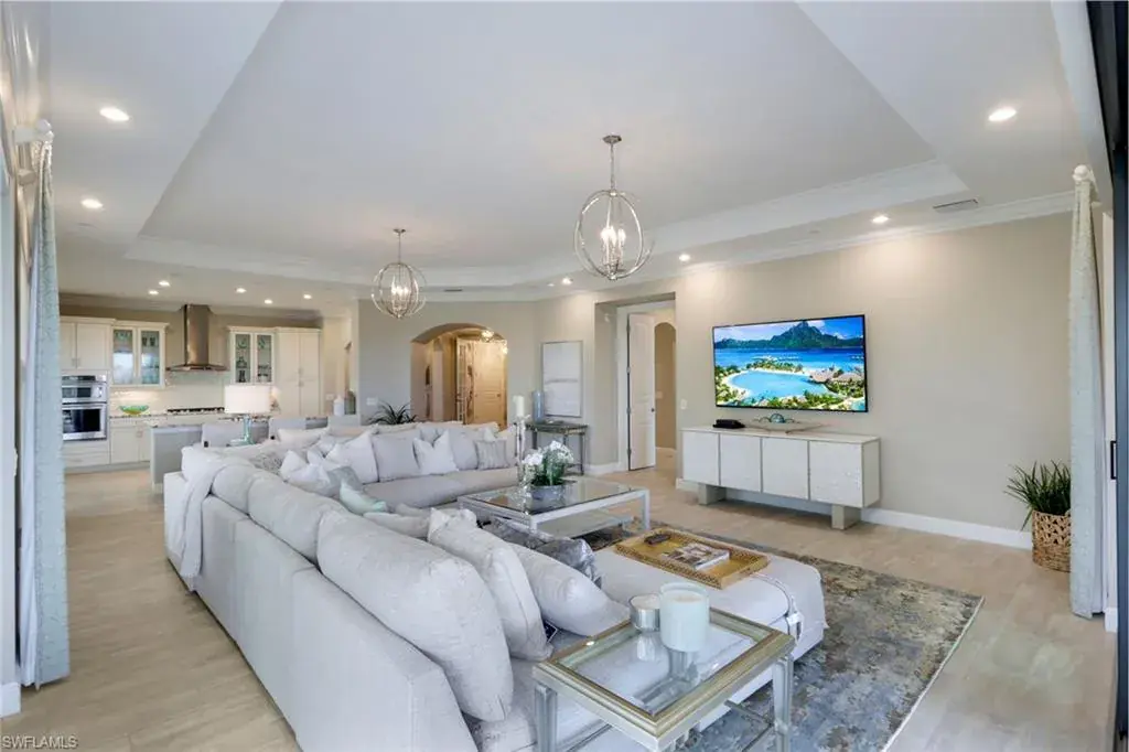 Well appointed “Penthouse” condo with furnishings negotiable. Gorgeous lake views and sunsets from your wrap around loggia area and primary bedroom. These units live like a single-family home with 2,950 square feet under air, 3 beds + den and 3 & 1/2 baths. Modern organic interior with rich neutral palate. Upgrades and features include quartz countertops, new LED recessed lights and fans, built in fridge, glass faced cabinets, dry bar with wine and beverage cooler, natural gas cooking range! Conveniently located within walking distance to the mailboxes, Carrara private pool, spa, grill area, driving range, and Casa Cortese. Two assigned parking spots on ground floor with additional private storage space. Club House (voted Clubhouse of the year 2016 by Golf Inc. Magazine!) “Vyne House” offers Core Fitness Center & Esprit Spa plus Fiona’s Market Café! The recently renovated golf course was designed by Greg Norman and Pete Dye and is ranked by Golf Digest as one of Florida’s top 20 courses. Tennis, Pickleball and Bocce courts!