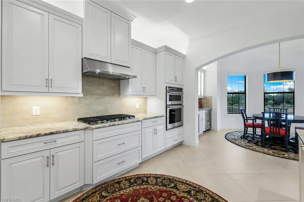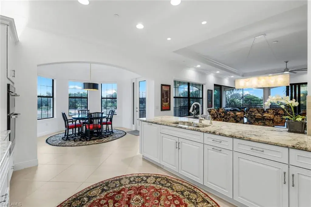 The kitchen opens to a sunlit eat-in nook surrounded by windows, perfect for casual meals or morning coffee. Built into the nook, a custom wine and beverage center offers generous storage for bottles, sleek countertops, and lighted upper cabinetry for display and organization—blending style and practicality for entertaining or everyday enjoyment.