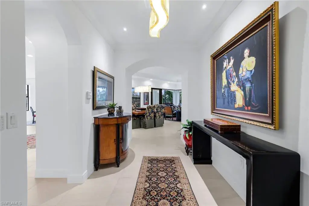 Step into this exclusive penthouse overlooking the first hole and cascading waterfalls in the Carrara enclave of Talis Park, where timeless design and refined upgrades create a sense of private serenity. Soaring ceilings, tile flooring throughout, designer lighting, and zero-corner sliders set the tone for seamless indoor-outdoor living, filling the home with light and calm.