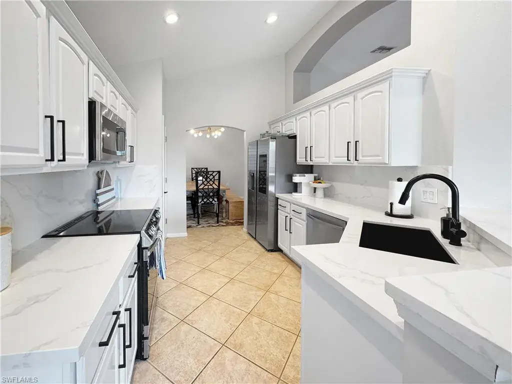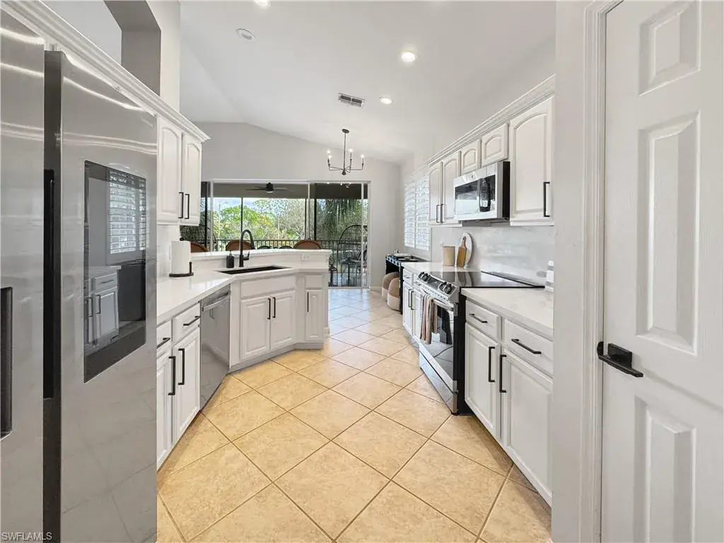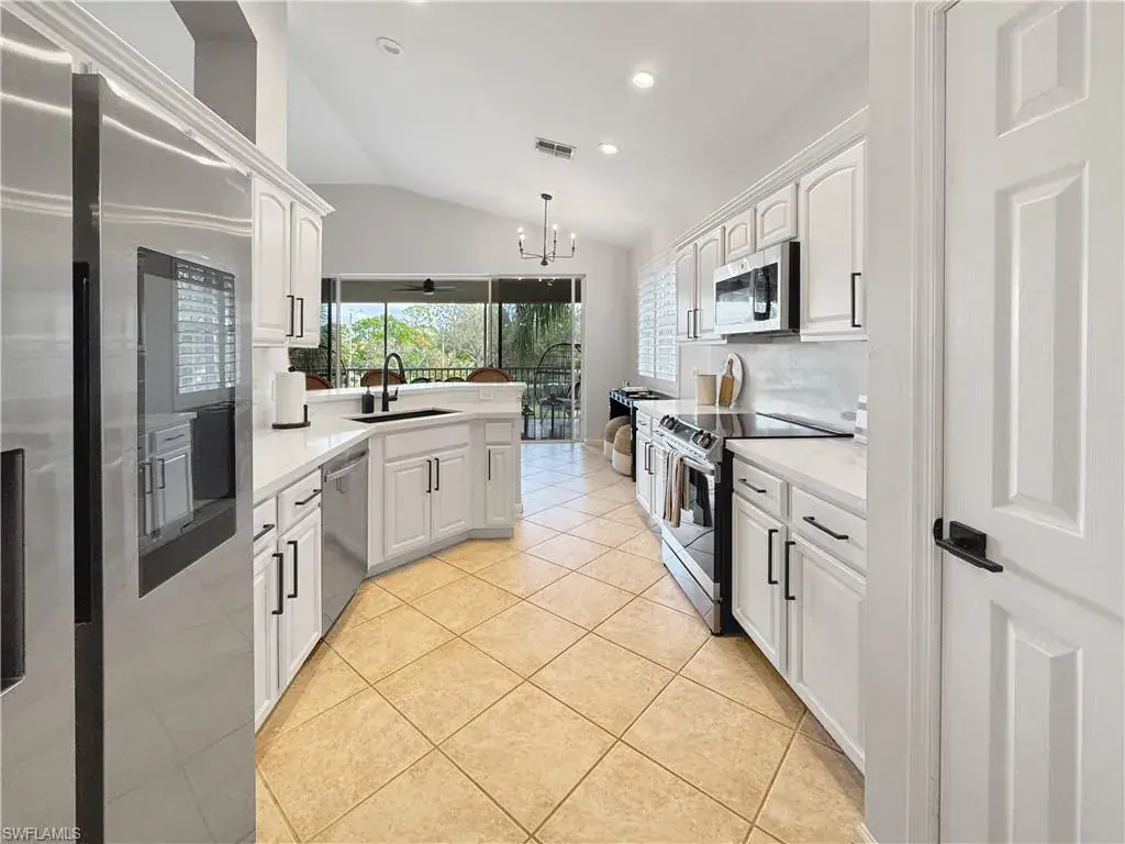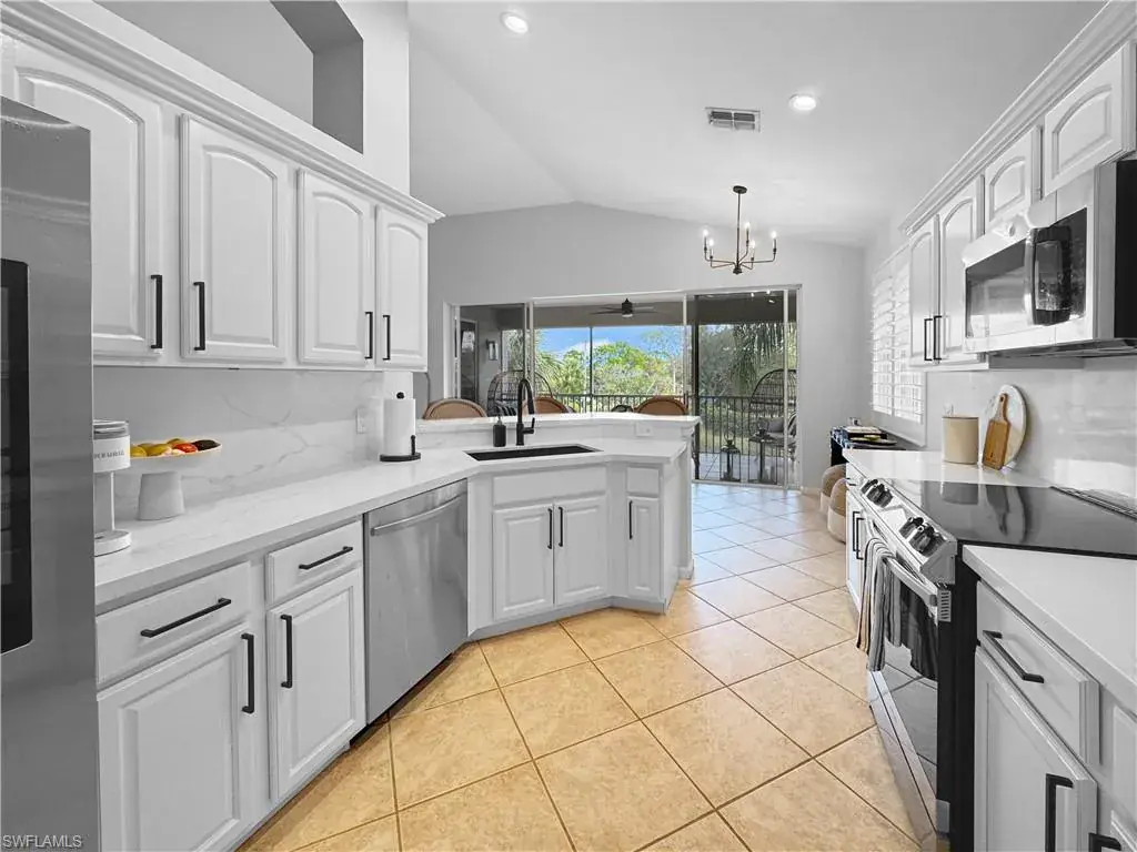 Step inside to discover an inviting open floor plan accentuated by vaulted ceilings, creating an airy and spacious atmosphere. The living room flows seamlessly into a beautifully updated kitchen, where modern elegance meets functionality. Enjoy cooking on sleek quartz countertops, complemented by new stainless-steel appliances and fixtures that promise durability and style. This space is perfect for hosting gatherings or enjoying a quiet dinner with your loved ones.