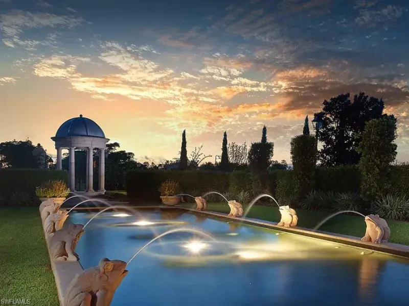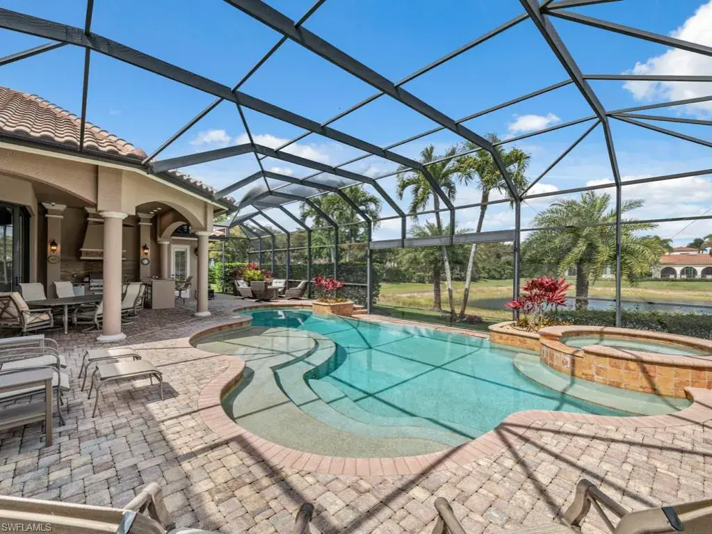 Located in the prestigious golf and country club community of Mediterra in Naples, Florida – Newly renovated private beach club – Nestled on a premium corner lot, this exquisite residence built by Bordeaux Homes boasts a grand circular paver driveway leading to an elegant, inspired facade. Step through the ornate double doors into a breathtaking foyer entry, where coffered tray and cathedral ceilings, arched passages, and generous windows create an impressive ambiance. The formal living room features a custom fireplace, exquisite millwork, and panoramic views of the outdoor oasis, while the formal dining room is perfect for elegant gatherings. A custom wet bar with a built-in wine rack enhances the home’s entertaining potential, complemented by a breakfast nook with serene outdoor views. The premium chef’s kitchen is a culinary masterpiece with top-of-the-line appliances, a large center island, stone countertops, a decorative range hood, and abundant storage. Adjacent to the kitchen, the spacious family room seamlessly integrates indoor-outdoor living with floor-to-ceiling glass sliding doors leading to the lanai. A private den/office offers a peaceful workspace with rich wood flooring. The expansive primary suite is a luxurious retreat featuring a sitting area, private outdoor access, a custom walk-in closet, and a spa-like en-suite bath with a separate jetted tub and shower, dual vanities, and elegant finishes. Three well-appointed guest bedrooms provide comfort and privacy, with generous closet space and stylish bathrooms. The resort-style lanai is an entertainer’s dream, boasting a fully equipped summer kitchen, covered dining area, and ample lounge space. A lagoon-style pool and spa create a serene retreat while enjoying breathtaking lake views. Additional features include a three-car garage and impact doors & windows. Mediterra is a prestigious luxury golf & country club community featuring Two championship Tom-Fazio golf courses for avid golfers, multiple tennis courts, pickle-ball & bocce, fitness center, pristine bike & jogging trails, and luxurious dining at the private country club restaurant. The Mediterra Beach Club offers an escape to a 10,000 sq. ft two-story private oceanfront paradise on the Gulf of Mexico. Featuring a restaurant & bar that serves members via indoor & outdoor dining, this private facility boasts a heated swimming pool, a sundeck, and cabana beach service for chairs, umbrellas & refreshments.