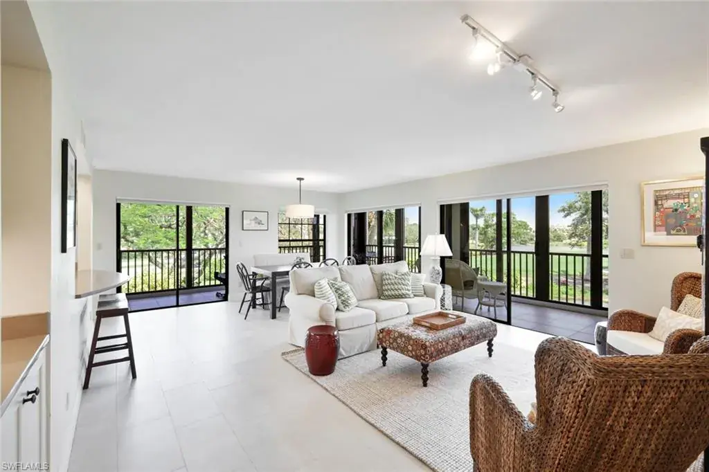 ** MAGNIFICENT LONG LAKE & GOLF COURSE VIEWS…COMPLETE RENOVATION…PRICELESS PRIVACY ** Sophistication and elegance best describe this Pelican Bay gem. Gorgeous corner residence with wide open vistas at every vantage point and a Coastal palette that perfectly complements the light and bright surroundings…timeless beauty. Fully renovated, 12×24 tile throughout the interior, custom cabinetry and doors, custom storage throughout. Open floor plan, great separation of bedrooms for maximum privacy, amazing wrap-around glassed/screened lanai. IMPACT RATED WINDOWS & DOORS SURROUND THIS ENTIRE UNIT…and not one window opens onto common areas…terrific security and privacy. Turnkey Furnished (literally everything is included!) – Absolute move-in ready condition! The deeded under-building parking space is truly one of the premier parking spaces at Chateaumere…easy access, because the space is not bordered on both sides by columns. Chateaumere offers a truly walkable lifestyle – exceptionally unique in Pelican Bay: walk to the Pelican Bay Commons and tram shuttle, Waterside Shops, restaurants and Artis-Naples philharmonic and art center.