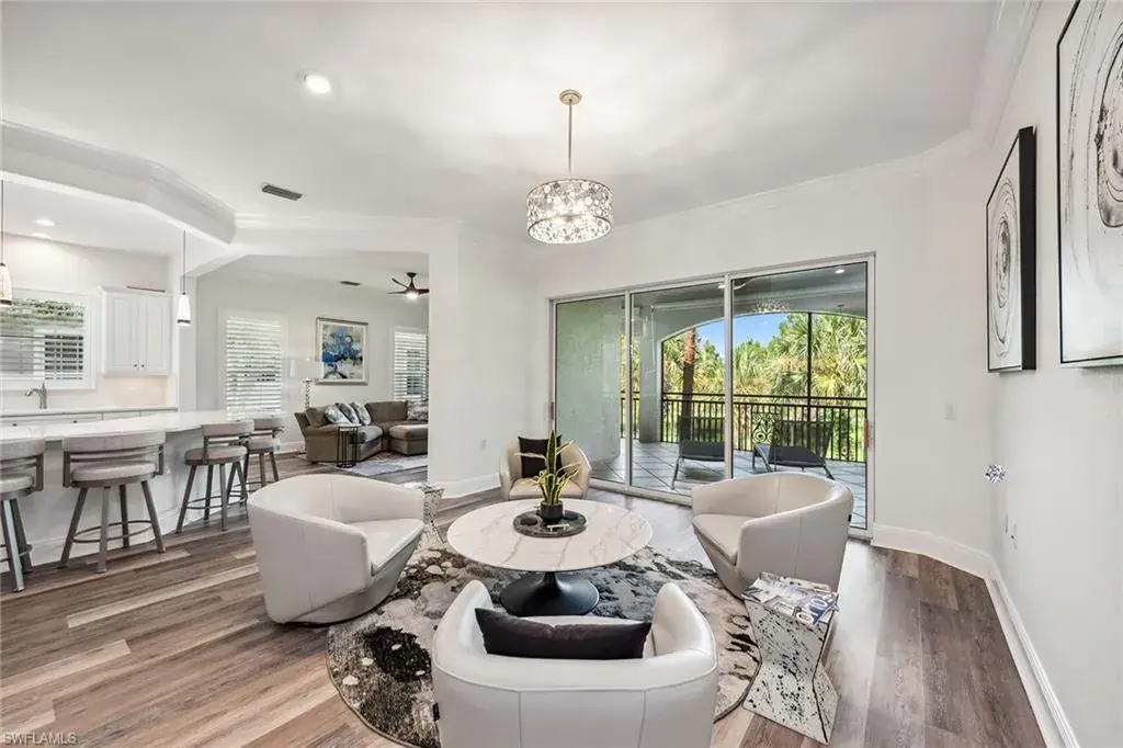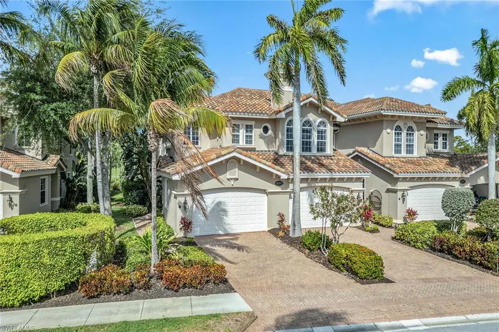 Beautiful sunset golf course views in the award-winning community of Fiddler’s Creek. This exquisite second-floor condominium has over $125,000 in upgrades, is accessible via private elevator, offers three bedrooms, a den and three baths spanning over 3,000 square feet. The exterior boasts a durable tile roof, paver driveway and walkway, and a two-car garage, enhanced with built-in storage. Upon entering, you are greeted by a soaring two-story ceiling in the foyer, offering a choice between a stately wooden staircase with iron railing or the convenience of a private elevator to ascend to the main floor. Here, the open great room, dining and kitchen area are adorned with crown molding, updated lighting and fans, arched doorways, plantation shutters and luxury vinyl plank floors that extend throughout. The newly remodeled kitchen is a culinary masterpiece equipped with a five-burner gas cooktop, white modern cabinets illuminated by under-cabinet lighting, quartz countertops, French door walk-in pantry and a large center island featuring a built-in wine cooler. The adjacent living room showcases natural light from a glass slider granting access to the covered and screened-in lanai with roll-down shades, modern fans, and offering stunning views of the golf course and mature landscaping. Enter the owner’s suite through French doors to discover hardwood floors, arched windows, two walk-in closets and private access to the lanai. Its en-suite bath boasts dual vanities, a makeup counter, linen closet, walk-in shower, and a separate soaker tub. Two additional bedrooms, each with plush carpet floors and their own en-suite baths, ensure privacy and comfort for family and guests alike. Other notables are a versatile den with hardwood floors, ample white shaker-style cabinets in the laundry room, tankless gas water heater and a video security system. Residents of Fiddler’s Creek enjoy access to luxurious amenities, including championship golf, fitness center, tennis, pickleball, bocce, full-service spa, sauna, casual and fine dining, and a resort-style pool. Golf, beach and marina memberships available. Ideally between downtown Naples and the pristine beaches of Marco Island. Don’t miss this opportunity!