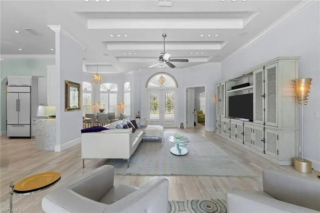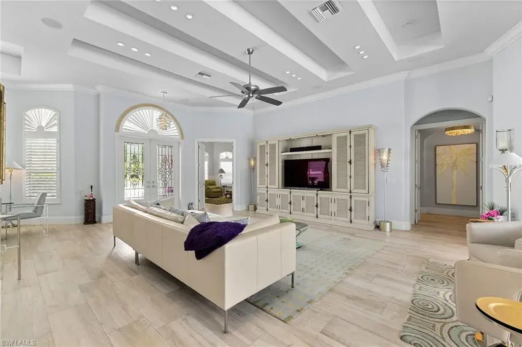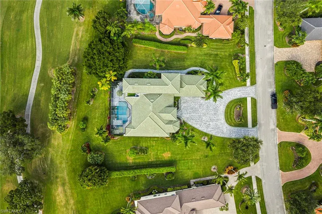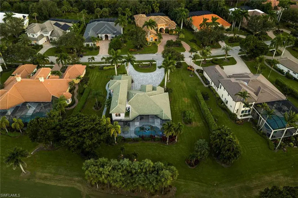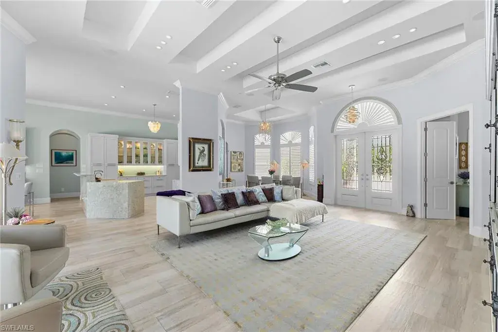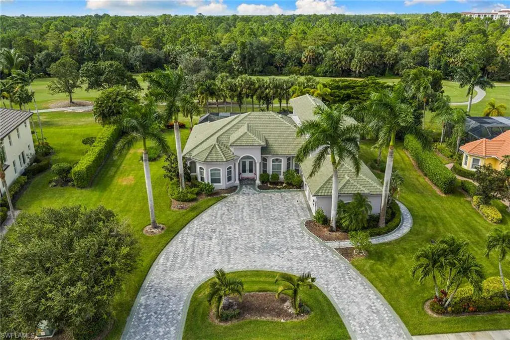 Enjoy elegance at its finest in this custom-built estate home on a quiet cul-de-sac within The Classics neighborhood, a gated, 24-hour security-protected community, in Lely Resort. On one of the largest lots in the neighborhood, this home features a grand circular driveway with abundant parking for guests. French beveled glass doors invite entry into a light-filled open floor plan with soaring 14-foot ceilings, custom crown molding, chandeliers, and plantation shutters with Sunburst arches that create an atmosphere of timeless sophistication. The ambiance of the bright Florida Coastal design (2015 complete house renovation) blends luxury and livability with views of the lanai, pool, palm trees and 17th Fairway of The Classics Golf Club. The kitchen showcases quartz waterfall counters, glass-tile backsplash, custom cabinetry, Wolf dual-range stove/oven, Sub-Zero refrigerator, Bosch dishwasher, two built-in pantries, a Butler’s Nook, and new Ca’Lefort wine cooler. A versatile upstairs, enhanced throughout with new carpeting, introduces a double owner’s suite including a fourth bedroom (used as an office), a full bath, walk-in closet, spacious sitting/game room and private balcony. Two first-floor guest en suites include built-in cabinetry with custom storage, while the primary suite serves as a retreat, featuring crown molding, a soaking tub, a large shower with body jets and a custom Carrera-tile double vanity. The screened lanai offers a private sanctuary featuring a gas-heated pool and spa, lush landscaping, and multiple seating areas ideal for quiet relaxation or entertaining (with 15 in-ceiling speakers ready for surround sound and multi-room zone audio). Upgrades in 2020 include a new roof, new driveway and walkway pavers, new lanai deck, and new pool and spa resurfacing. Membership opportunities abound, with no waitlist at The Classics Golf Club, which offers access to three championship golf courses (two public, one private) and optional Players Club membership offering tennis, bocce, dining, wellness center, spa and three resort-style pools. This exceptional estate harmonizes luxury, lifestyle and location, a rare opportunity to experience the best of Lely Resort and Naples living.
