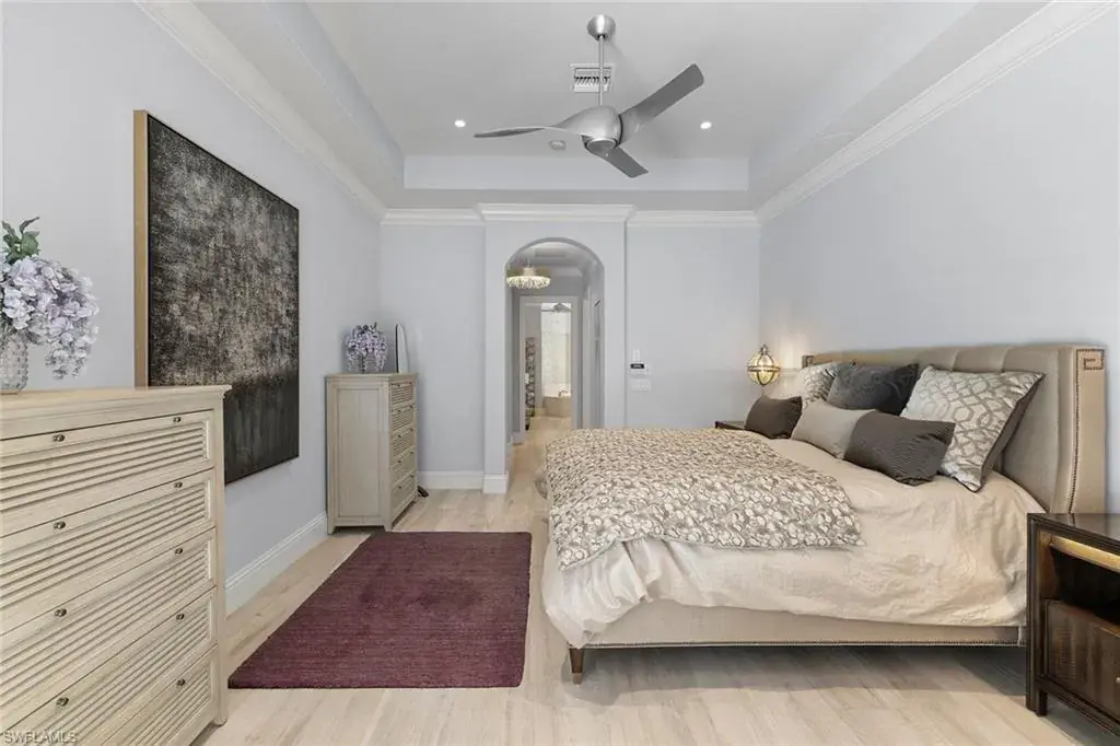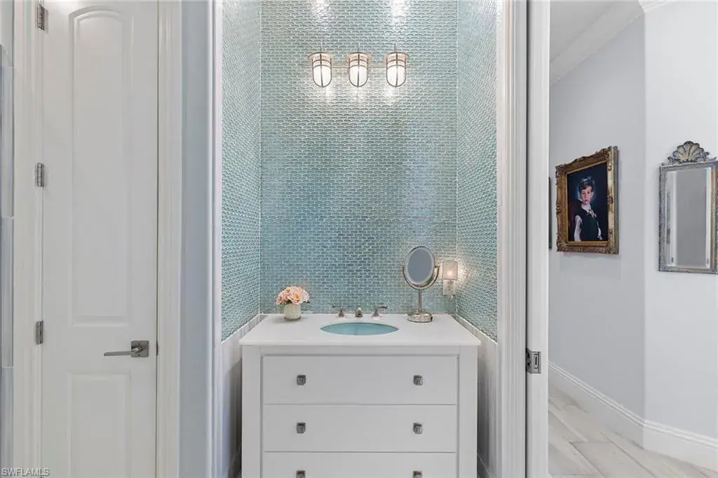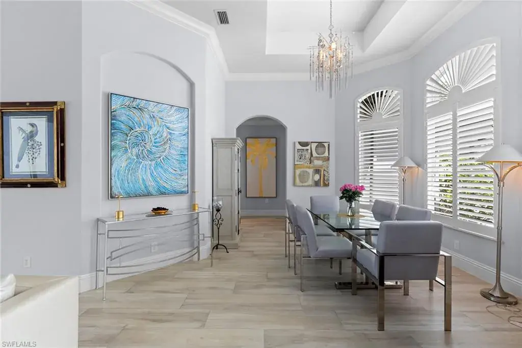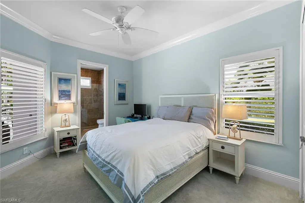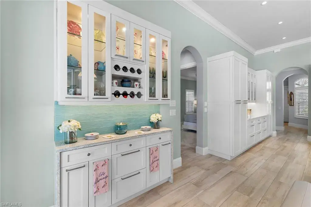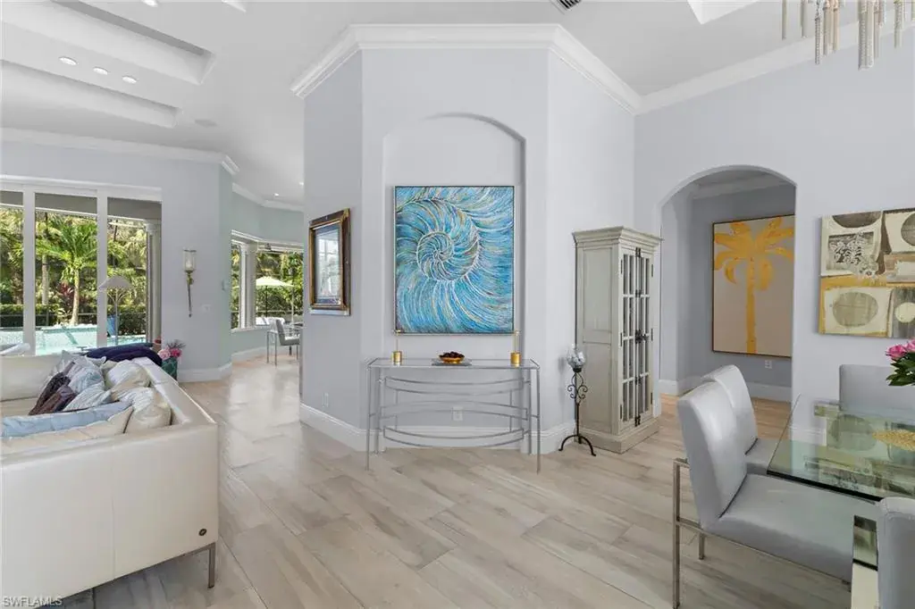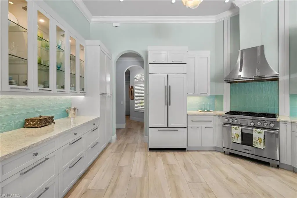 Enjoy elegance at its finest in this custom-built estate home on a quiet cul-de-sac within The Classics neighborhood, a gated, 24-hour security-protected community, in Lely Resort. On one of the largest lots in the neighborhood, this home features a grand circular driveway with abundant parking for guests. French beveled glass doors invite entry into a light-filled open floor plan with soaring 14-foot ceilings, custom crown molding, chandeliers, and plantation shutters with Sunburst arches that create an atmosphere of timeless sophistication. The ambiance of the bright Florida Coastal design (2015 complete house renovation) blends luxury and livability with views of the lanai, pool, palm trees and 17th Fairway of The Classics Golf Club. The kitchen showcases quartz waterfall counters, glass-tile backsplash, custom cabinetry, Wolf dual-range stove/oven, Sub-Zero refrigerator, Bosch dishwasher, two built-in pantries, a Butler’s Nook, and new Ca’Lefort wine cooler. A versatile upstairs, enhanced throughout with new carpeting, introduces a double owner’s suite including a fourth bedroom (used as an office), a full bath, walk-in closet, spacious sitting/game room and private balcony. Two first-floor guest en suites include built-in cabinetry with custom storage, while the primary suite serves as a retreat, featuring crown molding, a soaking tub, a large shower with body jets and a custom Carrera-tile double vanity. The screened lanai offers a private sanctuary featuring a gas-heated pool and spa, lush landscaping, and multiple seating areas ideal for quiet relaxation or entertaining (with 15 in-ceiling speakers ready for surround sound and multi-room zone audio). Upgrades in 2020 include a new roof, new driveway and walkway pavers, new lanai deck, and new pool and spa resurfacing. Membership opportunities abound, with no waitlist at The Classics Golf Club, which offers access to three championship golf courses (two public, one private) and optional Players Club membership offering tennis, bocce, dining, wellness center, spa and three resort-style pools. This exceptional estate harmonizes luxury, lifestyle and location, a rare opportunity to experience the best of Lely Resort and Naples living.