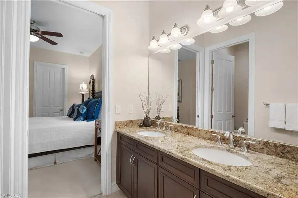 The primary suite is a private retreat with lanai and pool access, dual walk-in closets, and a luxurious en-suite bath with granite-topped dual vanities, a large glass-enclosed shower, and a separate linen closet for extra storage.