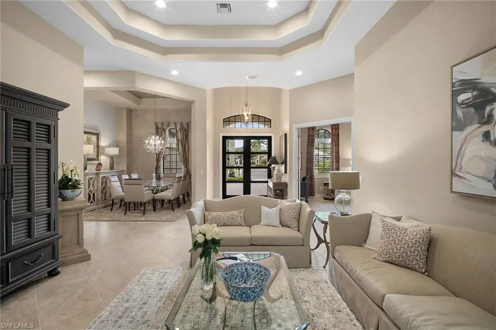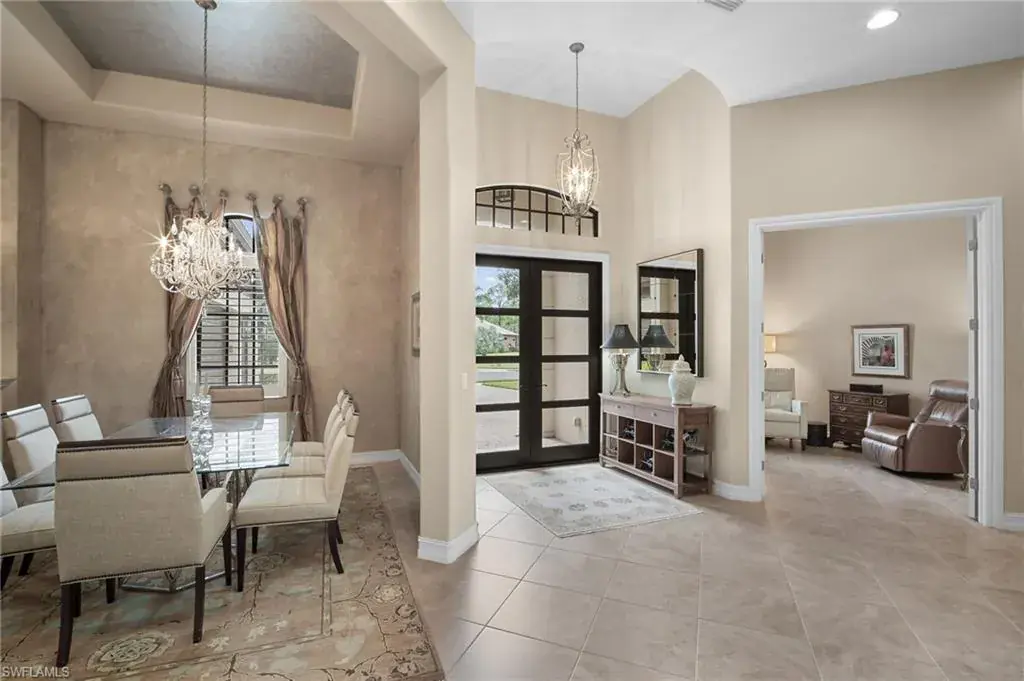 From the moment you step through the custom iron and glass French doors, you are greeted by soaring 14-foot dual tray ceilings and diagonally laid tile floors that set the tone for the home’s gracious design. The open-concept layout flows seamlessly through the main living areas, filled with natural light from the ten-foot glass doors that open to an extended lanai overlooking the 14th hole of the renowned Classics golf course.