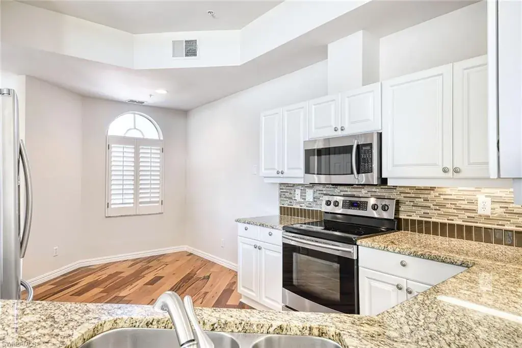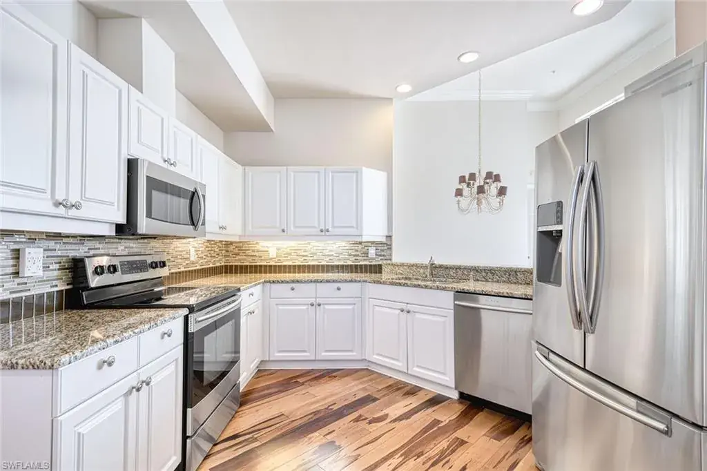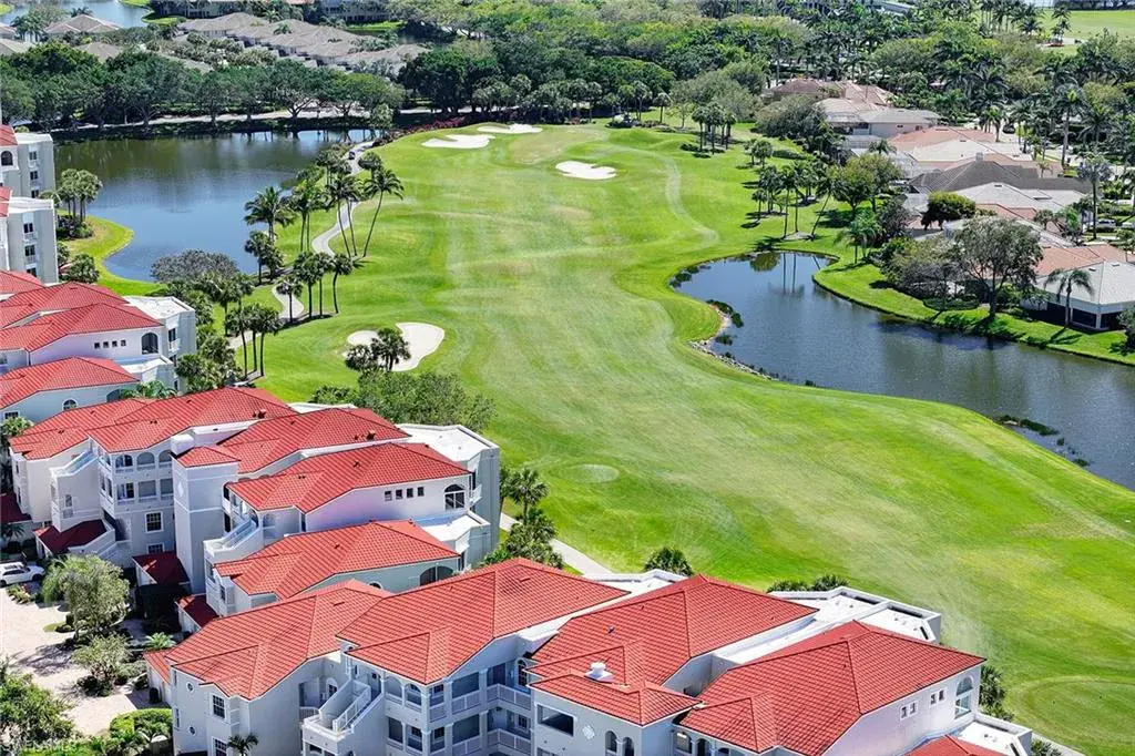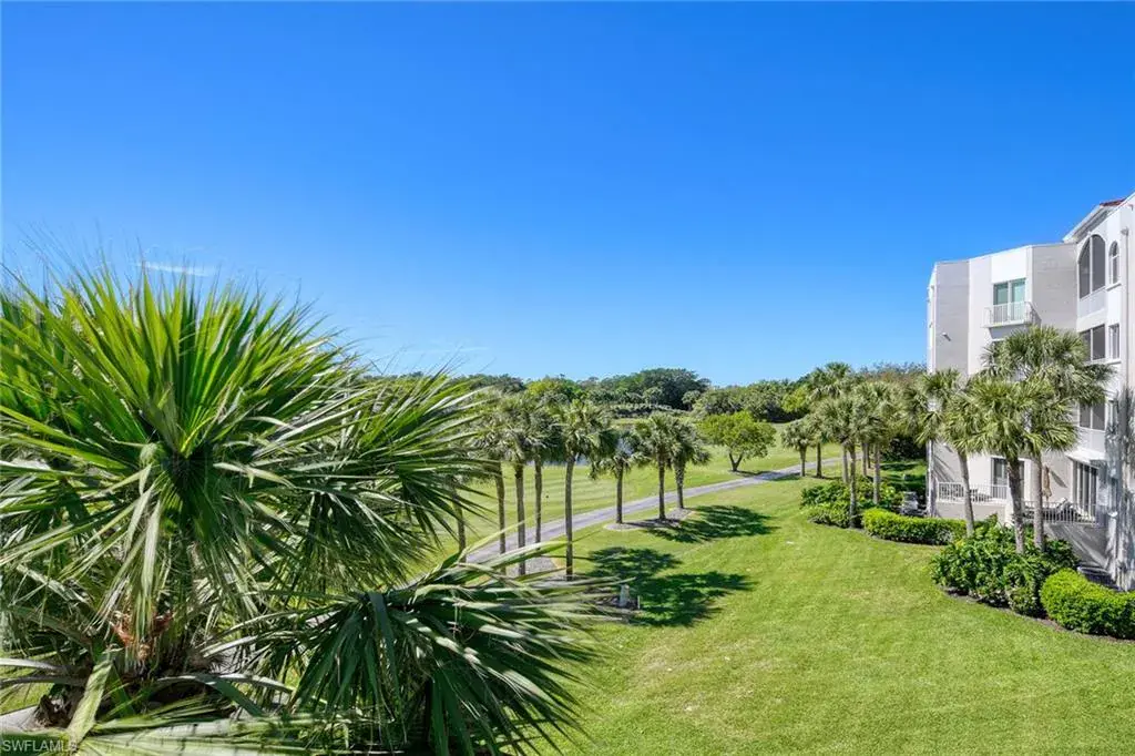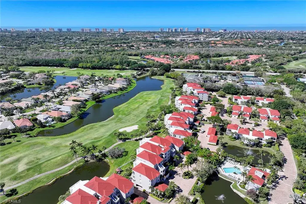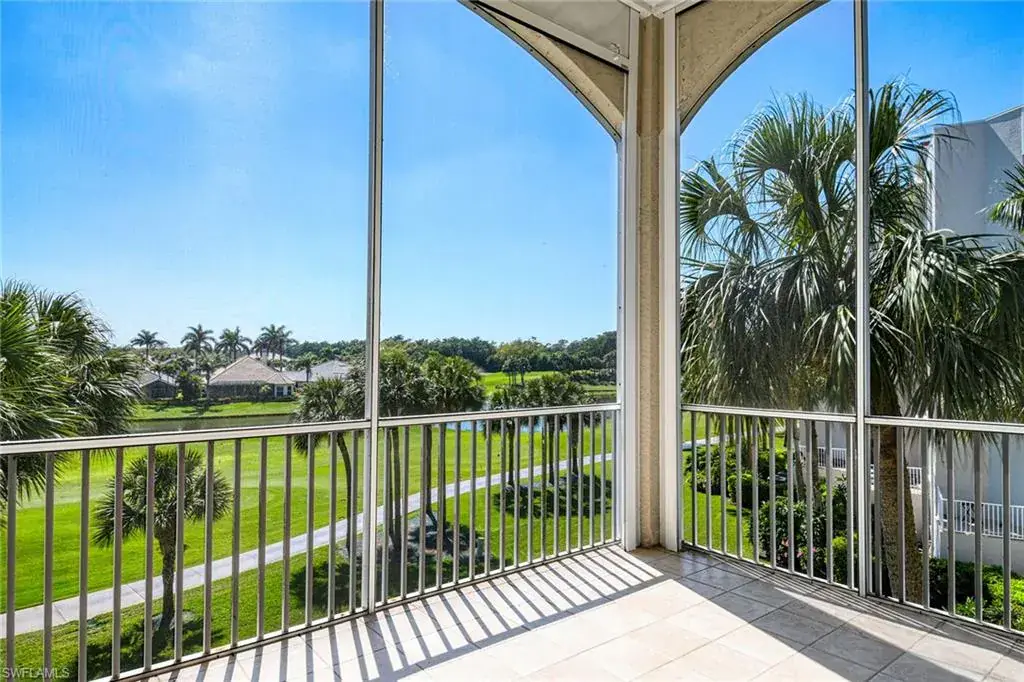 Enjoy breathtaking golf course and lake views from this spacious third-floor condominium in Pelican Marsh. Soaring vaulted ceilings and rich hardwood flooring enhance the open-concept design. The updated kitchen boasts white cabinetry, granite countertops, stainless steel appliances and a stylish backsplash. The primary suite features a cozy window nook, walk-in closet, private balcony access, and a spa-like bath with dual vanities, a soaking tub and a walk-in shower. Two guest bedrooms, a formal dining area, a dedicated laundry room and an attached garage add to the home’s appeal. In a sought-after community with resort-style amenities, including a clubhouse, fitness center, tennis courts and scenic walking trails. Move-in ready and designed for effortless Florida living. Explore acres of scenic paths through lush tropical landscapes and preserved natural areas. Pelican Marsh offers four gated access points, allowing quick and convenient access to upscale shopping, fine dining, The Mercato, Shoppes at Vanderbilt, Waterside Shops, Artis-Naples and beautiful beaches.