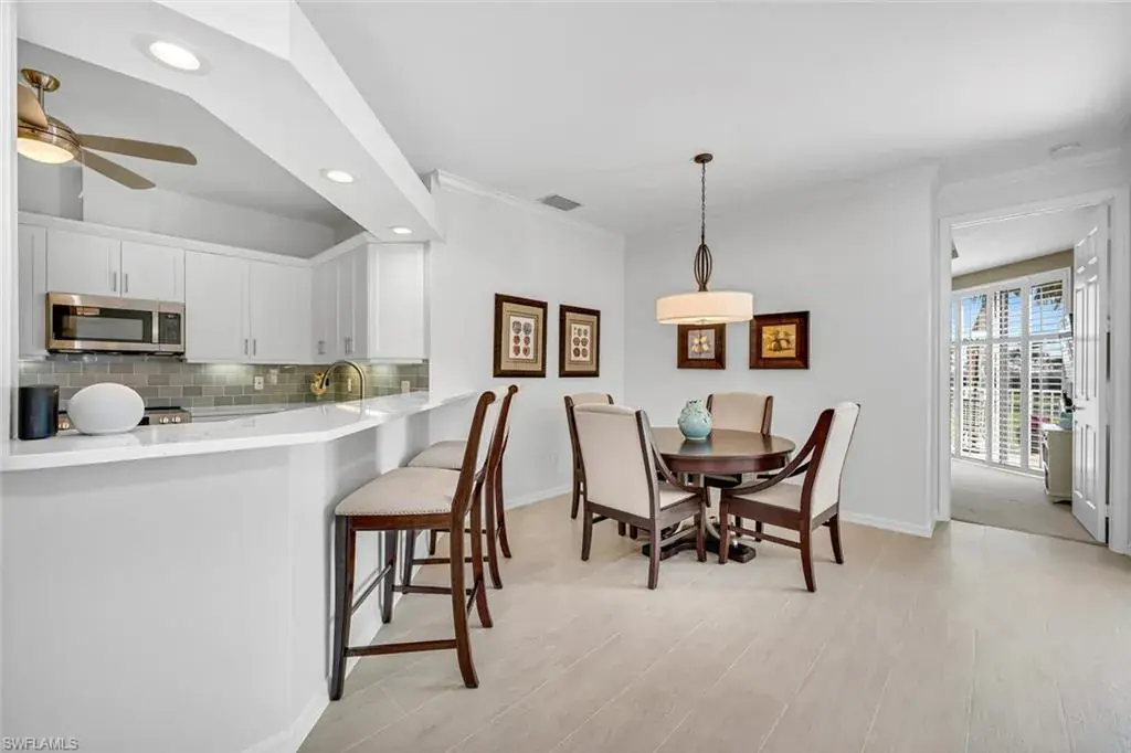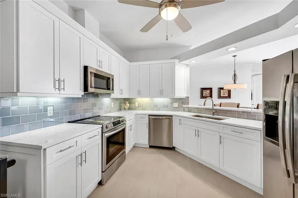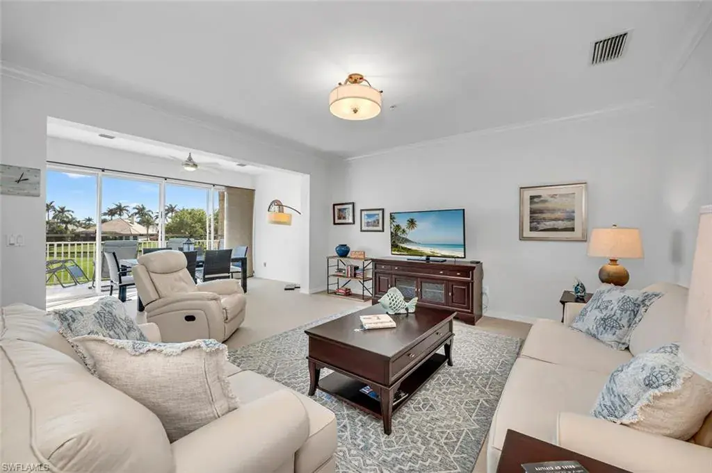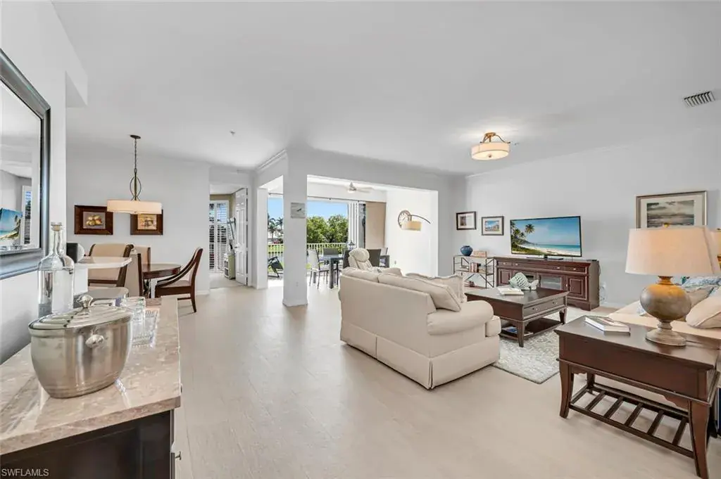 Enjoy breathtaking views of the 9th hole of the Pelican Marsh golf course and serene lake from your PRIVATE OUTDOOR TERRACE, making it a rare and desirable find. This beautifully renovated first-floor condo offers a luxurious lifestyle with three spacious bedrooms and an attached two-car garage.  The open floorplan flows seamlessly, featuring porcelain tile floors, and is perfect for entertaining family and friends.  The eat-in kitchen features quartz countertops, stainless steel appliances, decorative backsplash, pantry and a breakfast bar that opens to the great room.  The large master suite featuring tray ceiling, walk-in closet, golf course/lake views, and en-suite bath with a luxurious soaking tub, walk-in shower with beautiful tile, and modern cabinetry and fixtures.